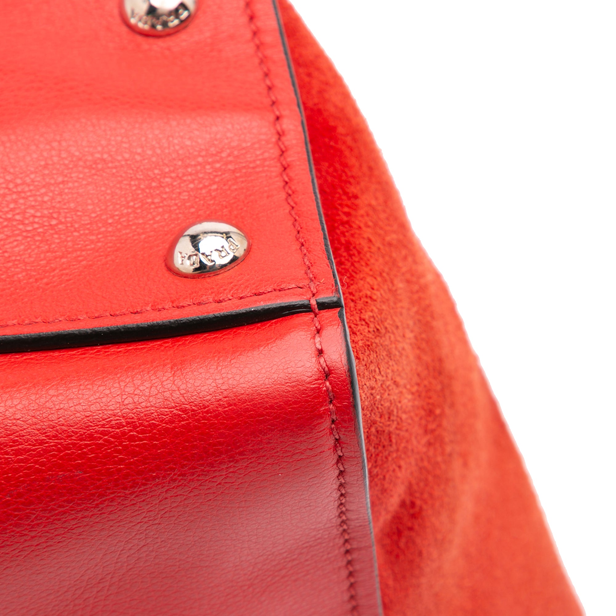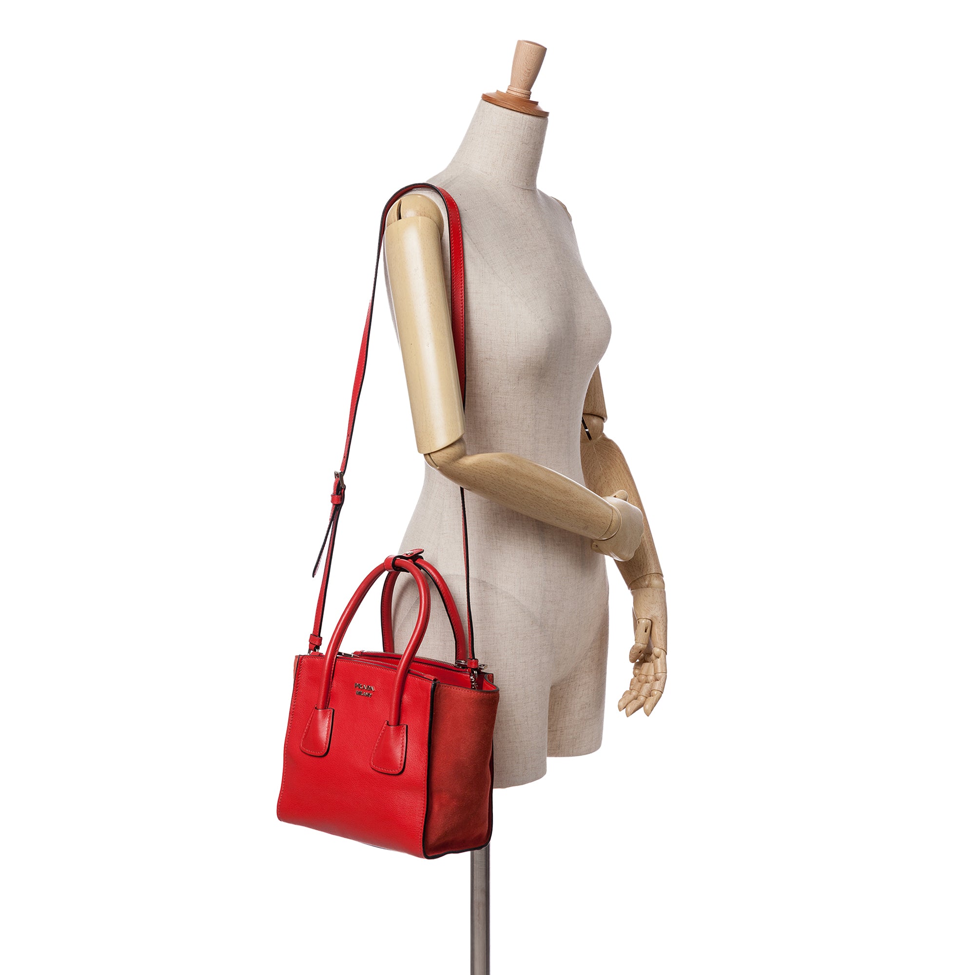 Product Details: Red Prada Small Glace Calf Twin Pocket Satchel. The Twin Pocket satchel features a calfskin body with suede leather trim, rolled leather handles, a detachable flat leather strap, an open top, interior top zip compartments, and an interior zip pocket. 7.9" L x 13" W x 5.1" D, 4.9" drop. Serial number 117.