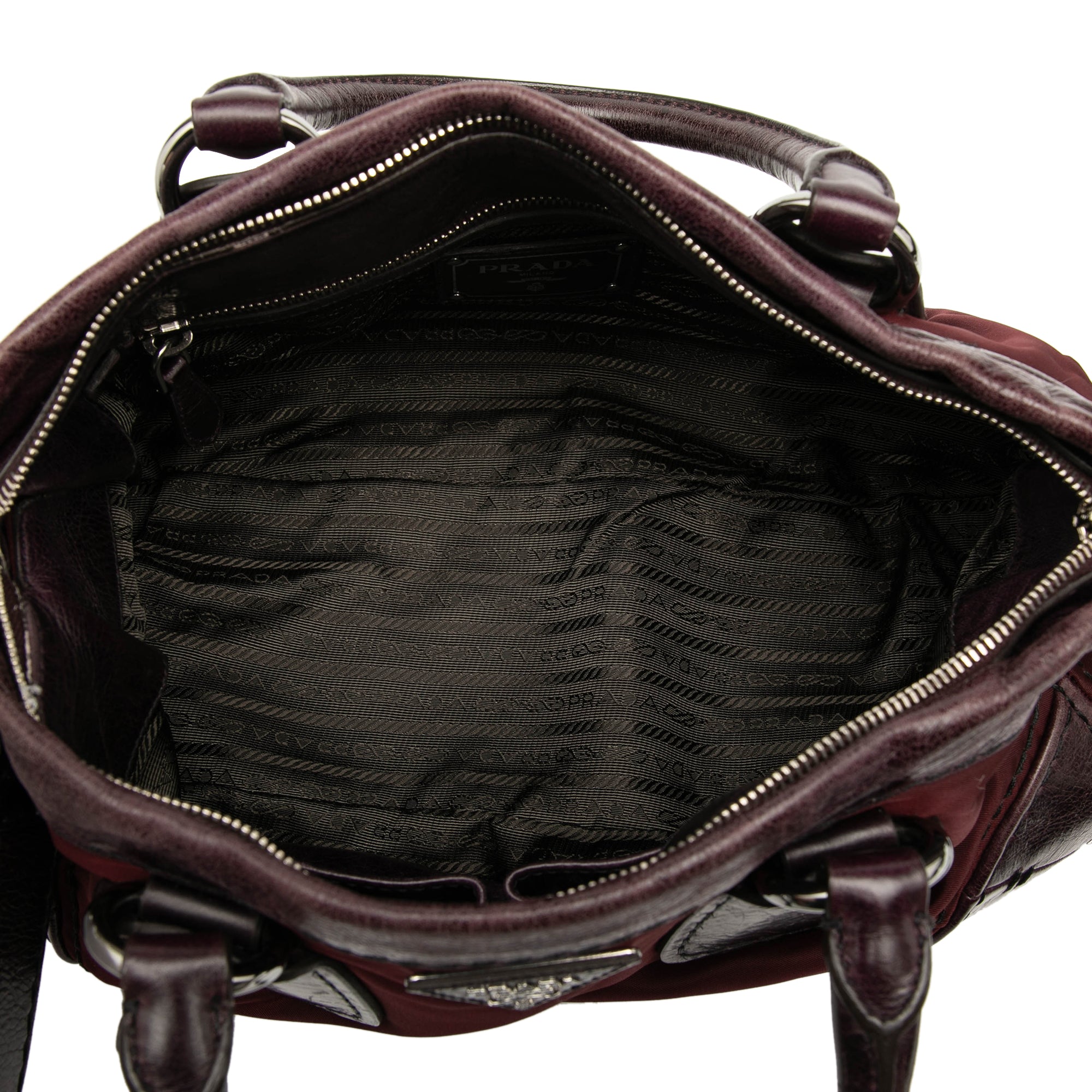 Product Details: Red Prada Soft Calf Trimmed Tessuto Zip Top Satchel. This satchel features a nylon body with leather trim, rolled leather handles, an adjustable flat shoulder strap, a top zip closure, and an interior zip pocket. 7.9" L x 13.8" W x 4.7" D, 3.5" drop.
