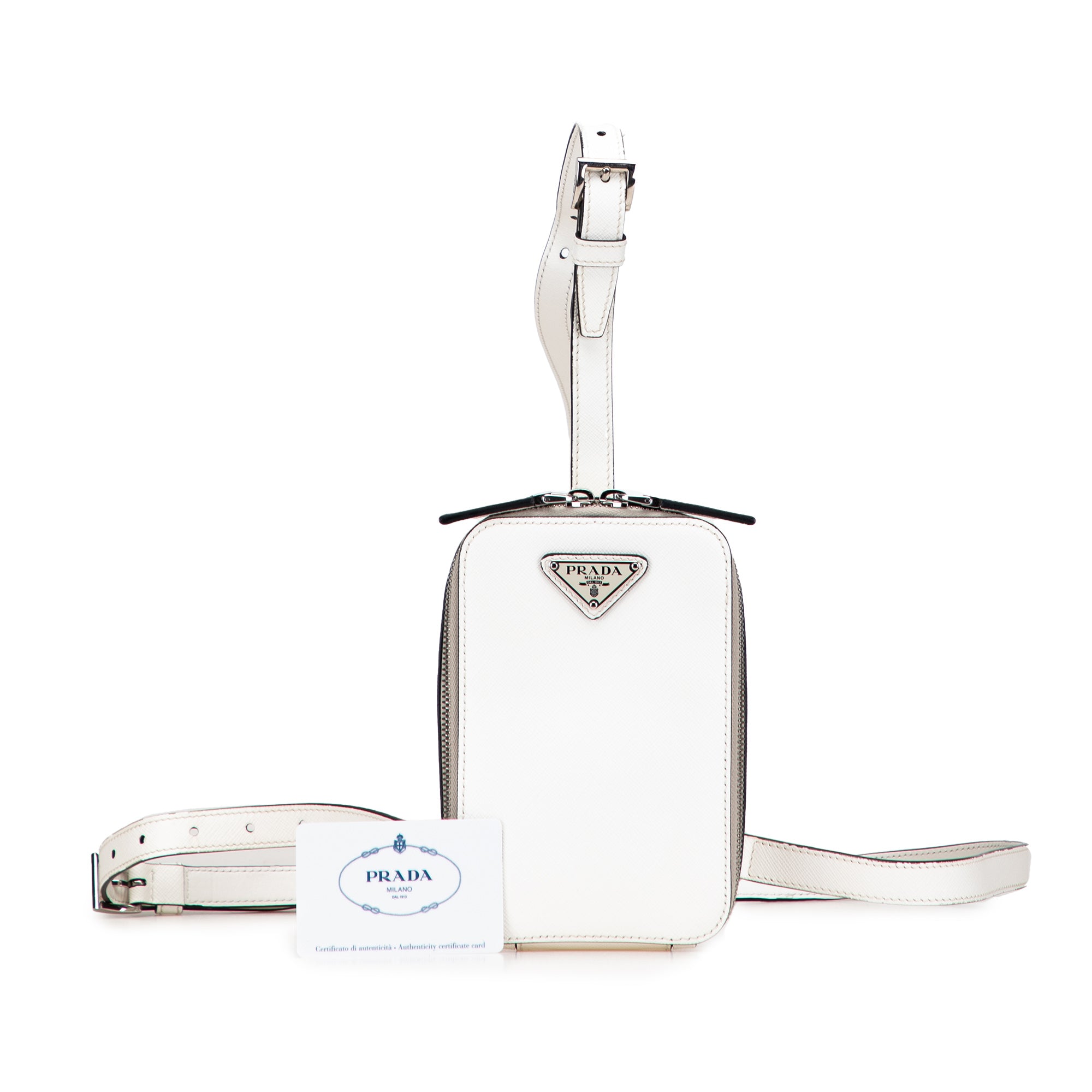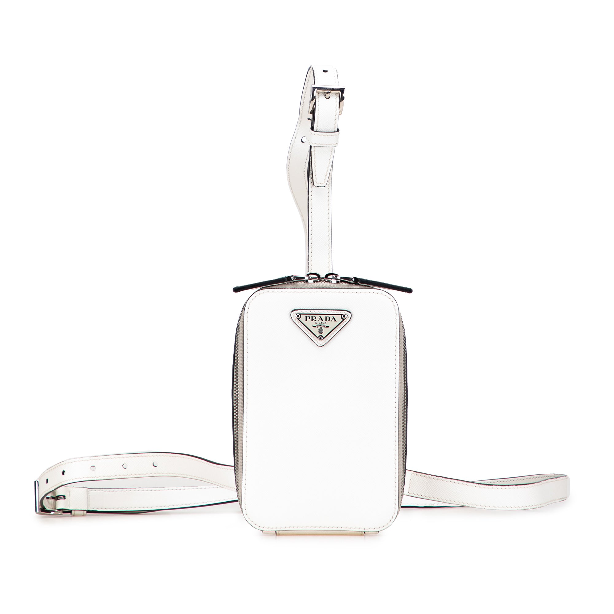 Product Details: White Prada Saffiano Harness Crossbody Pouch. The Harness bag features a saffiano leather body, flat straps, a top zip closure, and an interior slip pocket. 6.9" L x 4.5" W x 1.6" D, 23.6" drop.