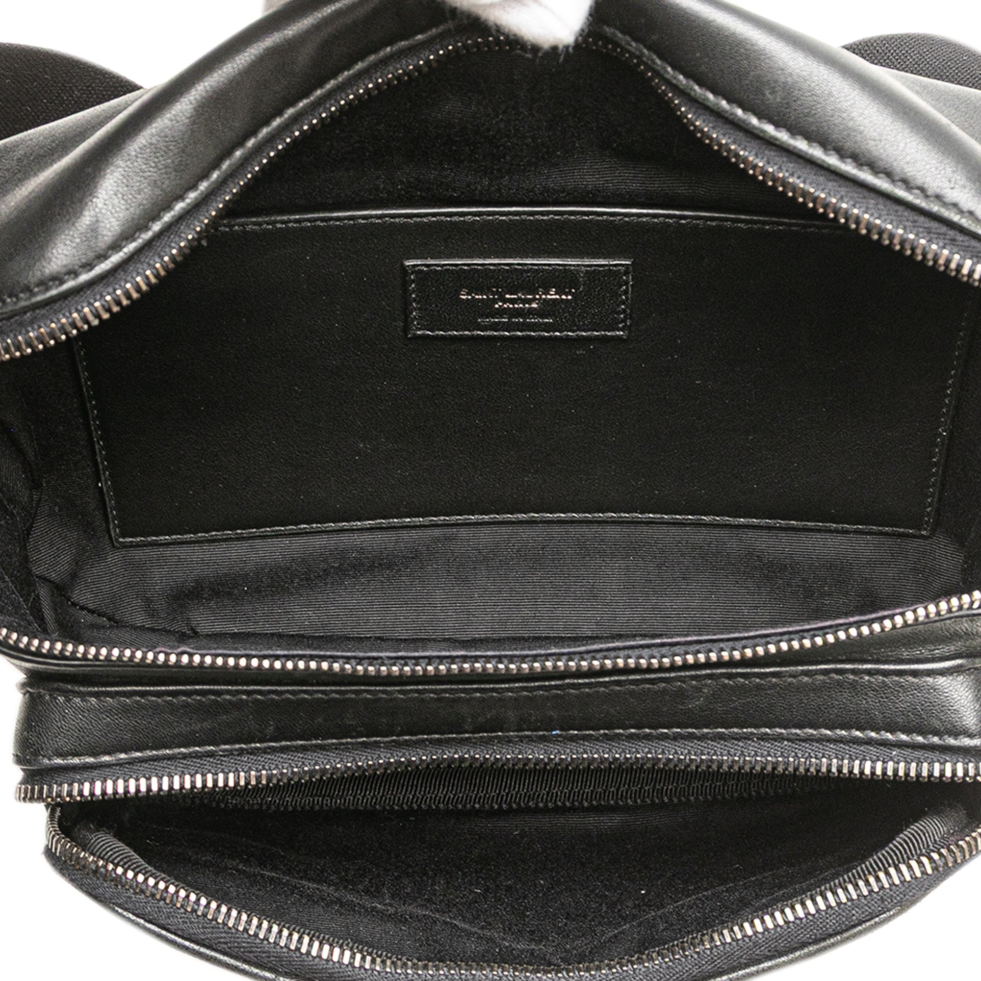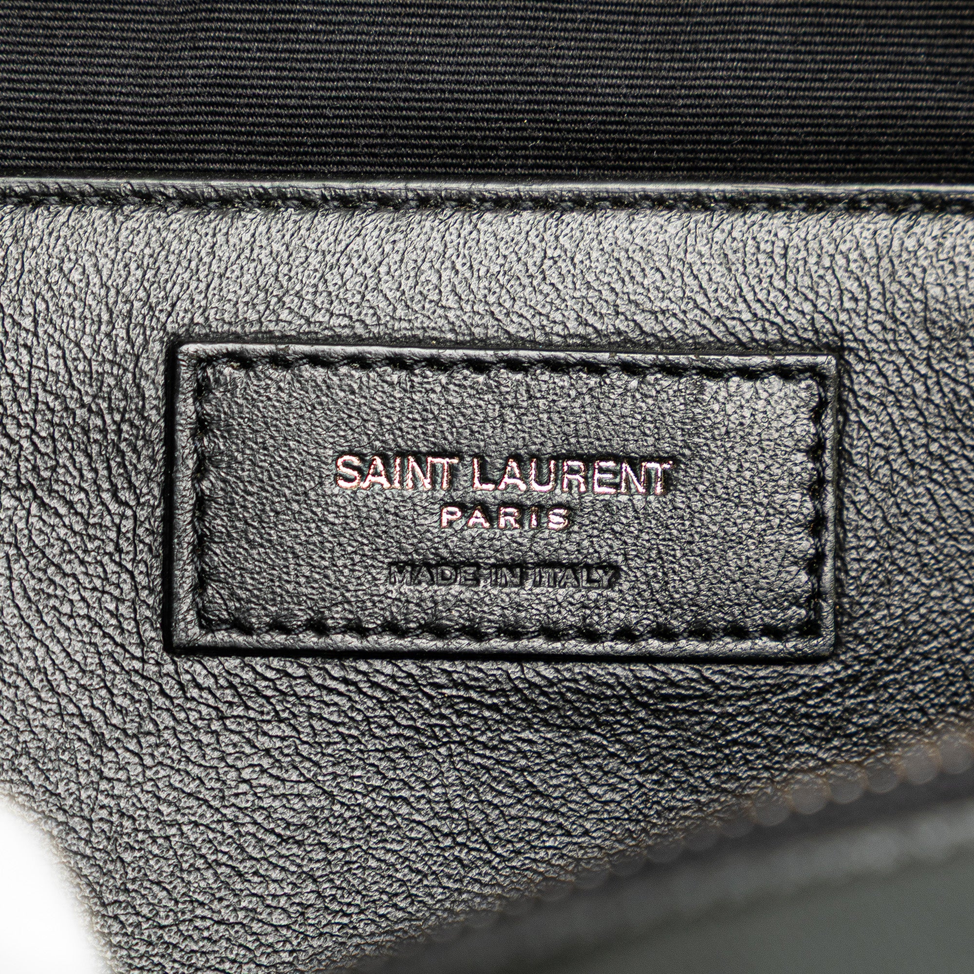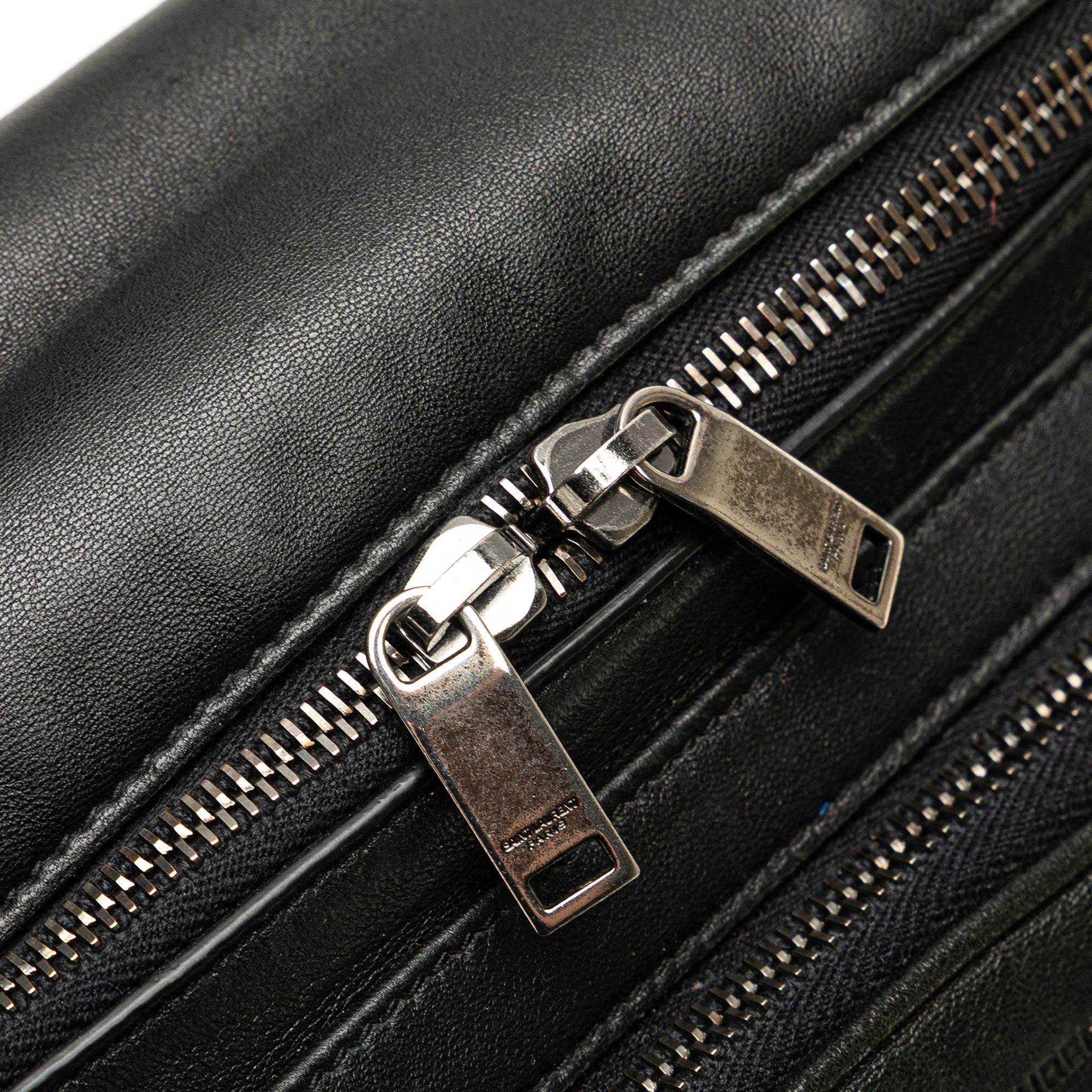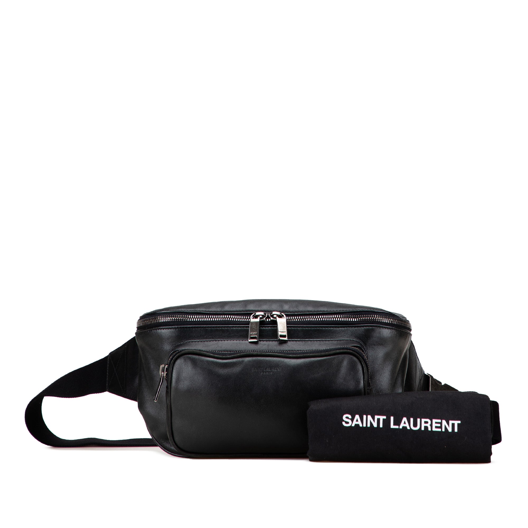 Product Details: Black Saint Laurent Lambskin Subway Belt Bag. This belt bag features a lambskin leather body, an adjustable flat waist strap, a front zip around closure, and exterior front and back zip pocket. 6.3" L x 10" W x 0.4" D. Serial number PLB557964.1218.