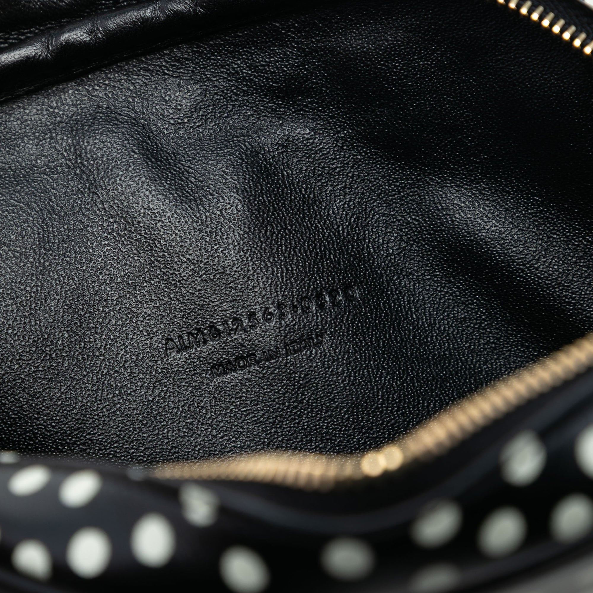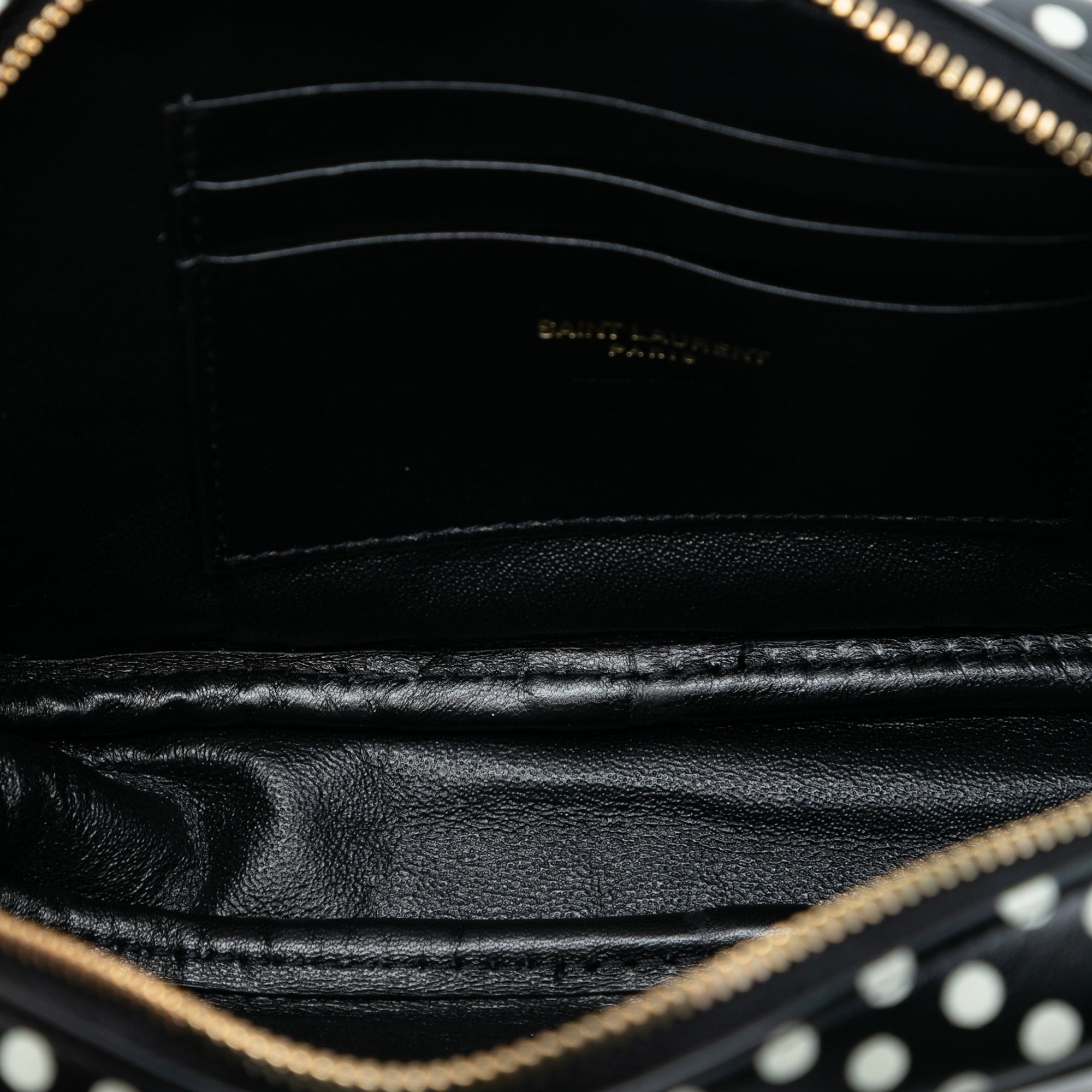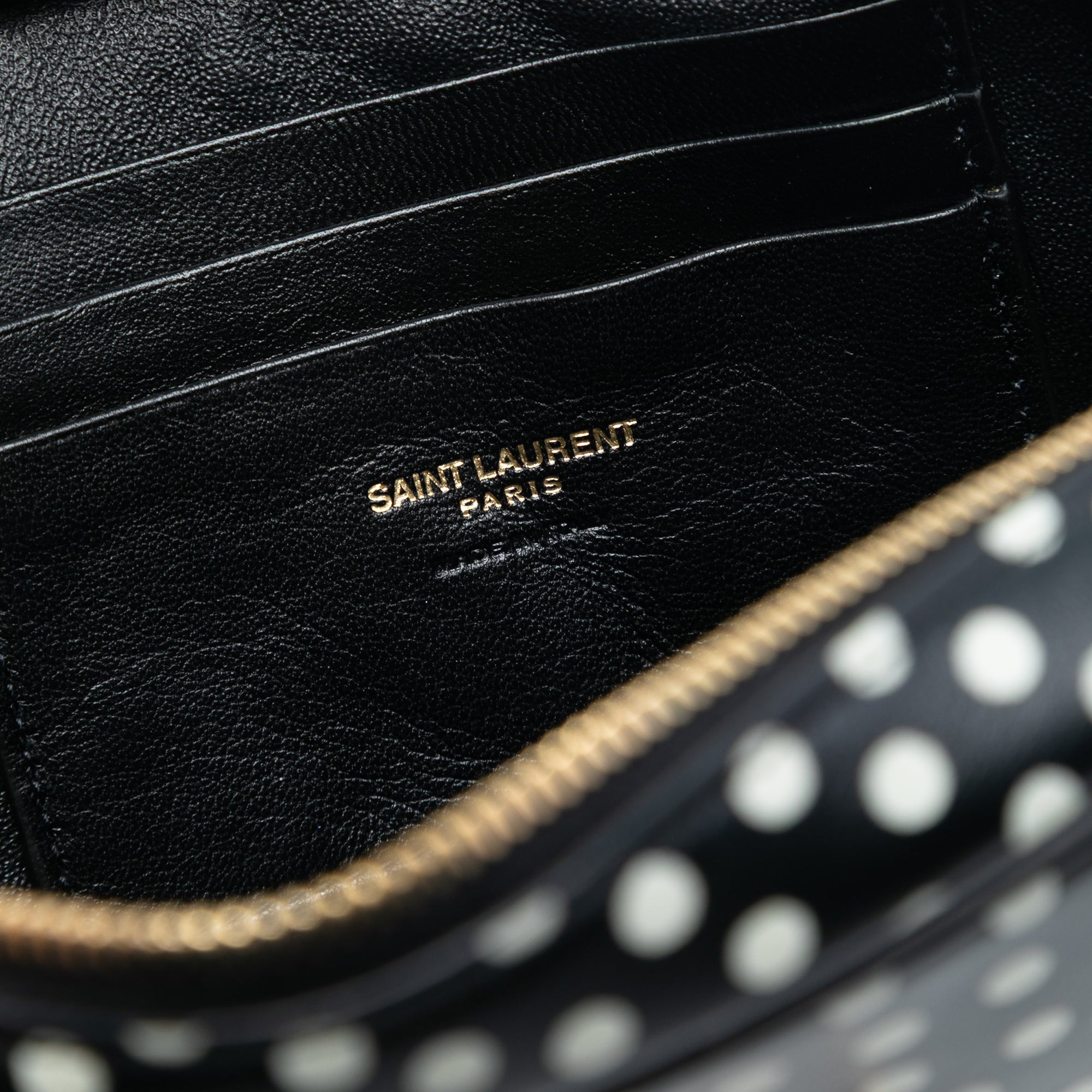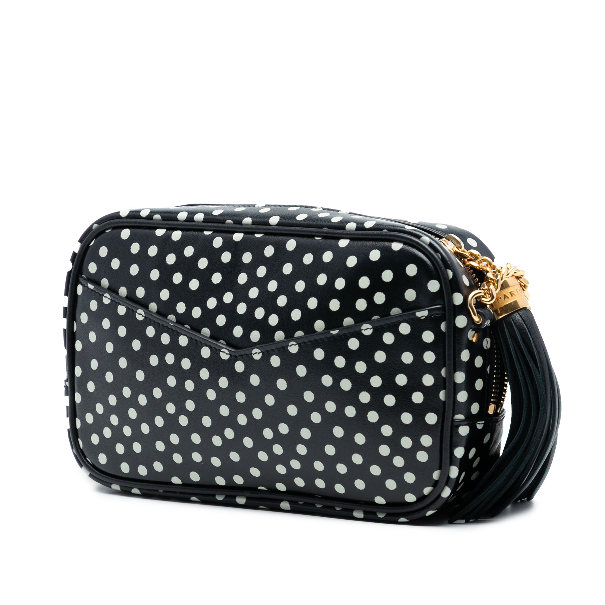Product Details: Black Saint Laurent Mini Calfskin Monogram Polka Dot Lou Camera Bag. The Lou Camera Bag features a leather body with polka dot print, a gold-tone chain strap, a top zip closure, an exterior back slip pocket, and interior card slots. 4.3" L x 7.1" W x 1.6" D. Serial number ALM612563·0320.