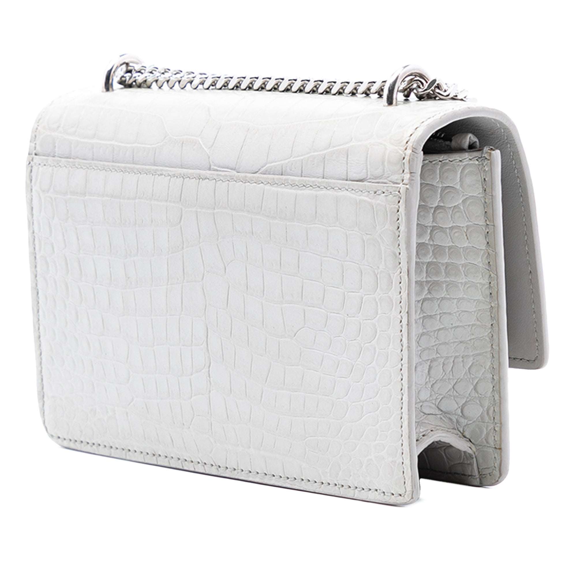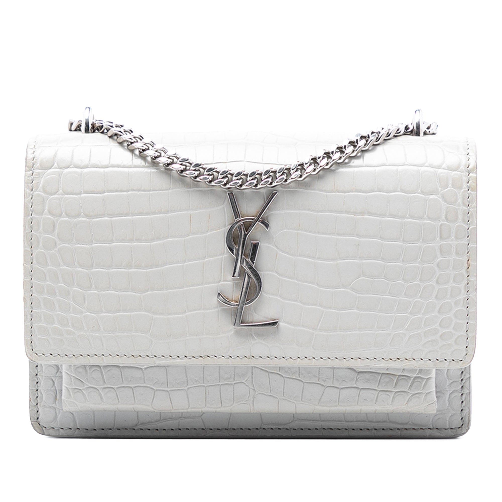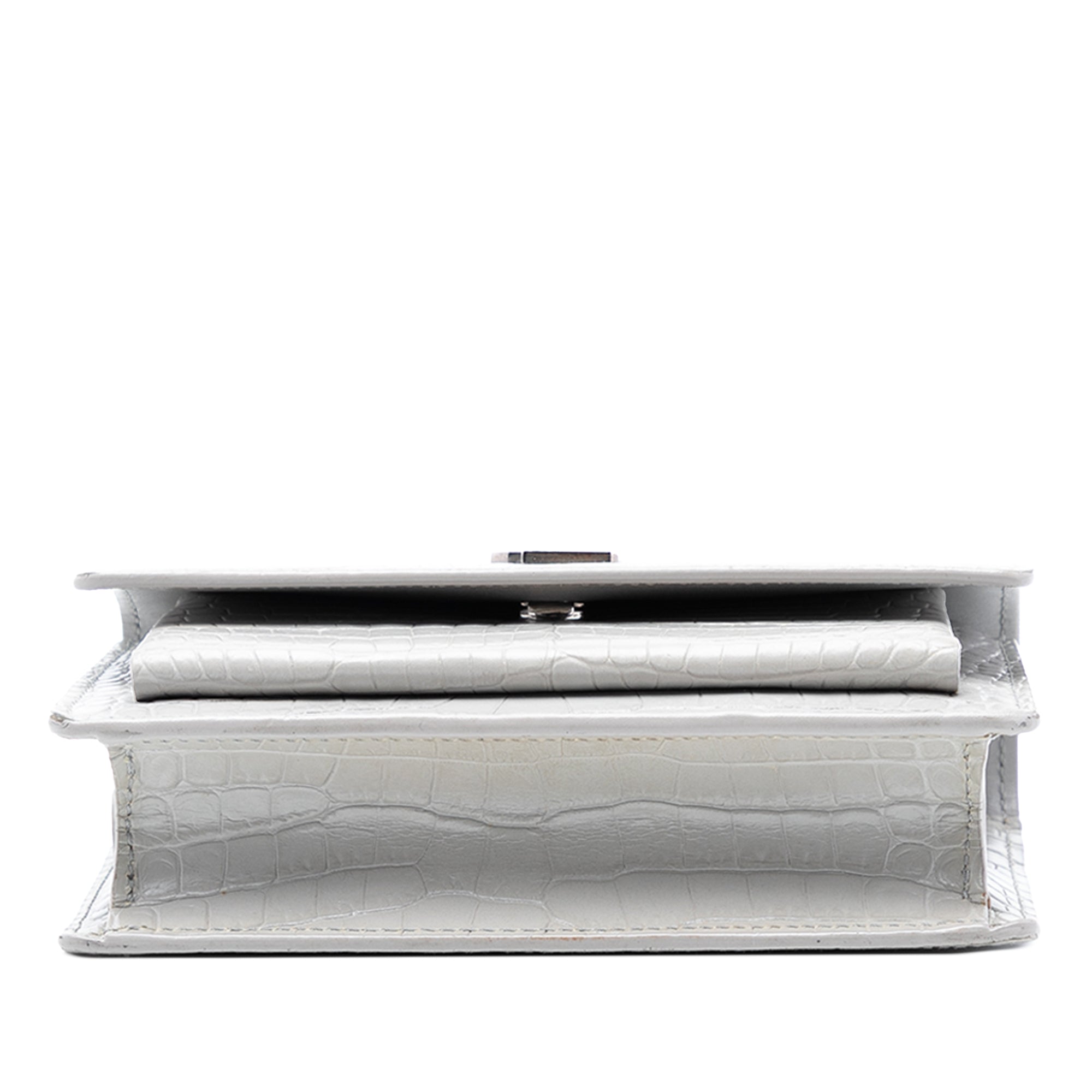 Product Details: Gray Saint Laurent Mini Croc Embossed Leather Monogram Sunset Wallet on Chain Crossbody Bag. The Sunset features an embossed leather body, a chain link strap with leather guard, a top flap with magnetic snap closure, and interior zip and slip pockets. 4.5" L x 6.7" W x 1.6" D.