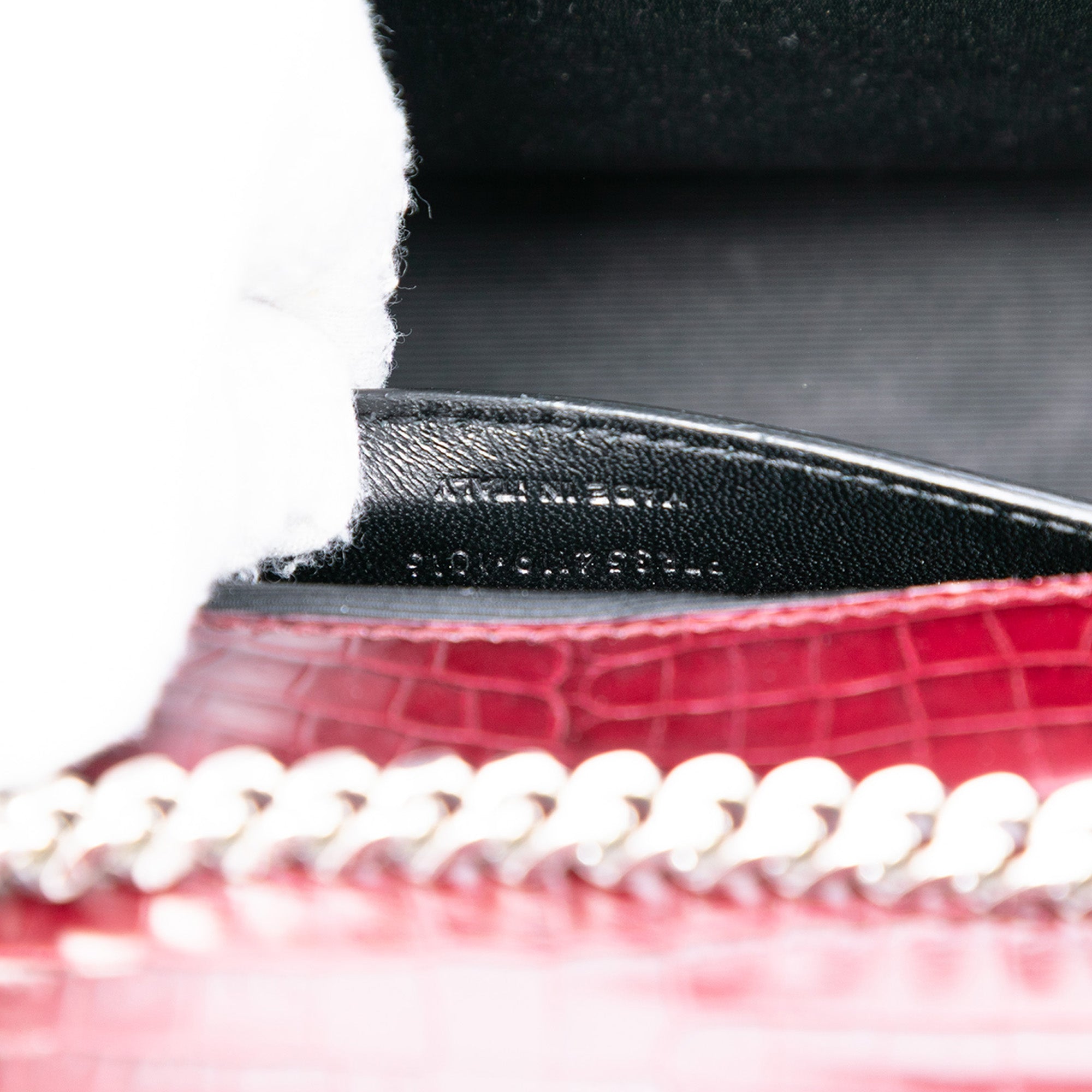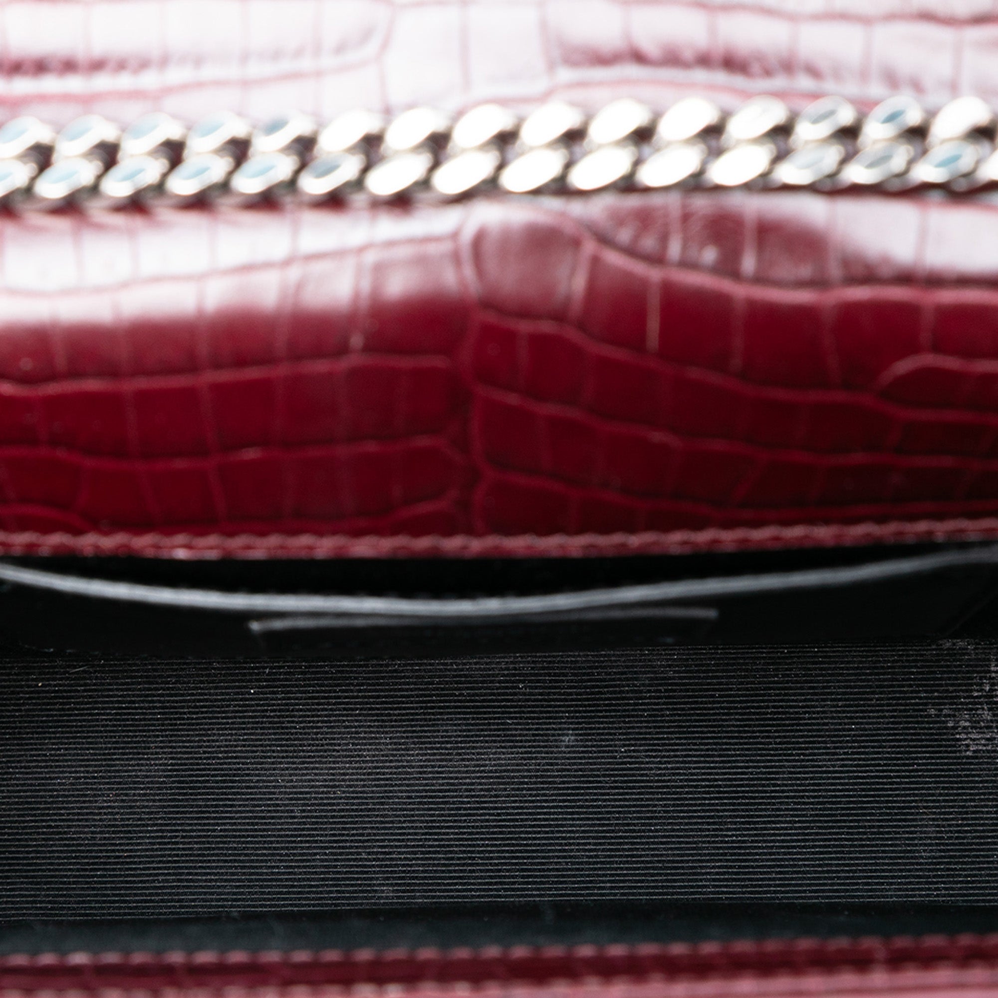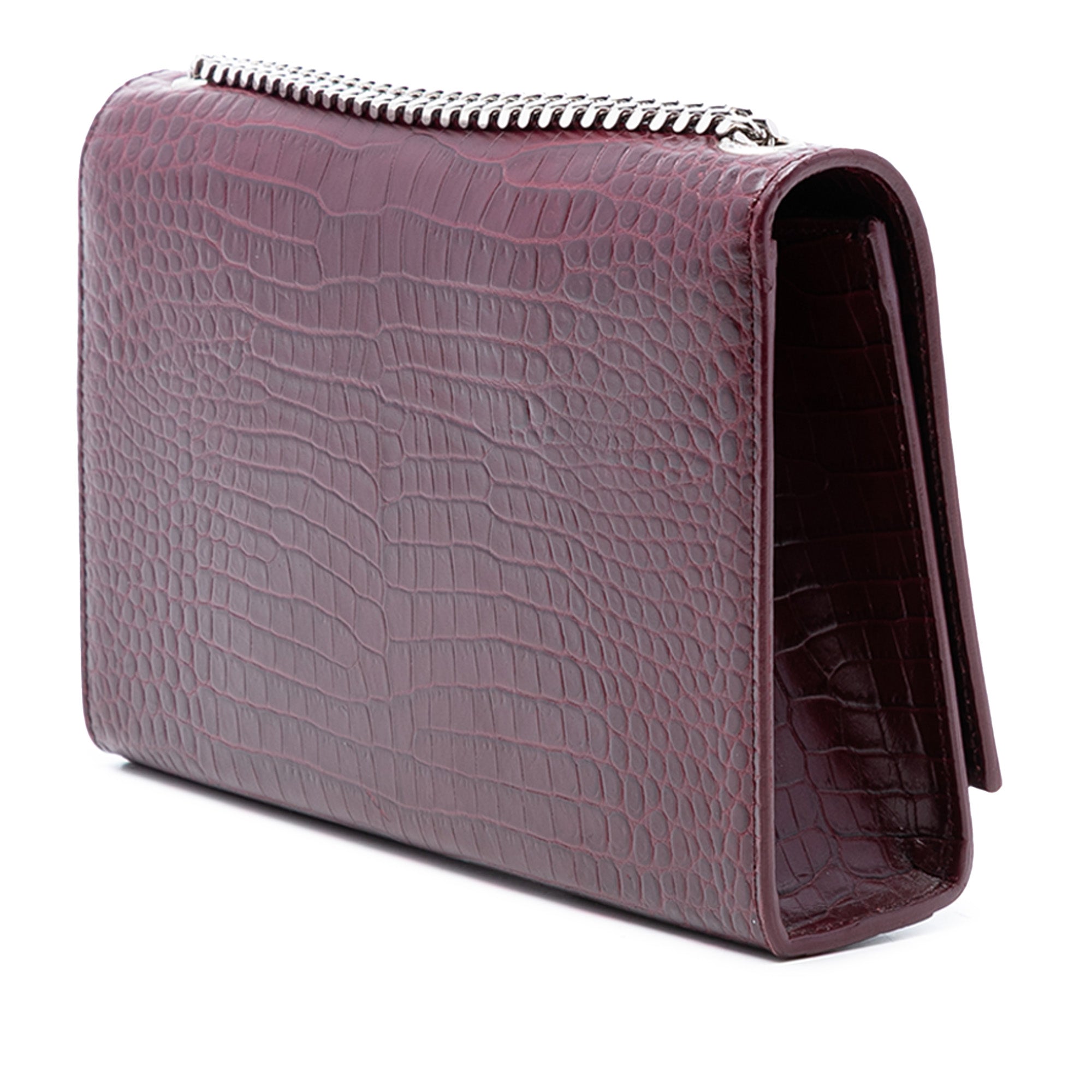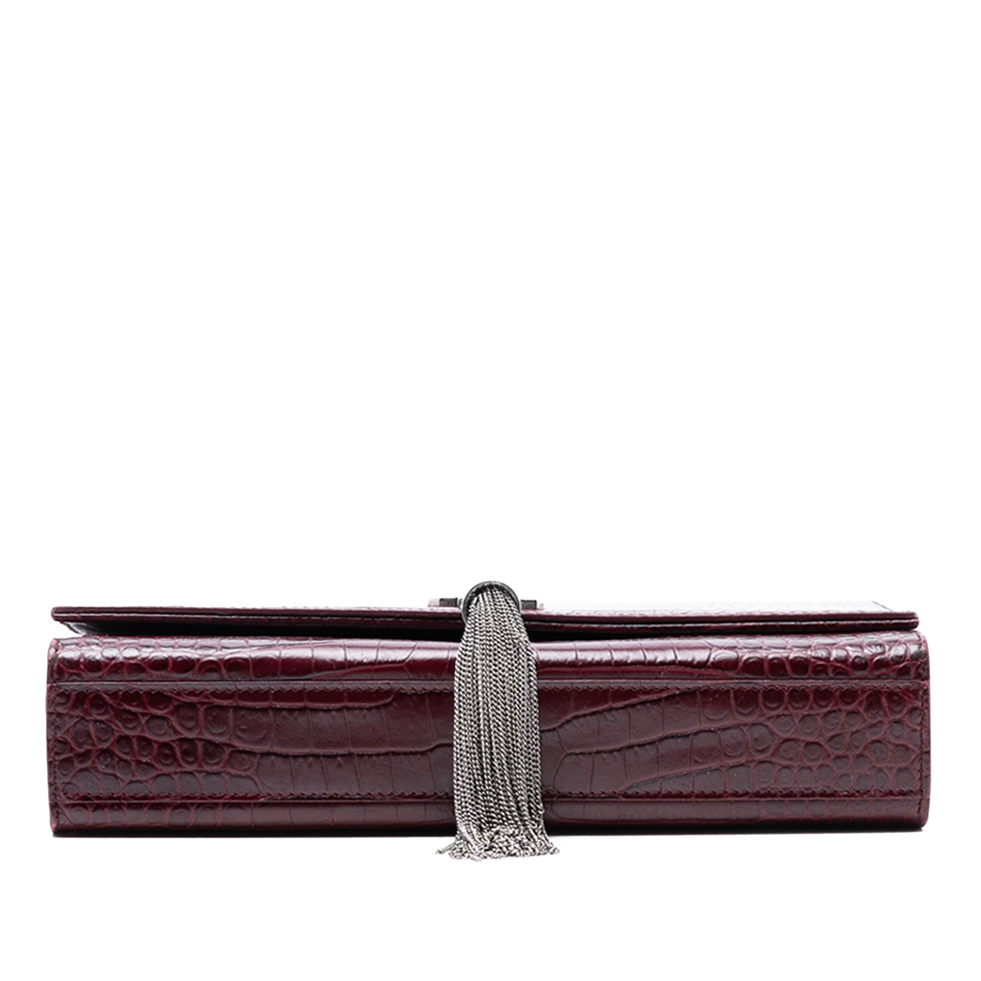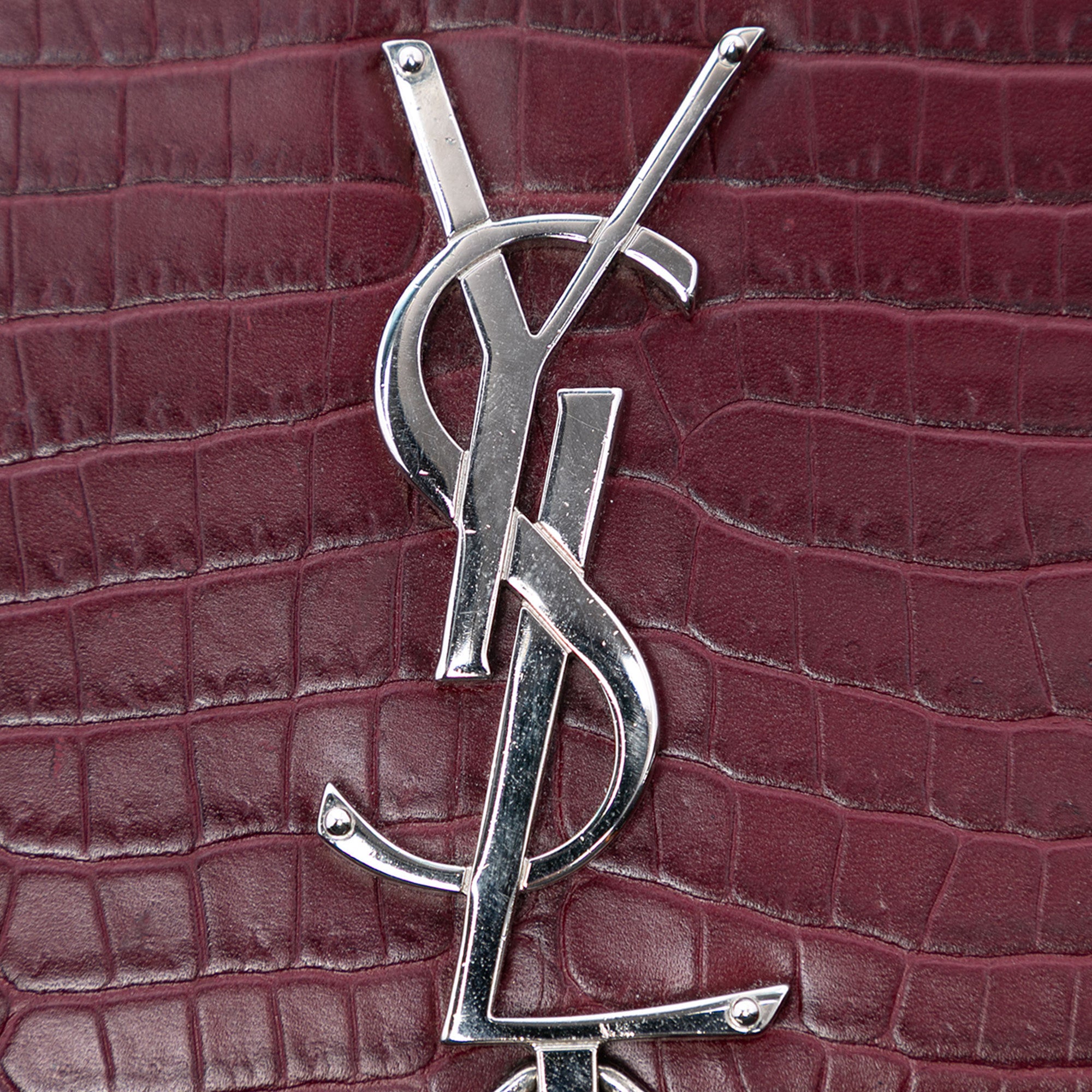 Product Details: Red Saint Laurent Medium Croc Embossed Leather Monogram Kate Tassel Crossbody. The Kate crossbody bag features an embossed leather body with tassel detail, a chain link shoulder strap, a front flap with magnetic snap closure, and an interior slip pocket. 6.5" L x 9.4" W x 2" D.