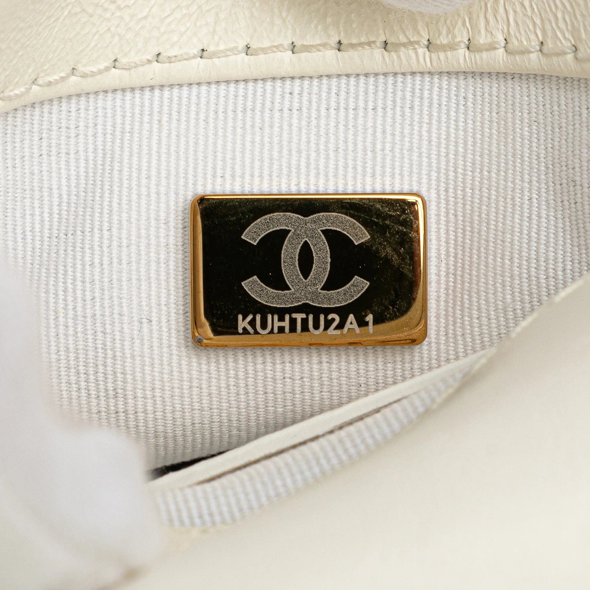 Product Details: White Chanel Mini Aged Calfskin City School Flap Satchel. The Mini City School features a quilted leather body, a chain link handle, an adjustable leather and chain shoulder strap, and a top flap with CC turn-lock closure. 6.7" L x 5.3" W x 1.8" D, 3.3" drop. Serial number KUHTU2A1.