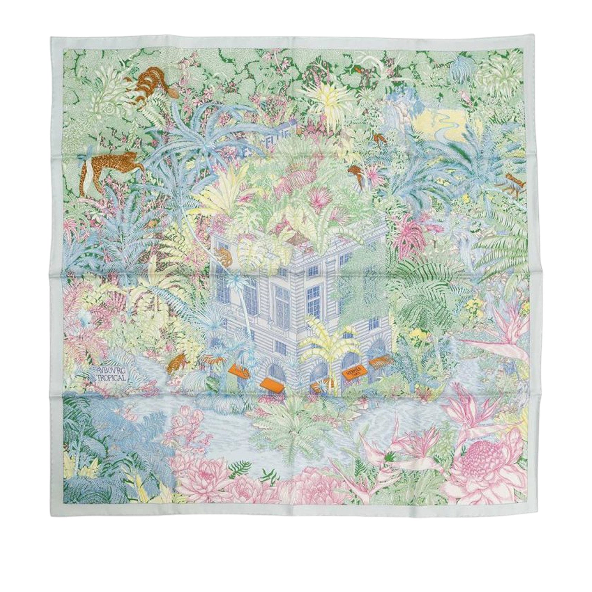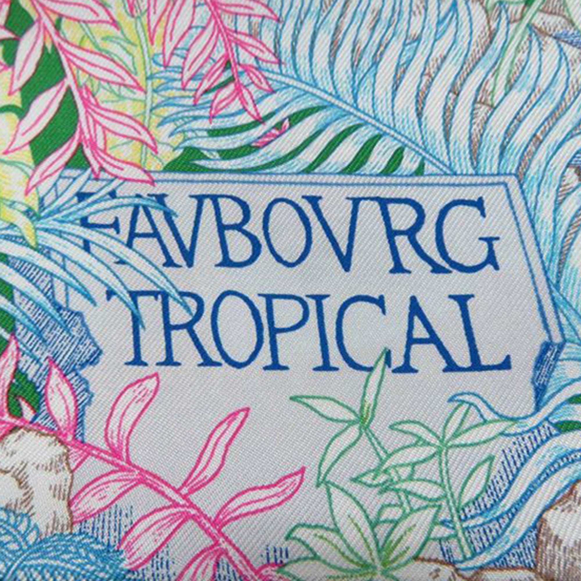 Product Details: Multicolor Hermès Faubourg Tropical Silk Scarf Scarves. This scarf features the Faubourg Tropical print on 100% silk. 35.4" L x 35.4" W x 0" D.