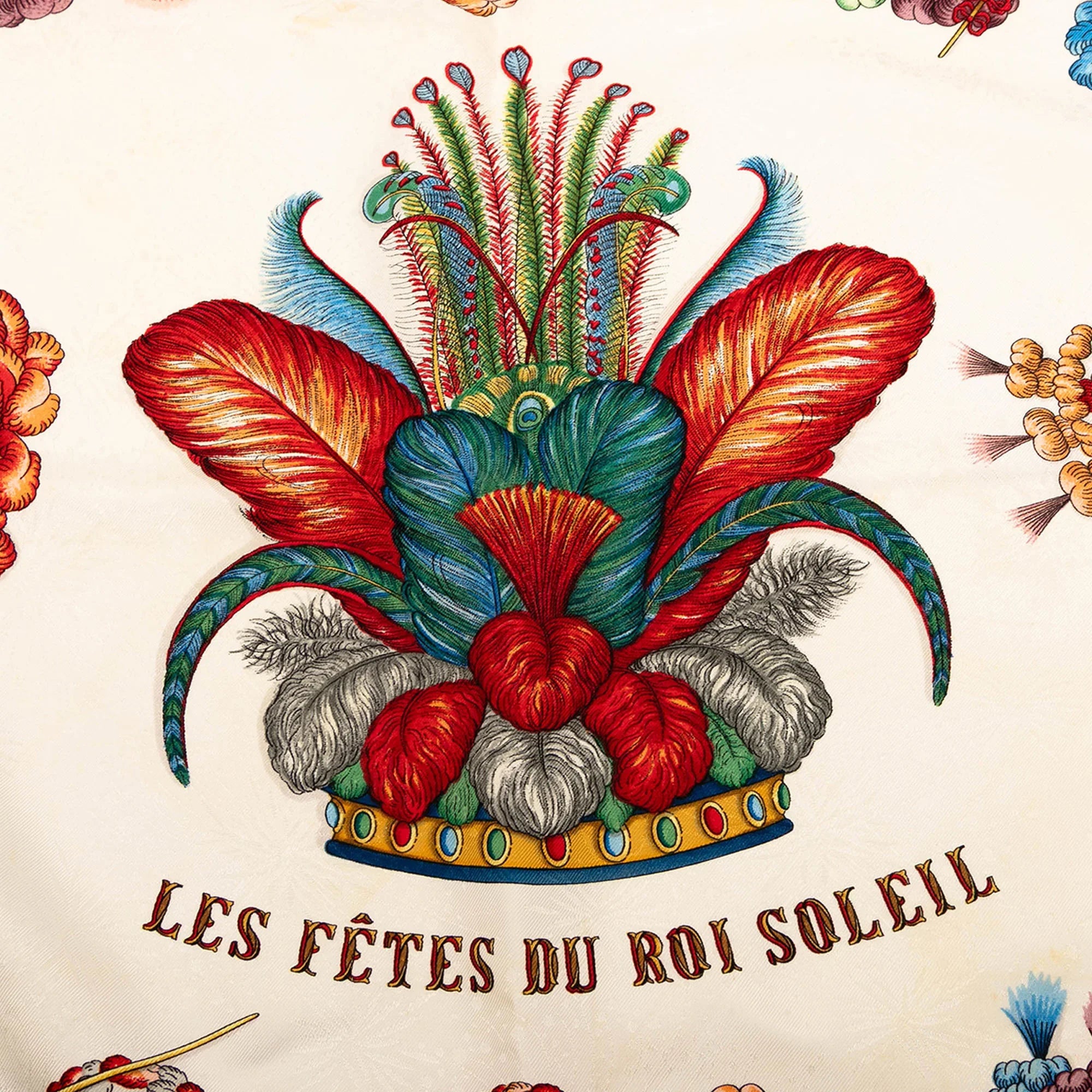 Product Details: White Hermès Les Fetes Du Roi Soleil Silk Scarf Scarves. The Les Fetes Du Roi Soleil scarf features a print on 100% silk. 34.3" L x 34.6" W x 0" D.