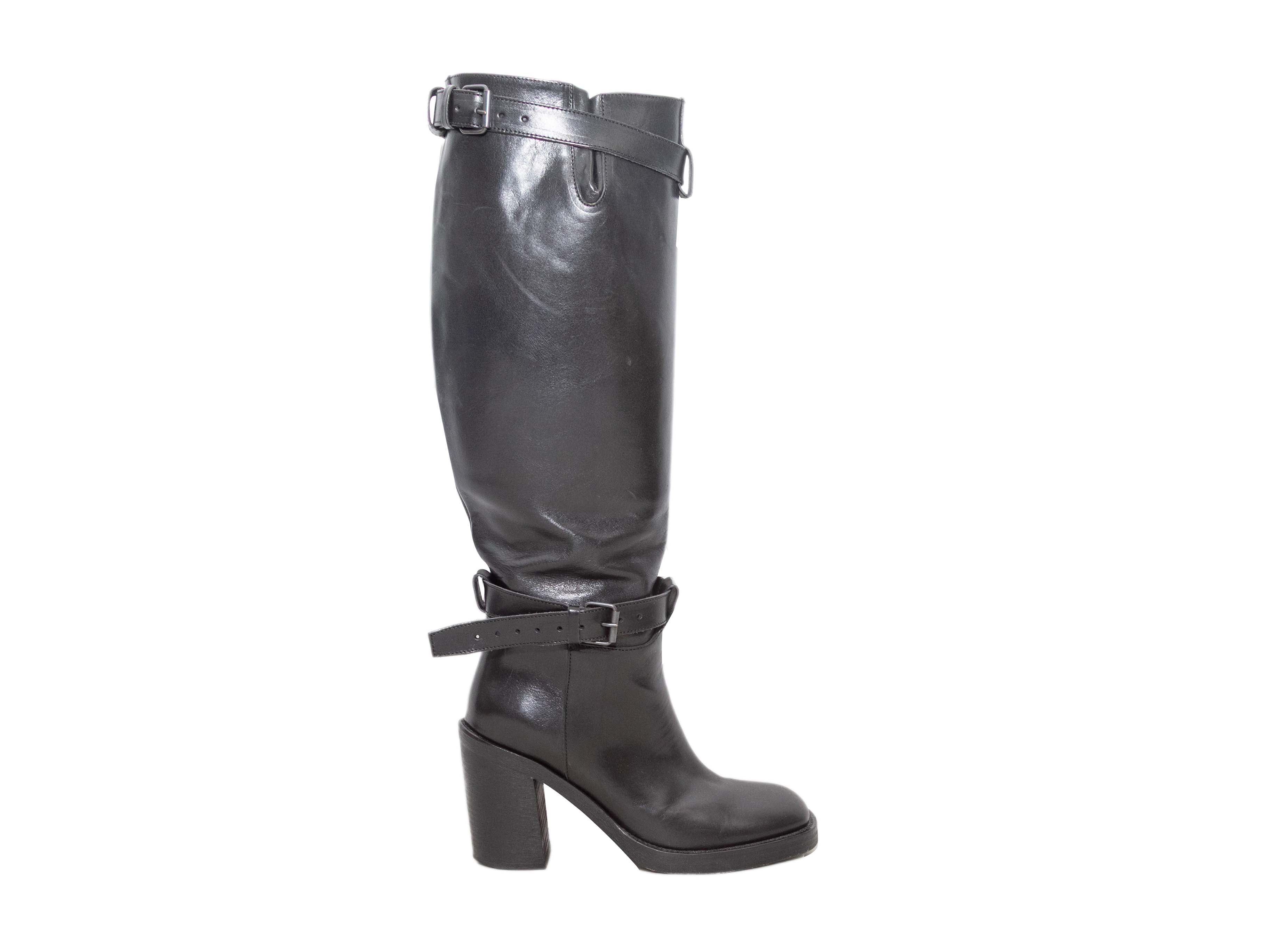 Product Details: Black leather heeled knee-high buckle boots by Ann Demeulemeester. Stacked heels. 17" shaft height, 4" heel height.