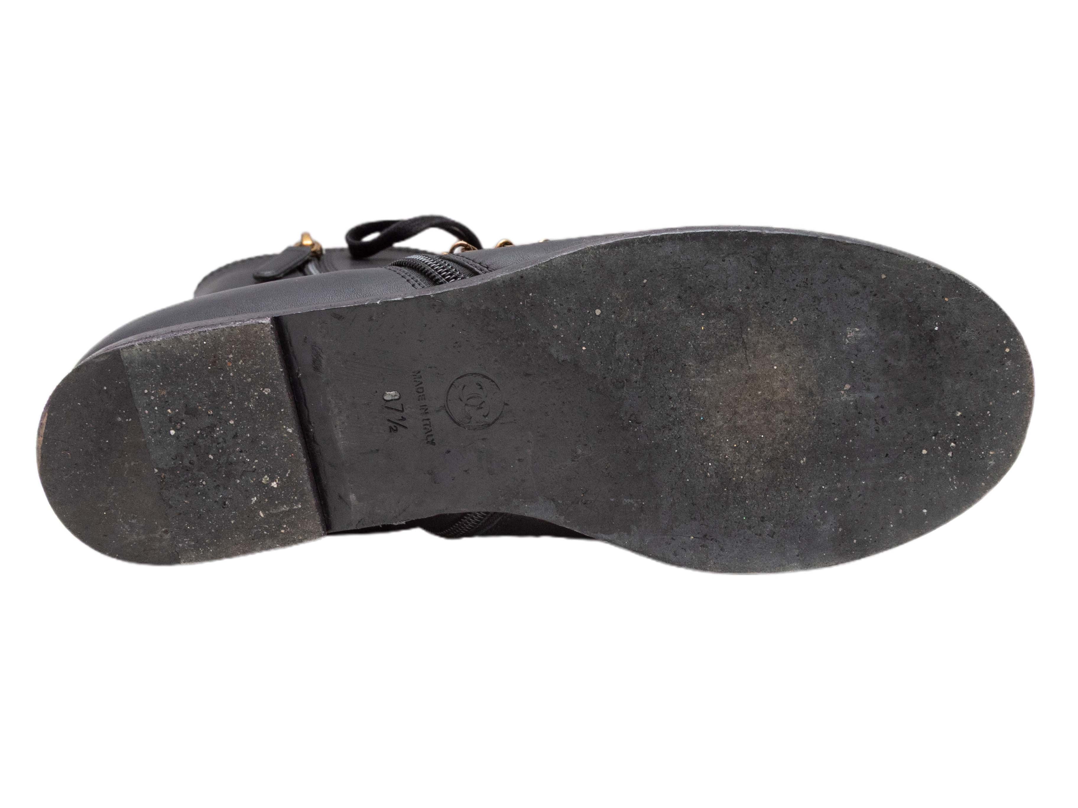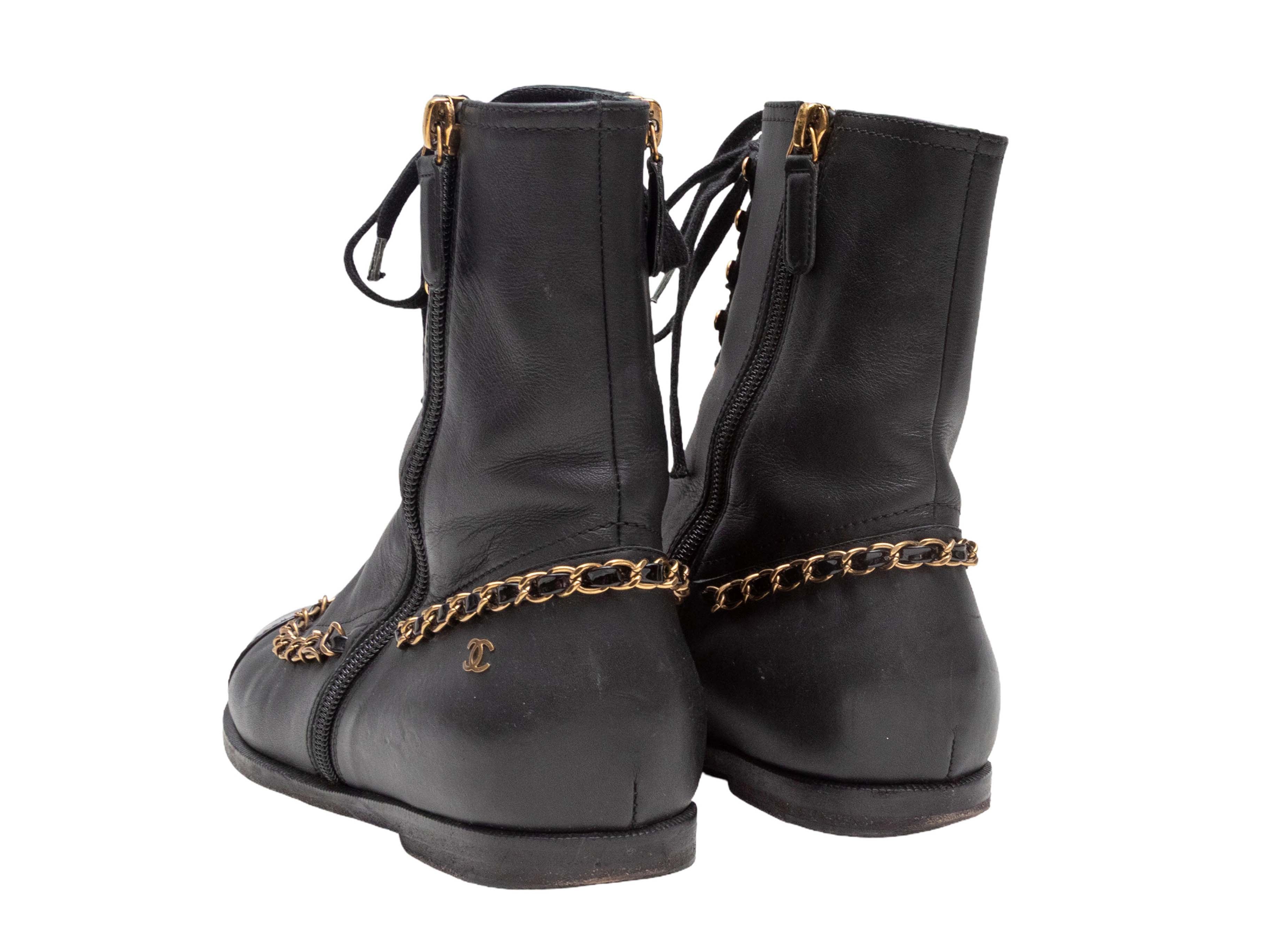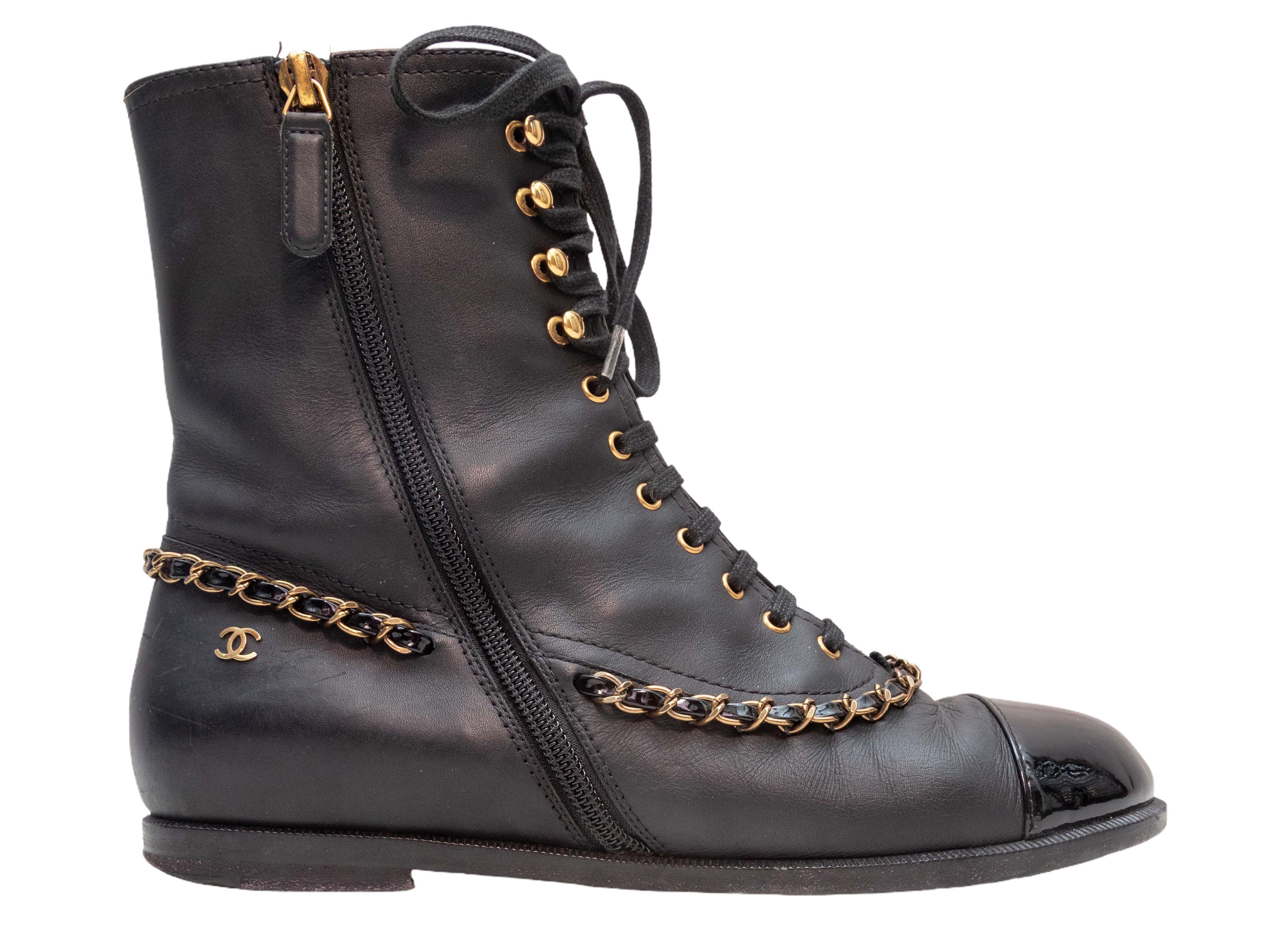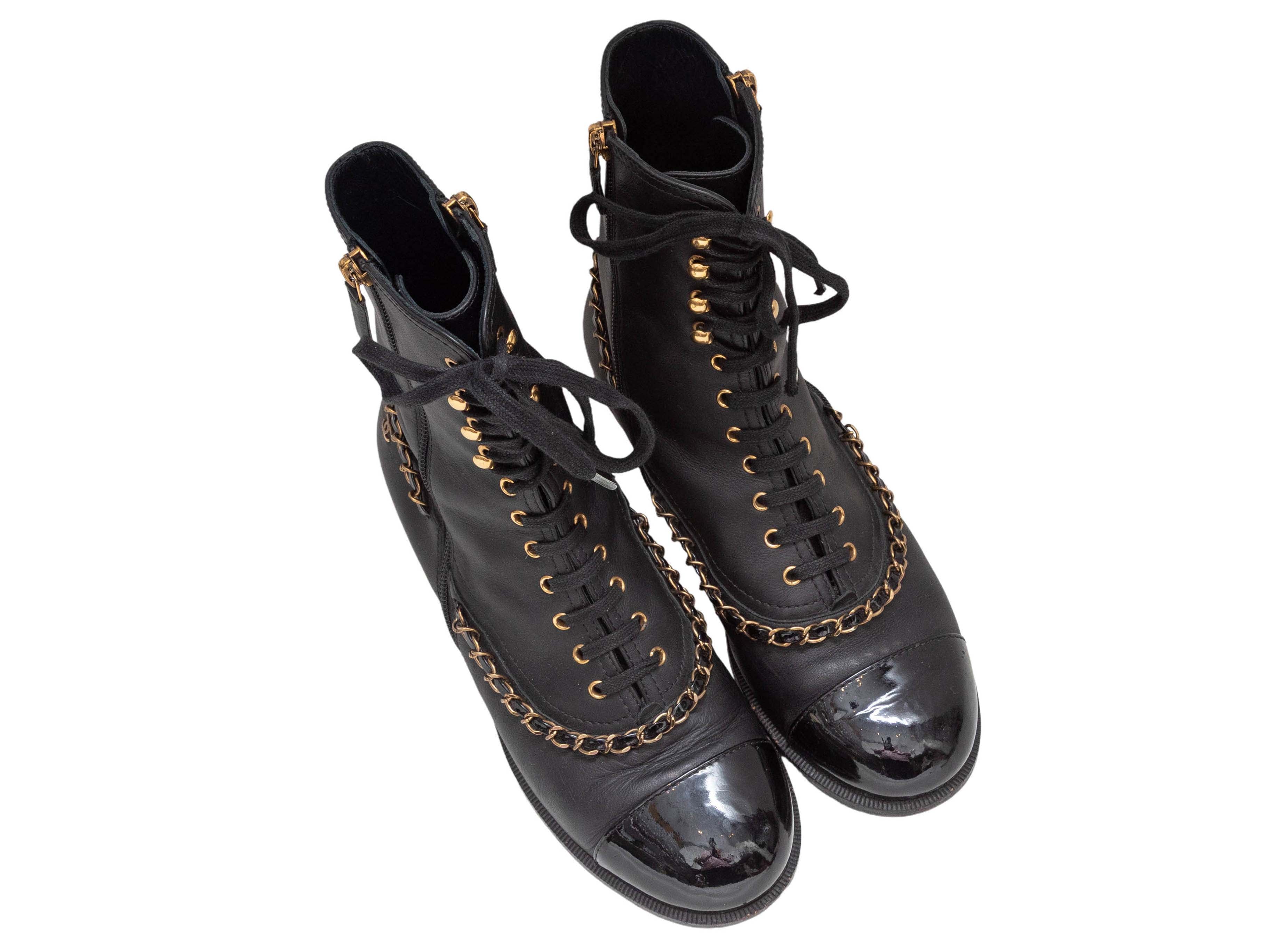 Product Details: Black leather and patent cap-toe chain-accented ankle boots by Chanel. Gold-tone hardware throughout. Lace-up detailing at toes. Rubber soles. Zip closures at inner sides. 6.75" shaft height, 0.5" heel height.