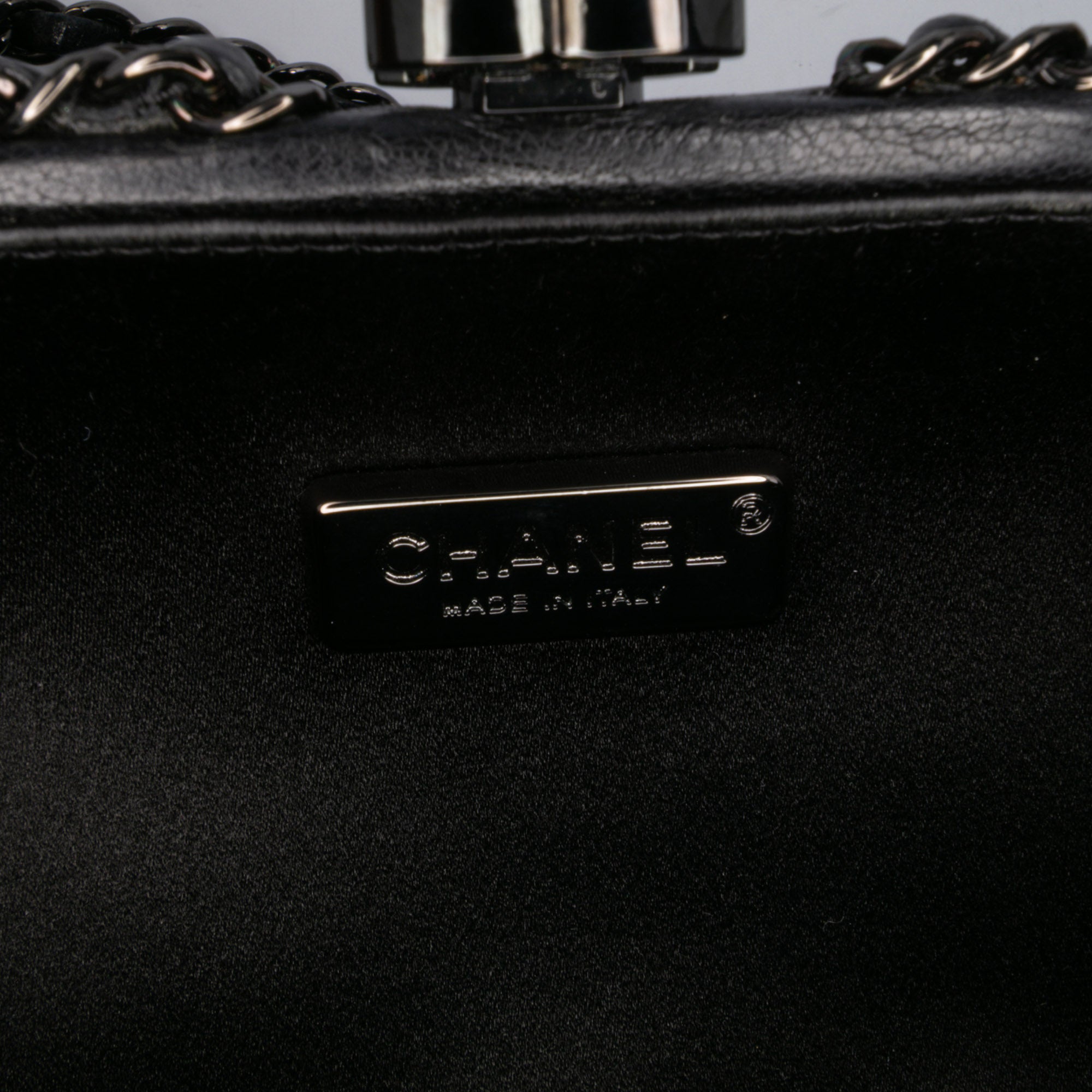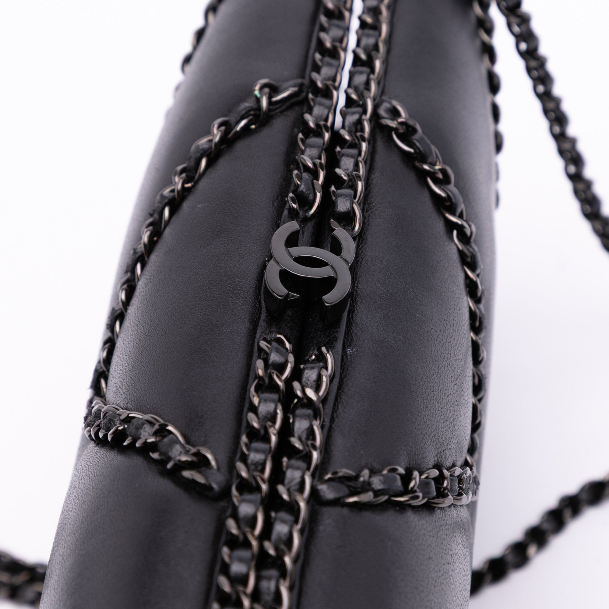 Product Details: Black Chanel Chevron Lambskin Chain Around Clutch on Chain Shoulder Bag. This crossbody bag features a quilted lambskin leather body, leather woven chain shoulder strap, and a kiss lock closure. 5.1" L x 10" W x 2.4" D. Serial number 23295482.