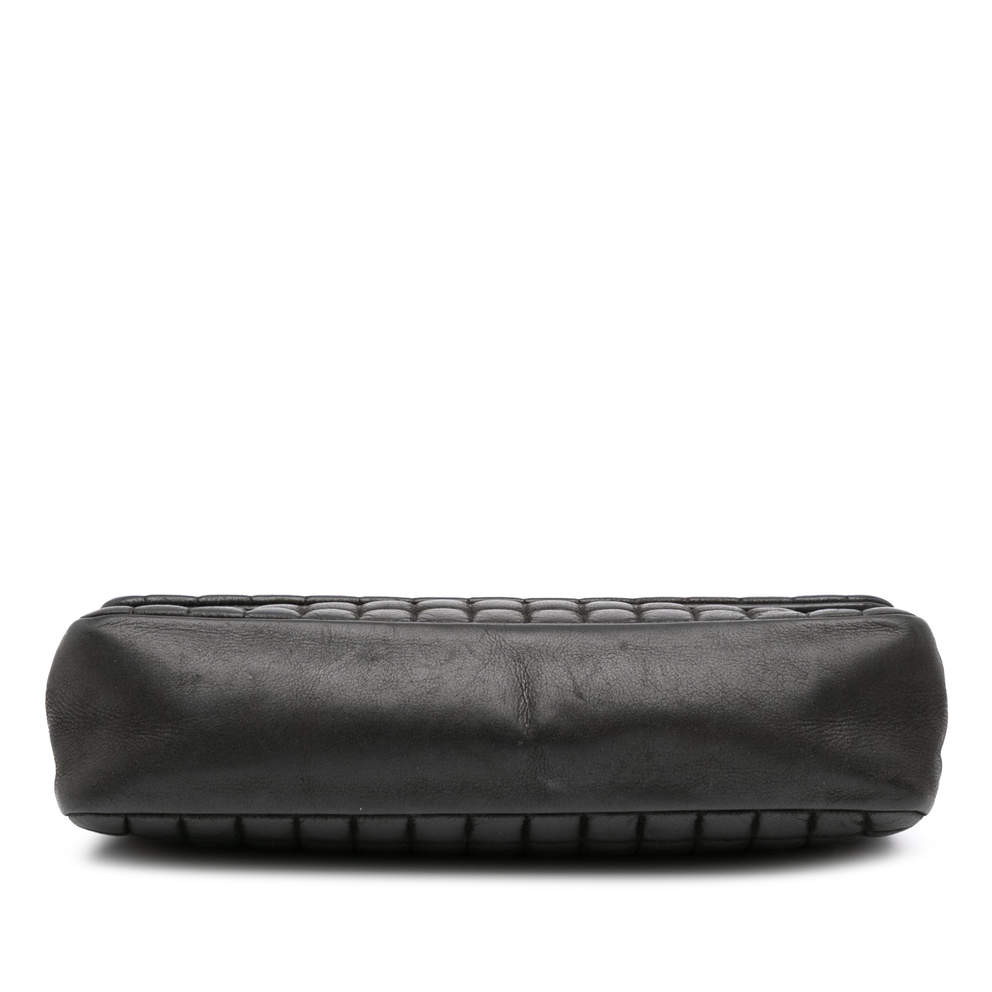 Product Details: Black Chanel Chocolate Bar Iridescent Calfskin Bubble Flap Shoulder Bag. This shoulder bag features a quilted iridescent calfskin body, leather-woven chain straps, a front flap with flip lock closure, and an interior zip pocket. 5.7" L x 10.6" W x 2.8" D. Serial number 20121552.