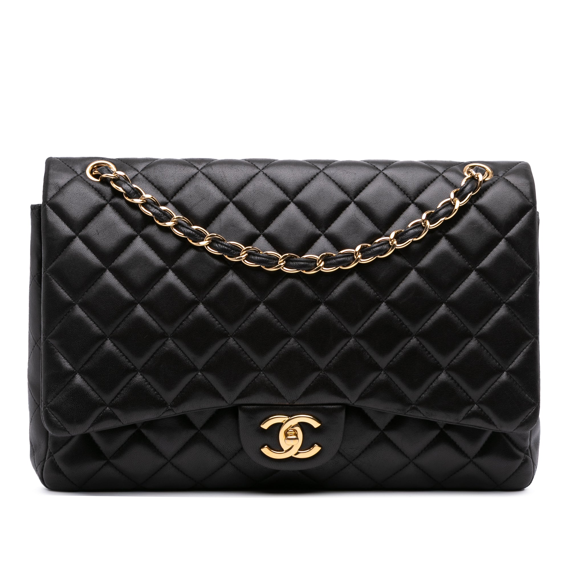 Product Details: Black Chanel Maxi Classic Lambskin Double Flap Shoulder Bag. This shoulder bag features a quilted lambskin leather body, leather woven chain straps, double front flaps with interlocking Cs and a twist lock closure, an exterior back slip pocket, and interior zip and slip pockets. 9.1" L x 13" W x 3.5" D. Serial number 15029148.