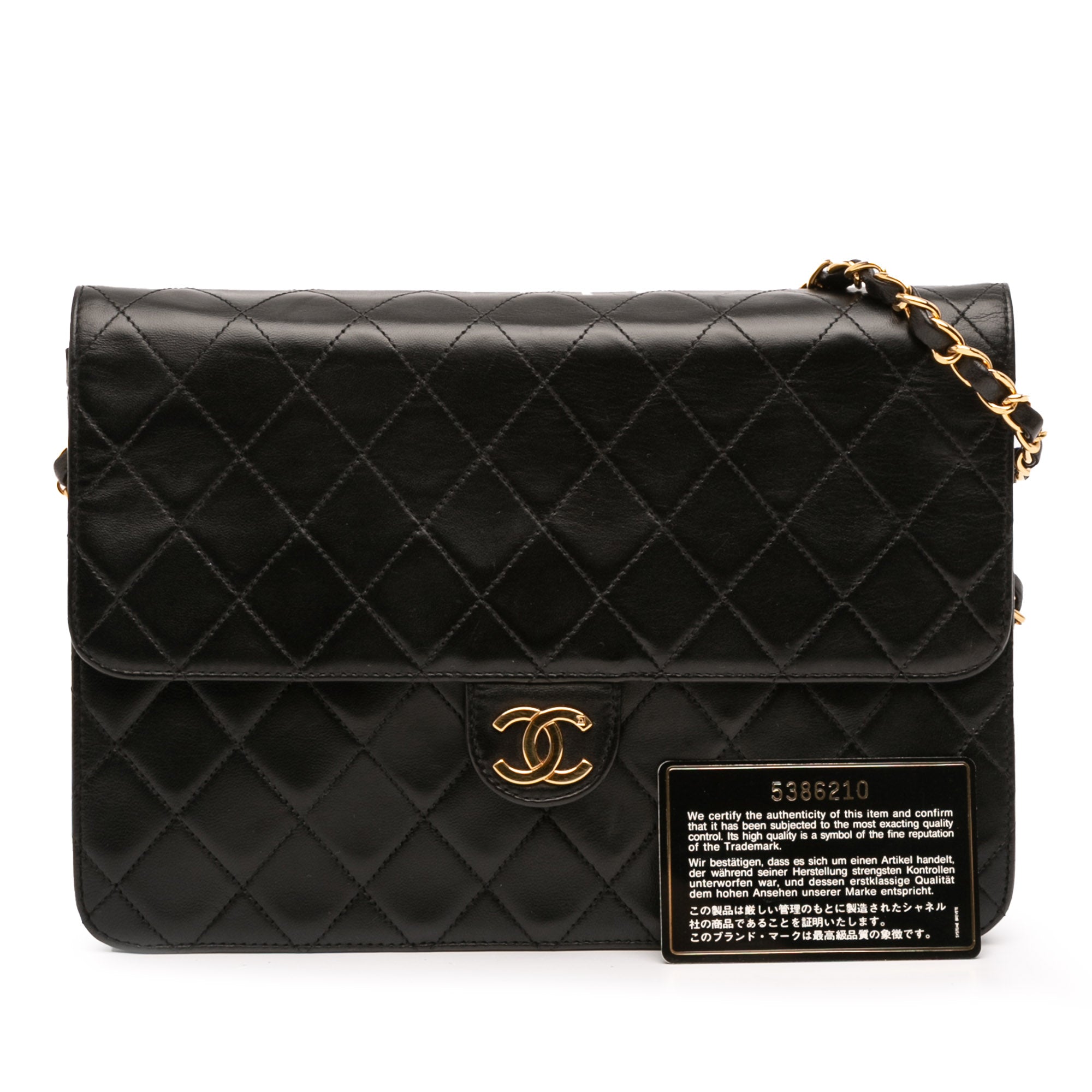 Product Details: Black Chanel Medium CC Quilted Lambskin Single Flap Shoulder Bag. This flap bag features a quilted lambskin leather body, a leather woven chain strap, a front flap with CC and clasp closure, and interior zip pocket and slip pockets. 7.1" L x 9.8" W x 1.8" D. Serial number 5386210.