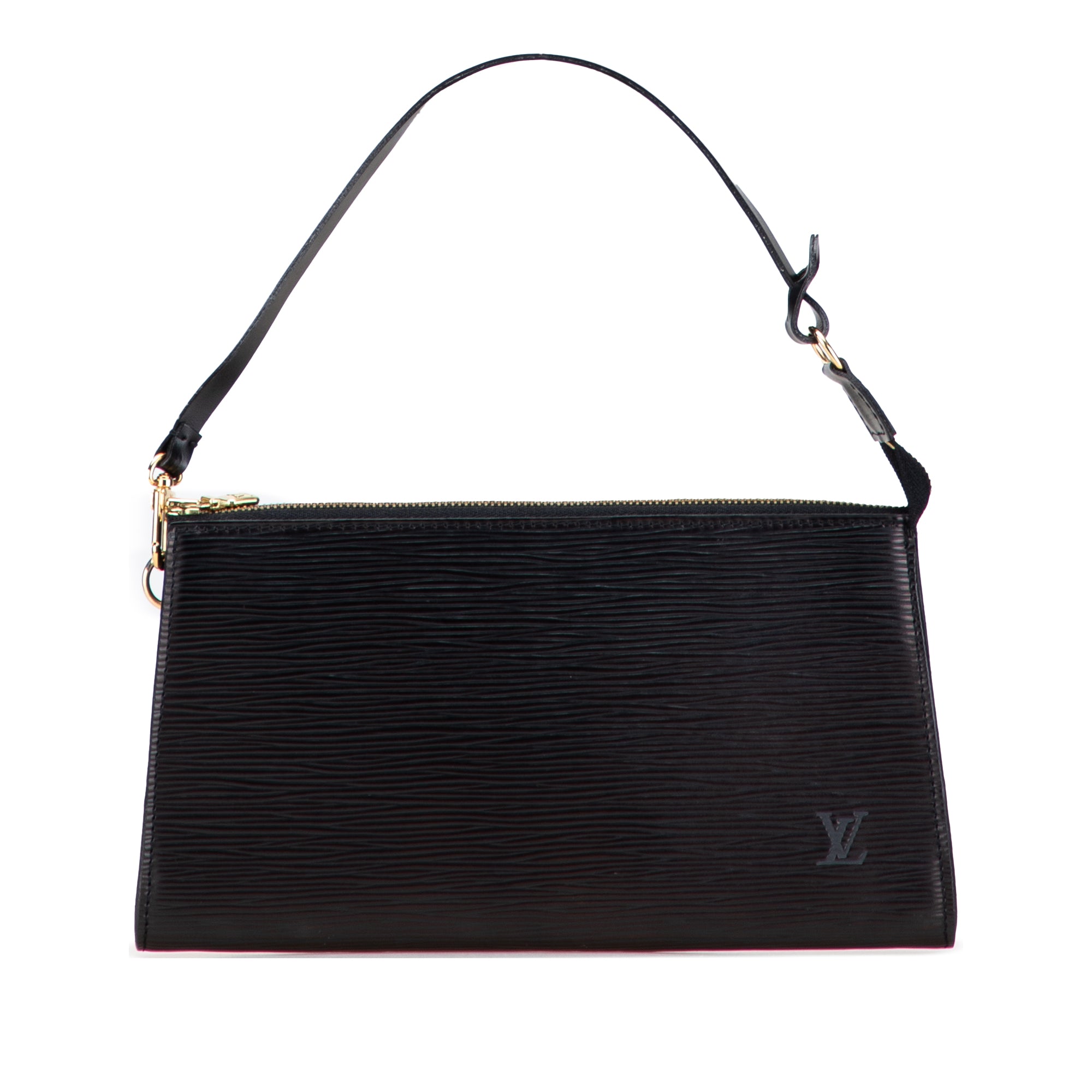 Product Details: Black Louis Vuitton Epi Pochette Accessoires Shoulder Bag. The Pochette Accessoires features an epi leather body, a detachable flat shoulder strap, and a top zip closure. 5.1" L x 9.6" W x 1" D, 5.5" drop. Serial number AR1919.