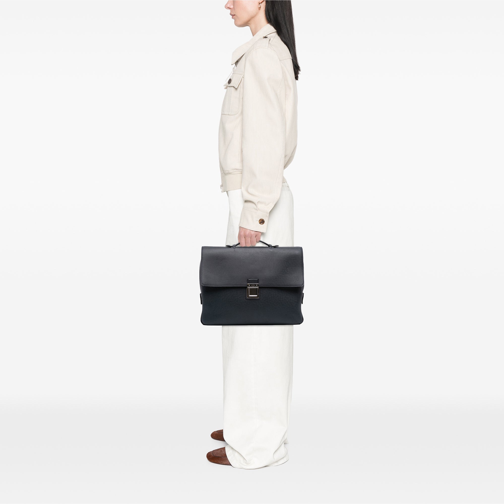 Product Details: Black Louis Vuitton Taiga Vassili PM Business Bag. The Vassili PM features a leather body, a top handle, a detachable flat shoulder strap, a front flap with push lock closure, a back exterior zip pocket, and an interior zip pocket. 11.8" L x 14.8" W x 2" D, 2" drop. Serial number RI2112.