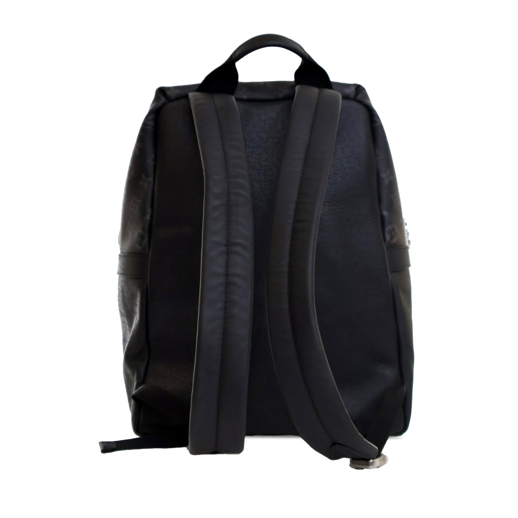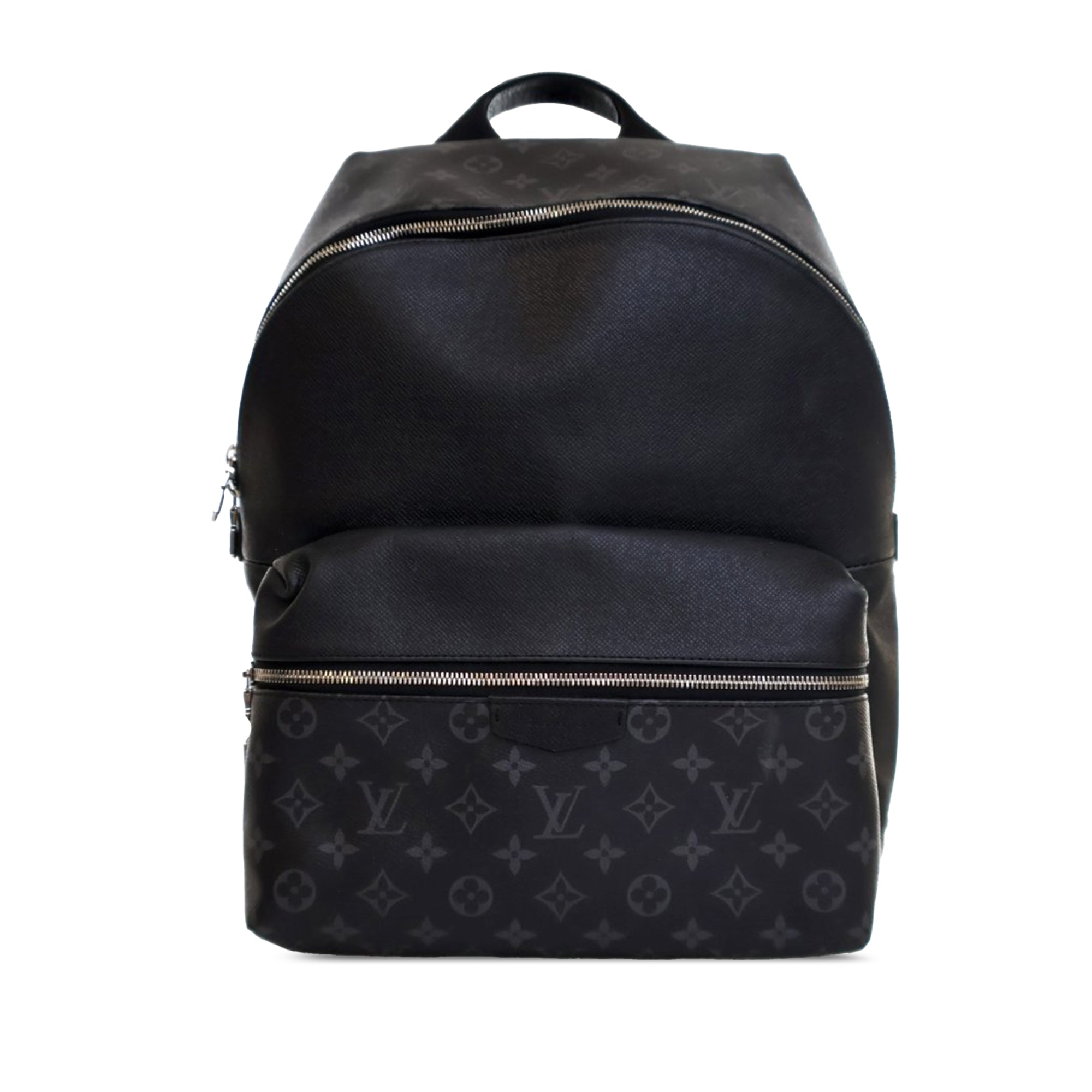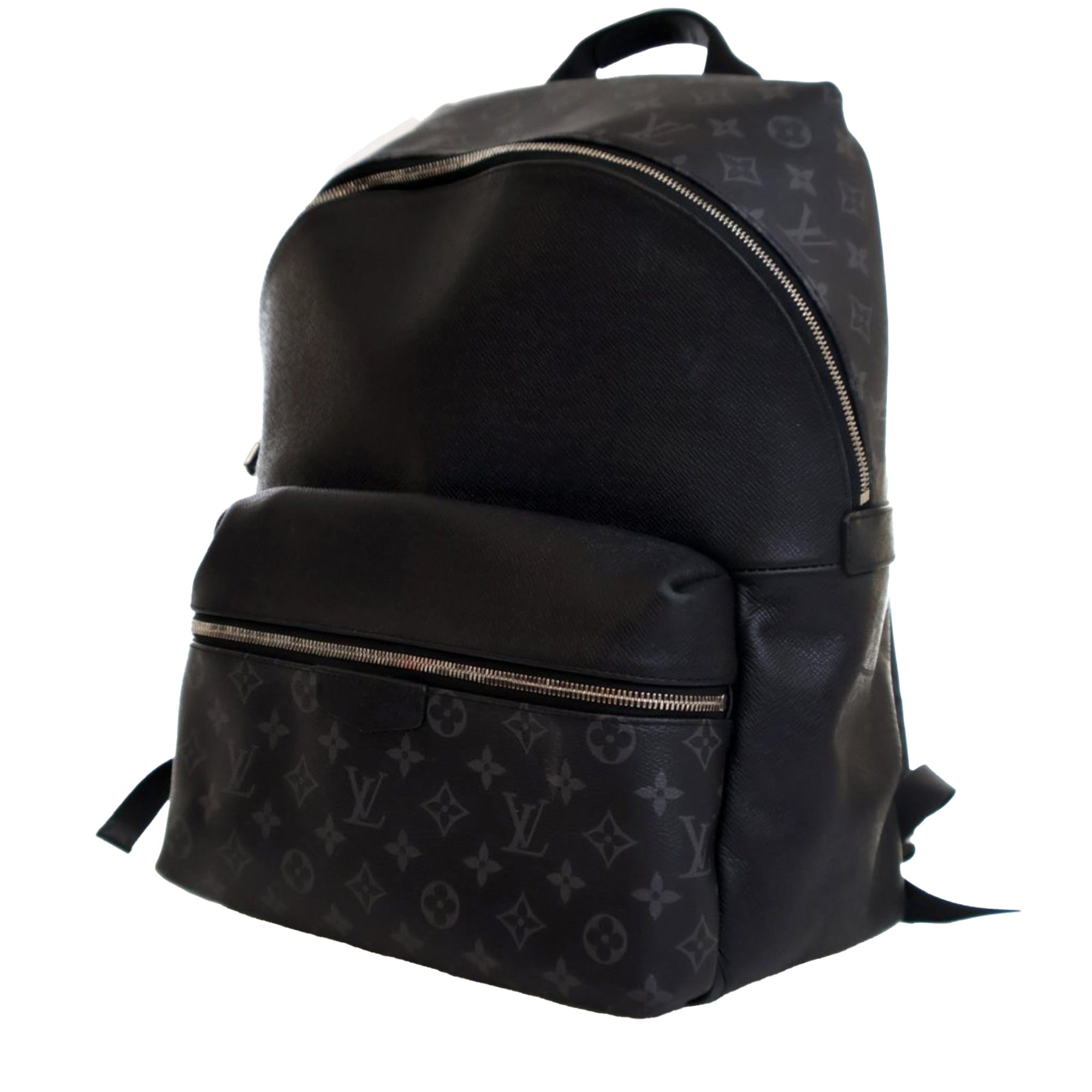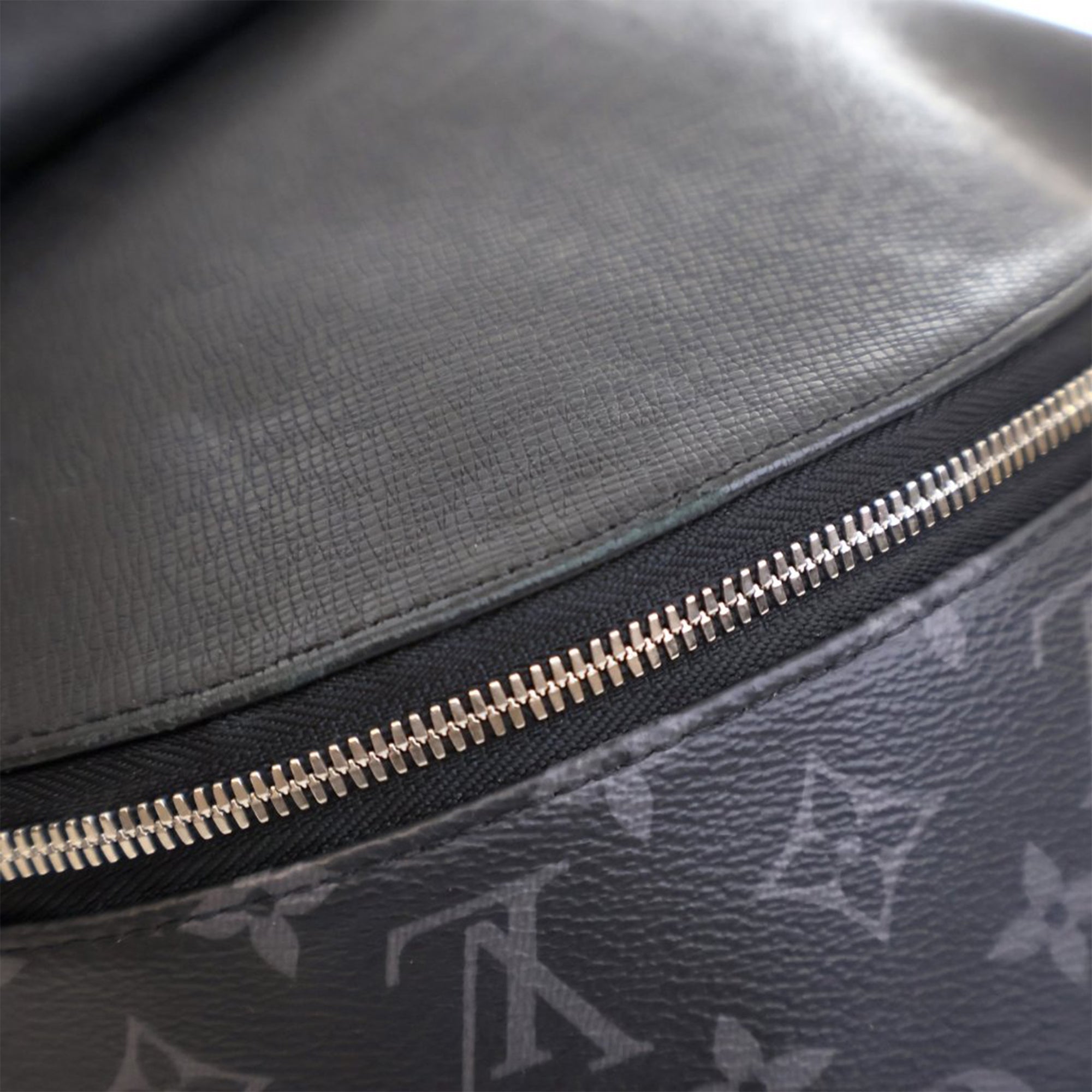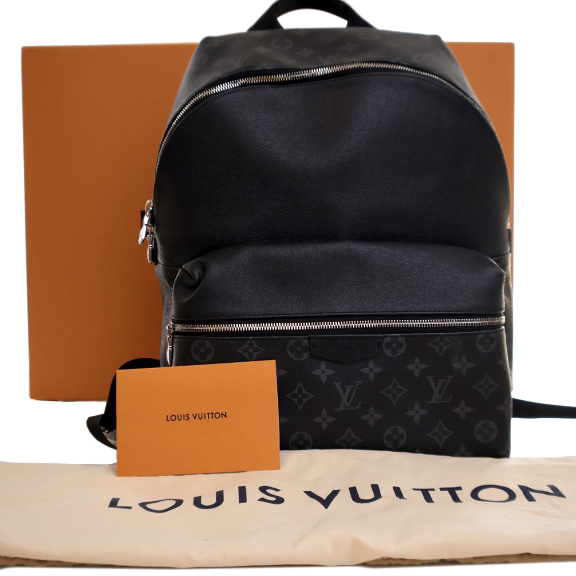 Product Details: Black Louis Vuitton Taigarama Eclipse Discovery Backpack. The Discovery Backpack features a taiga leather and monogram canvas body, a flat top handle, adjustable flat back straps, a top zip closure, an exterior zip pocket, and interior slip pockets. 14" L x 9.8" W x 5.5" D, 5.1" drop.