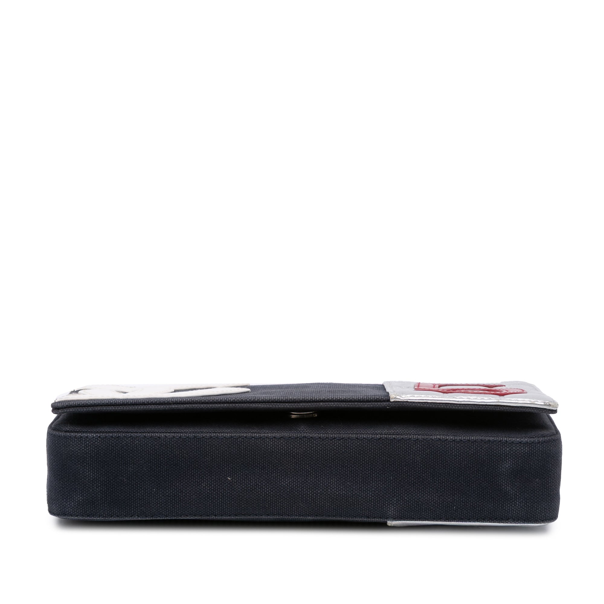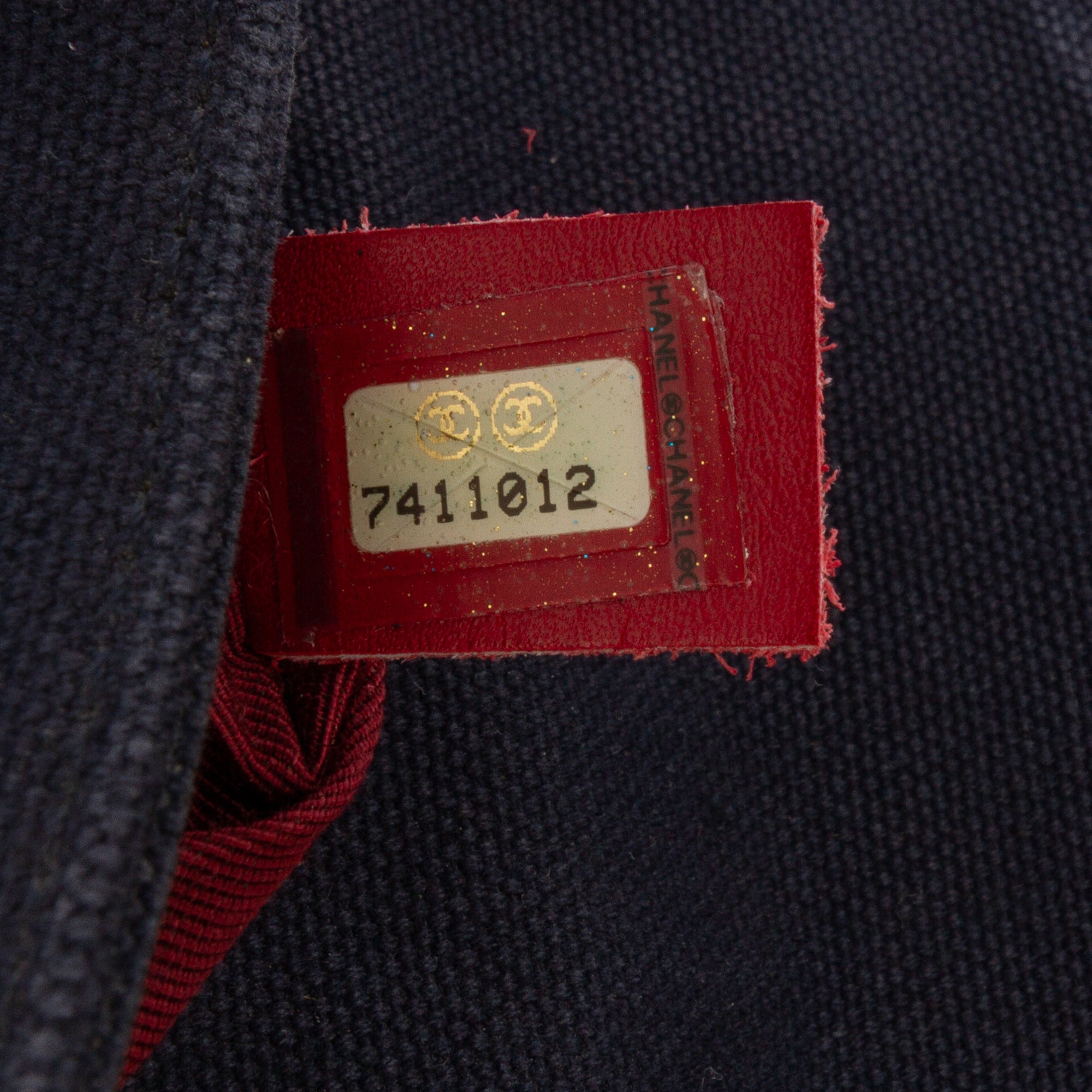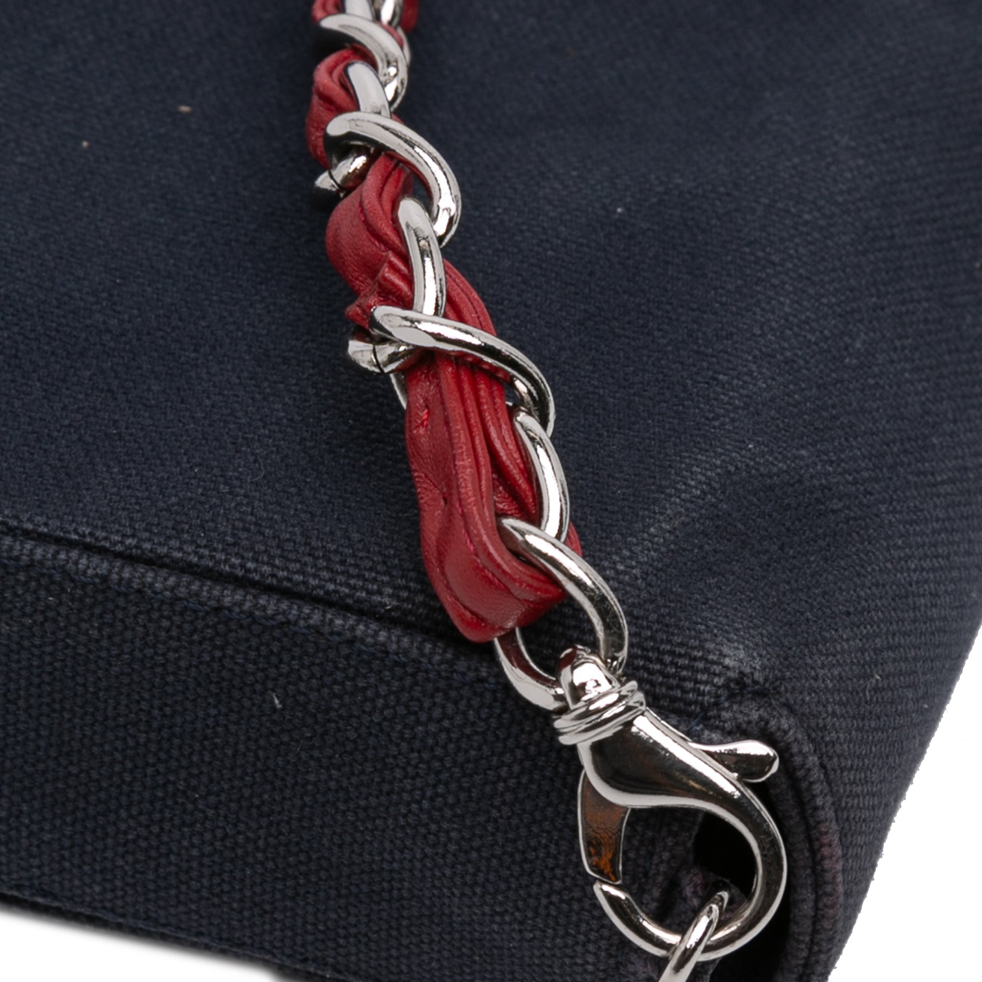 Product Details: Blue Chanel Multicolor Canvas and Leather No.5 Flap Shoulder Bag. The No. 5 flap features a canvas body with leather trim, a leather woven chain link strap, a front flap with magnetic snap closure, and an interior zip pocket. 5.1" L x 9.6" W x 2" D. Serial number 7411012.
