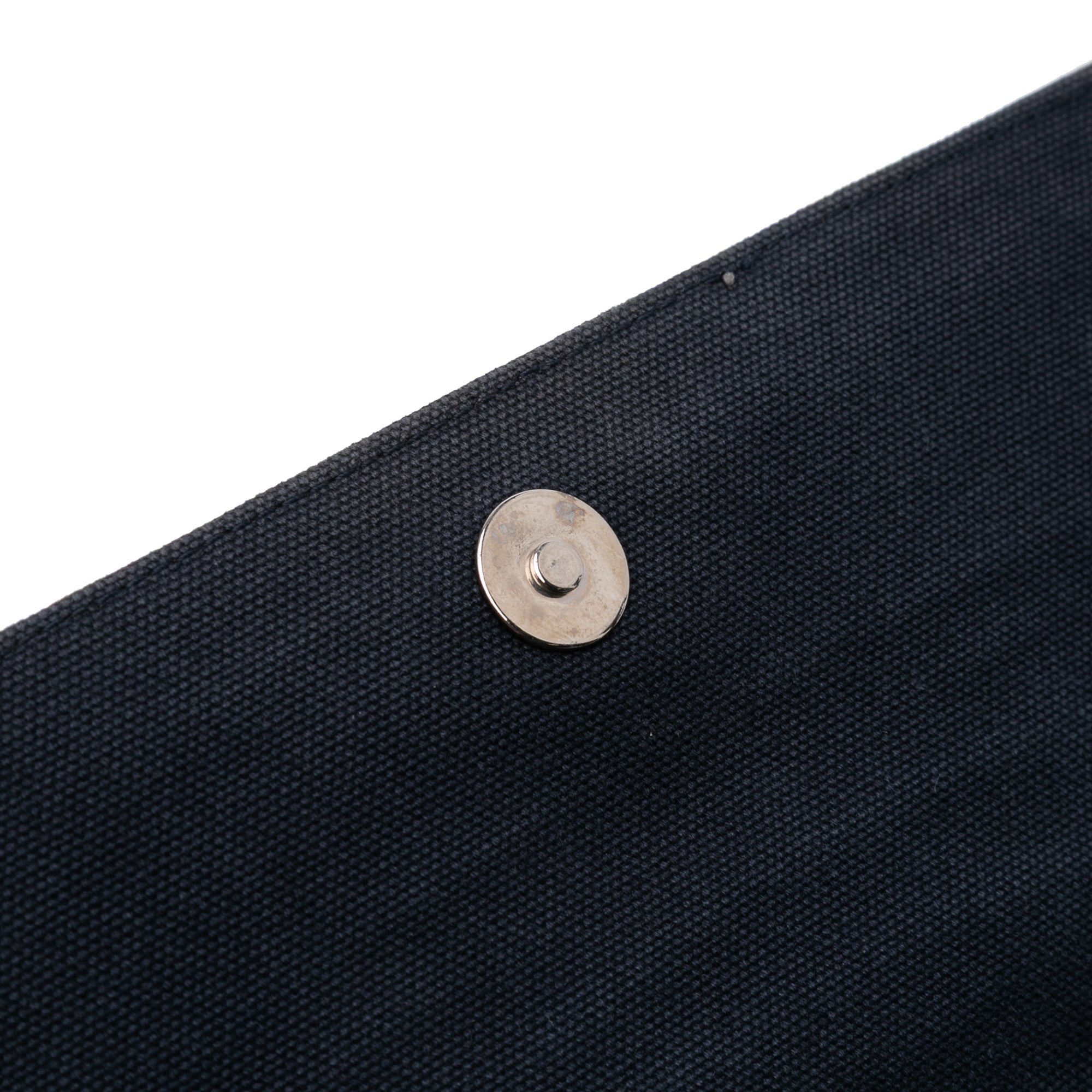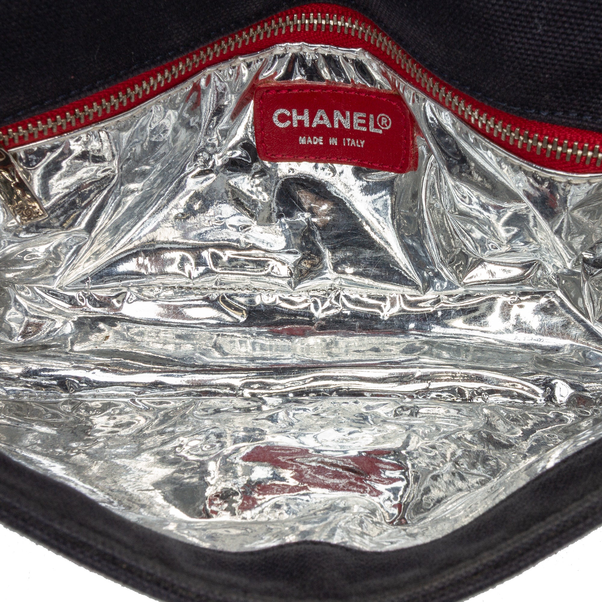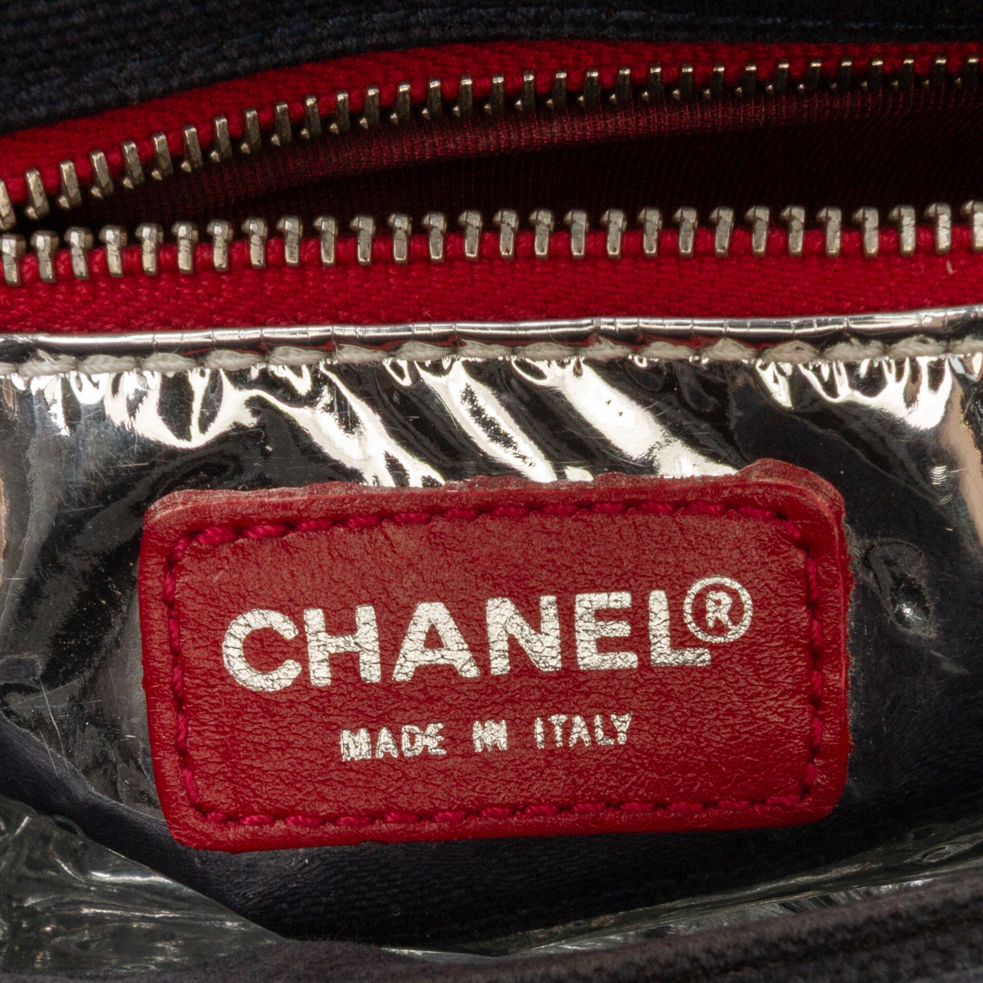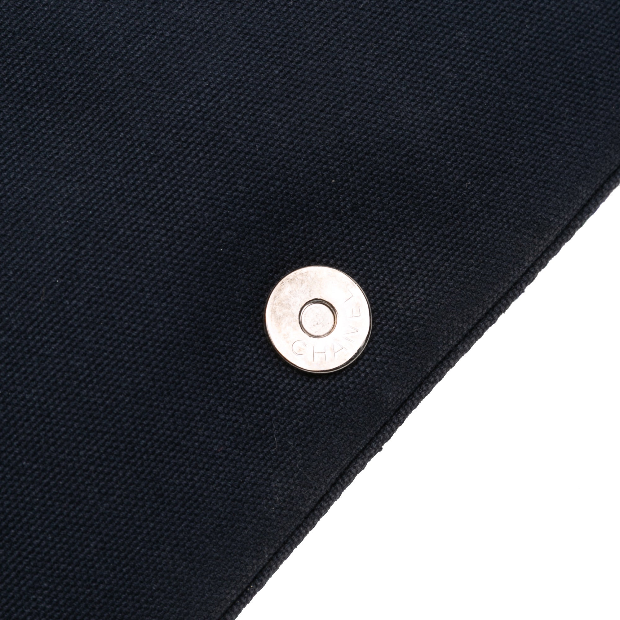 Product Details: Blue Chanel Multicolor Canvas and Leather No.5 Flap Shoulder Bag. The No. 5 flap features a canvas body with leather trim, a leather woven chain link strap, a front flap with magnetic snap closure, and an interior zip pocket. 5.1" L x 9.6" W x 2" D. Serial number 7411012.