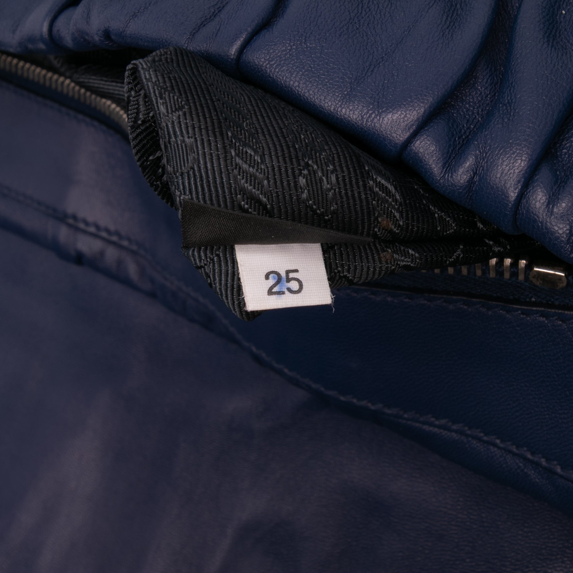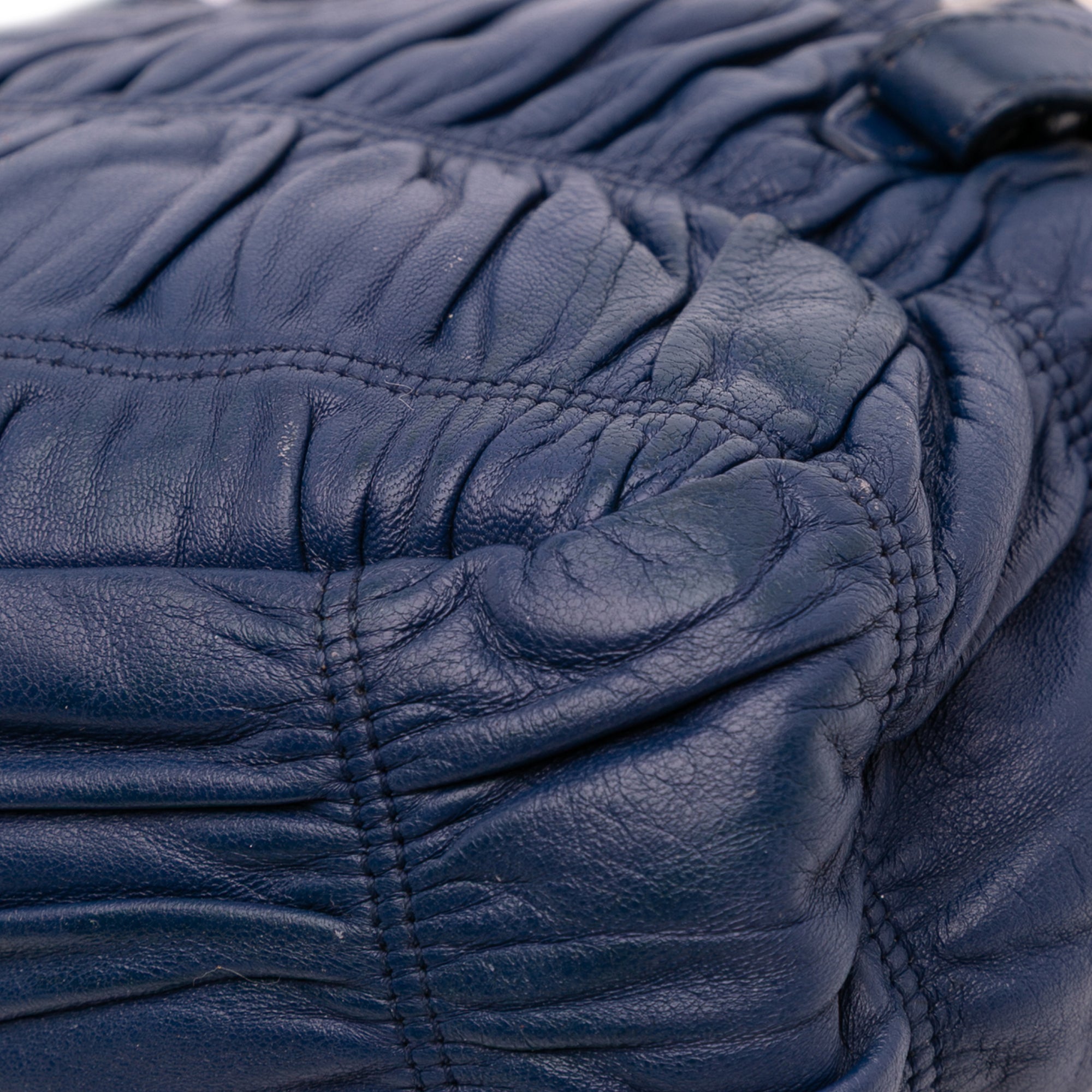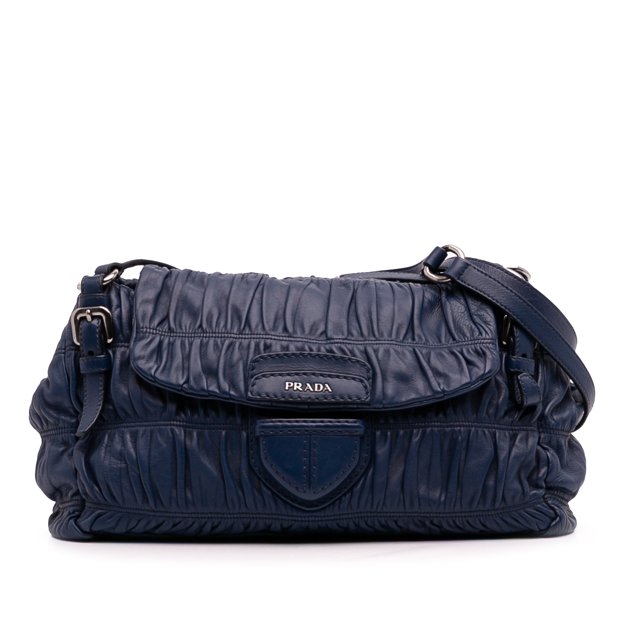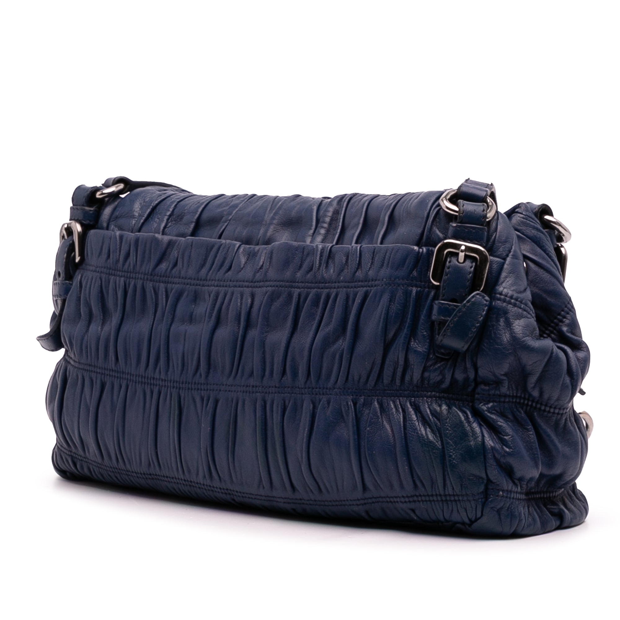 Product Details: Blue Prada Nappa Gaufre Shoulder Bag. This shoulder bag features a gathered nappa leather body, flat leather straps, a front flap with push lock closure, an exterior back slip pocket, and interior zip and slip pockets. 8.1" L x 11.2" W x 3.5" D.