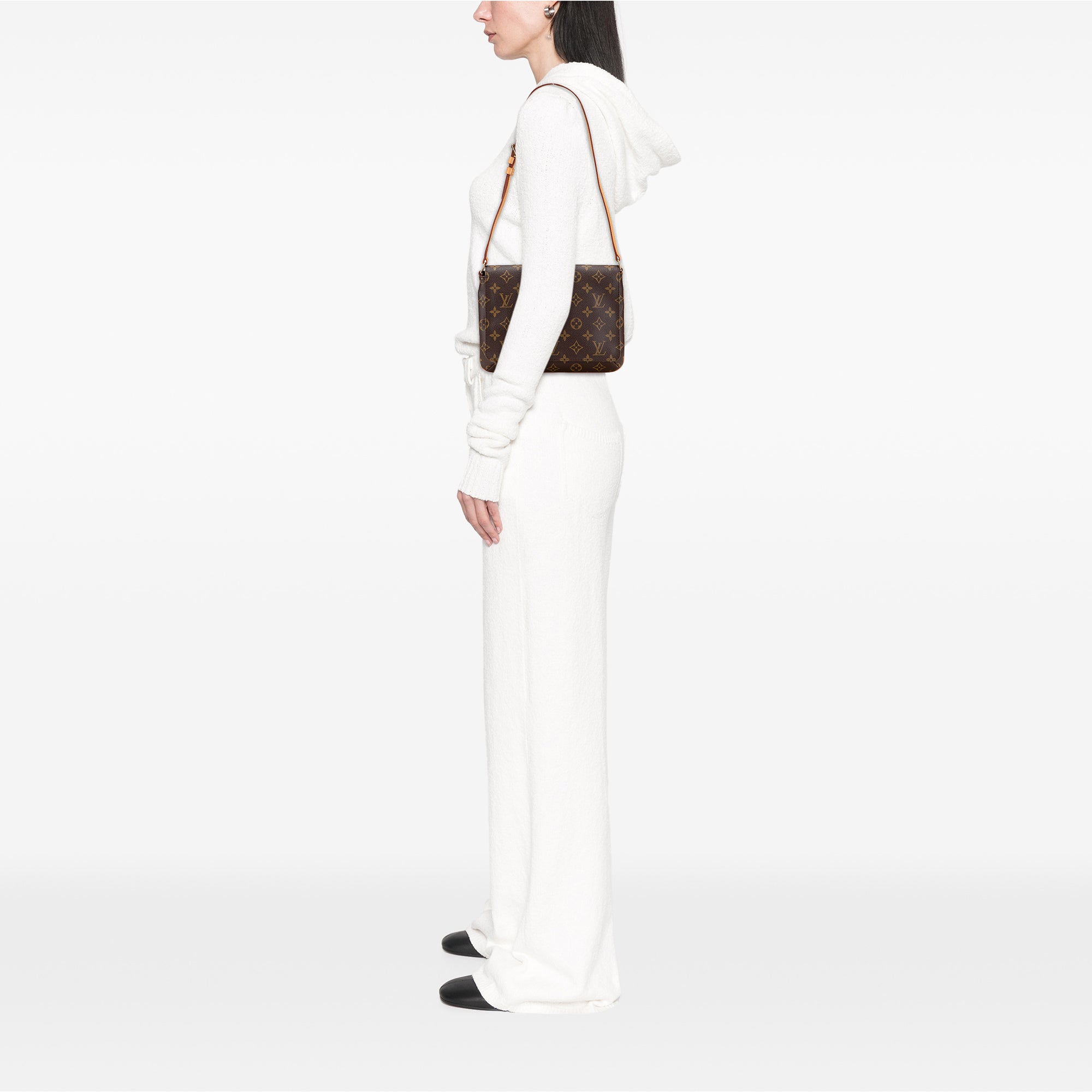 Product Details: Brown Louis Vuitton Monogram Musette Tango Short Strap Shoulder Bag. The Musette Tango features a monogram canvas body, a flat vachetta leather shoulder strap, a front flap with a magnetic closure, and an interior slip pocket. 7.1" L x 9.4" W x 1.2" D. Serial number SP1011.