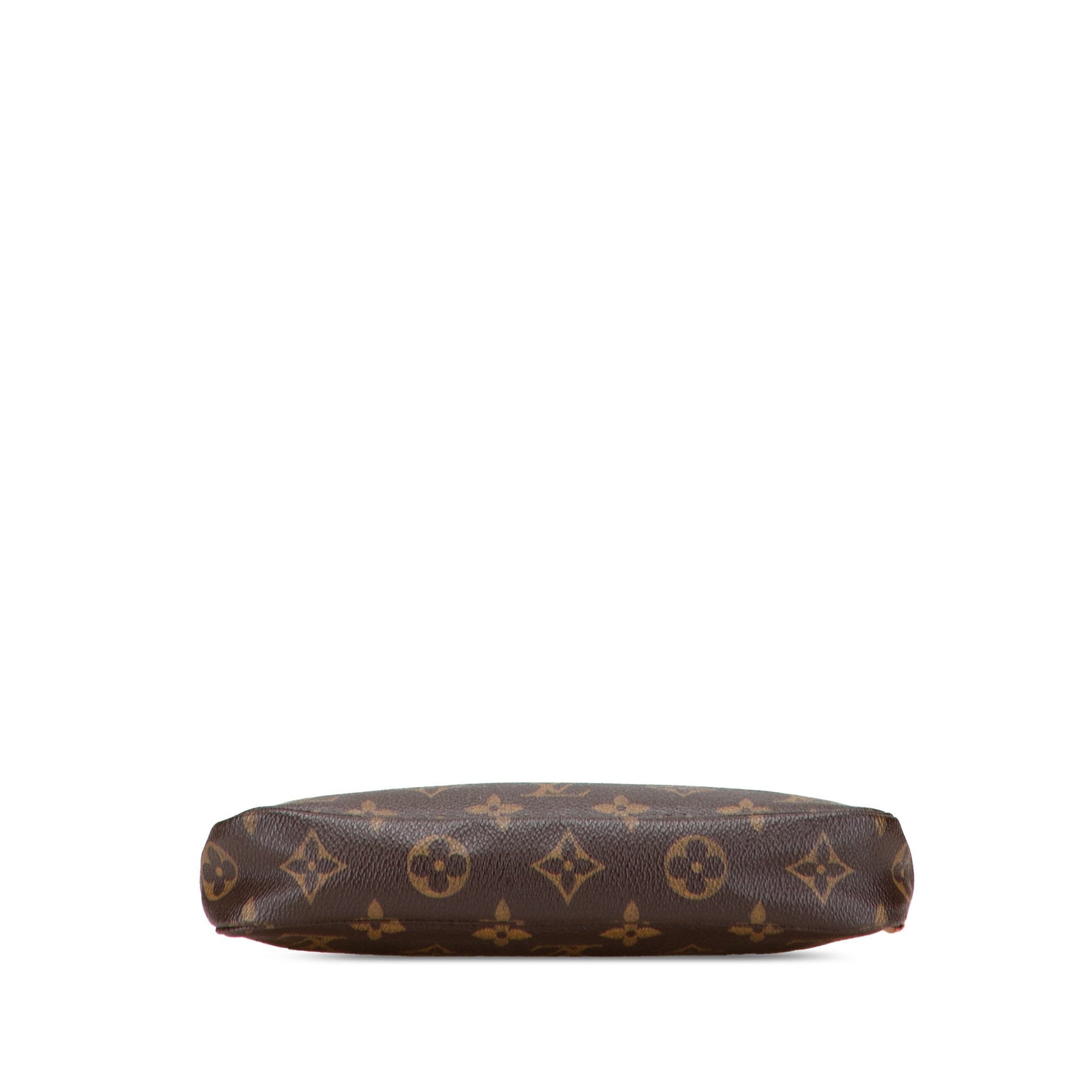 Product Details: Brown Louis Vuitton Monogram Pochette Accessoires Shoulder Bag. The Pochette Accessoires features a monogram canvas body, a flat vachetta leather handle, and a top zip closure. 4.9" L x 8.3" W x 1.4" D. Serial number CA1077.