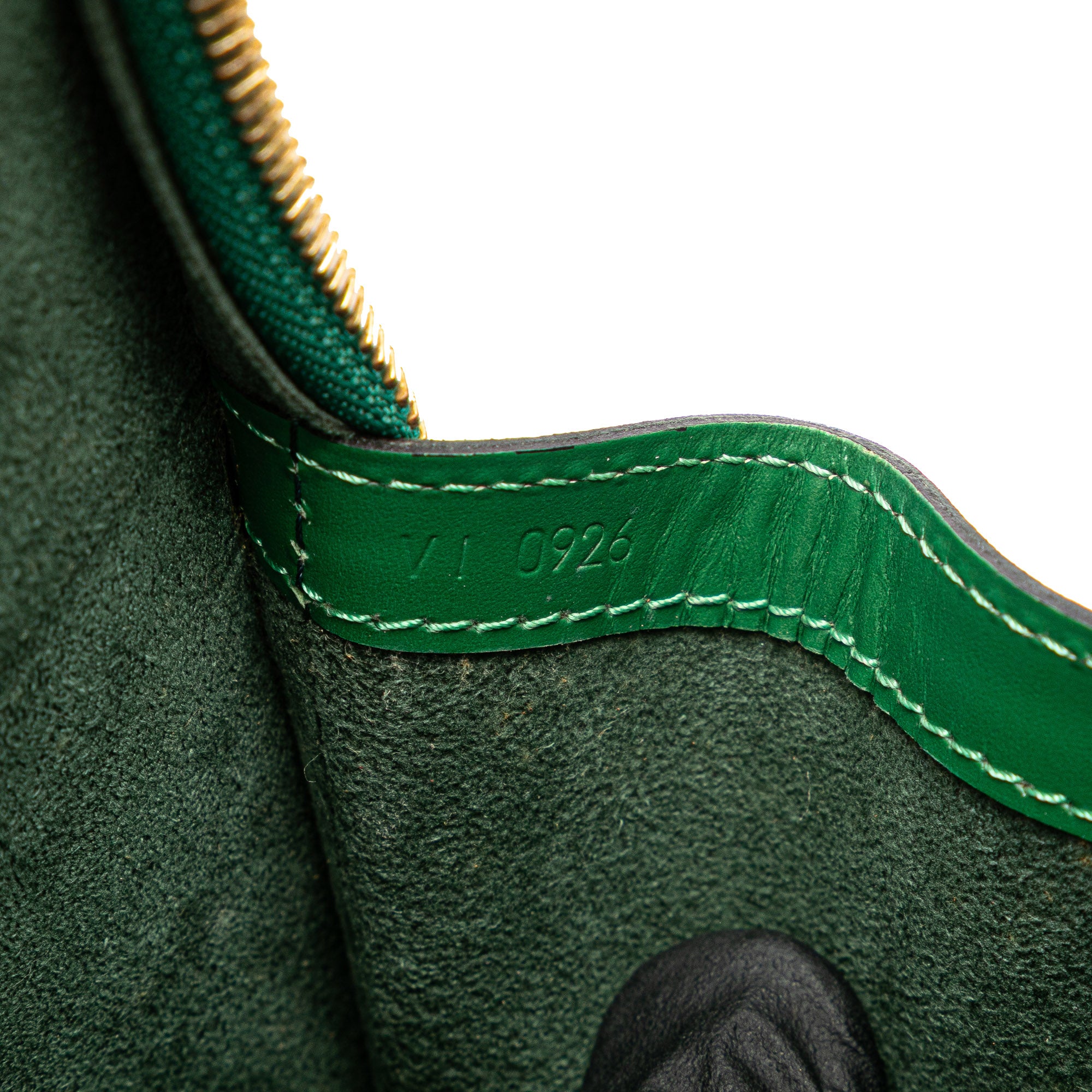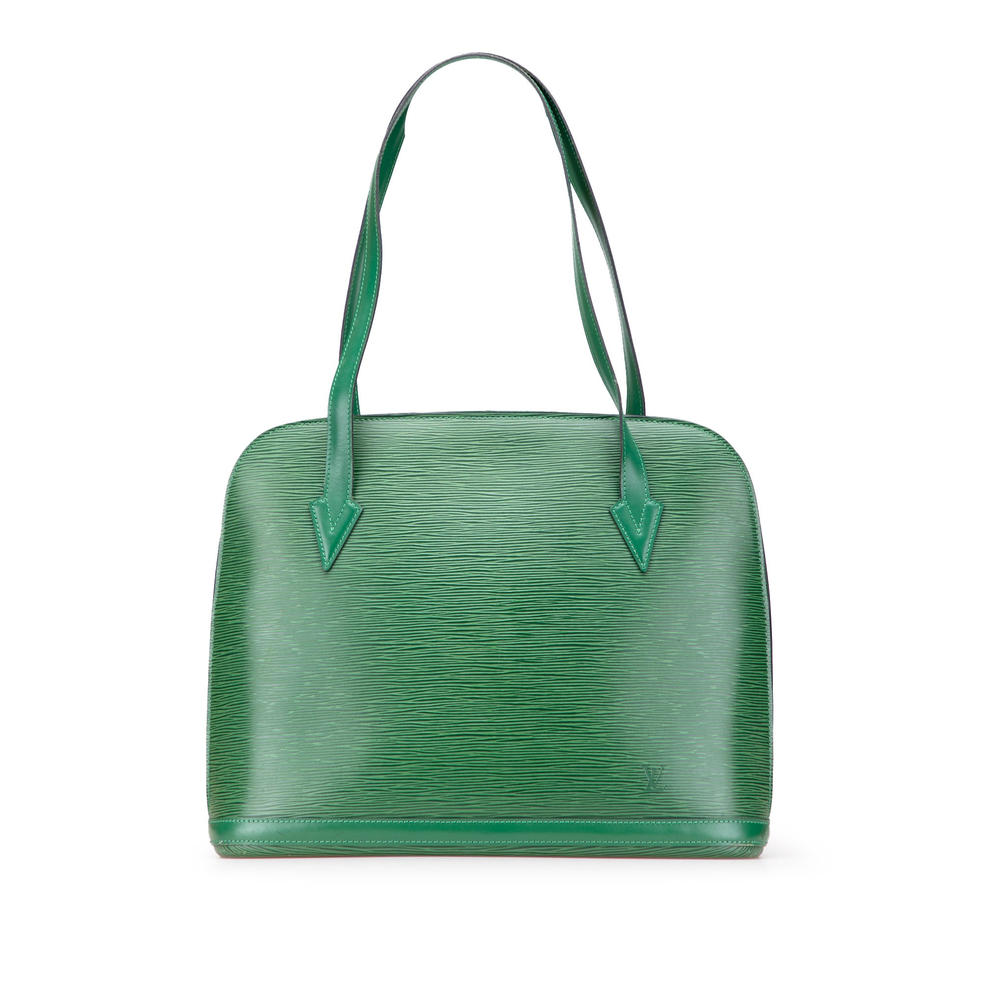 Product Details: Green Louis Vuitton Epi Lussac Shoulder Bag. The Lussac features an epi leather body, flat straps, a top zip closure, and an interior zip pocket. 11.8" L x 14.6" W x 4.5" D, 10" drop. Serial number VI0926.