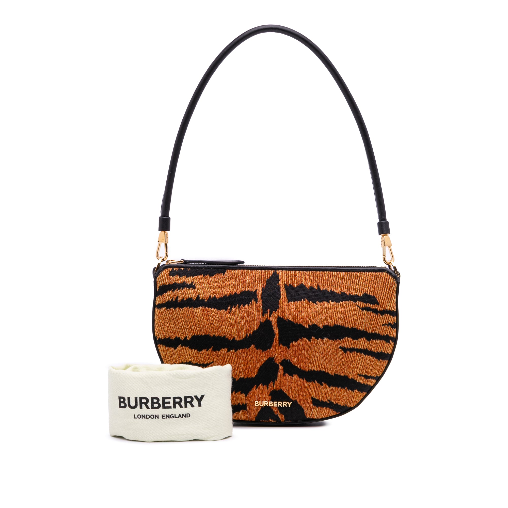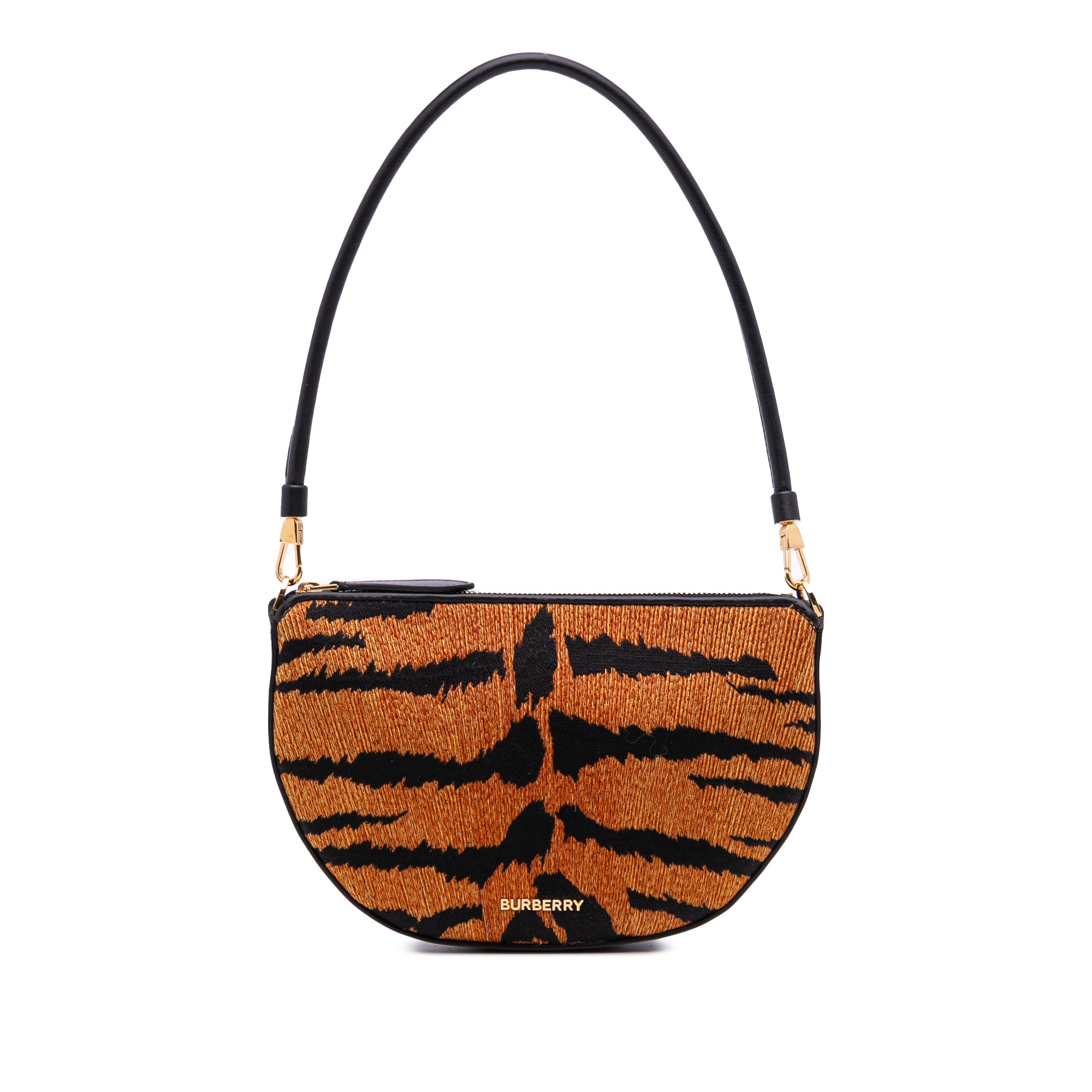Product Details: Orange Burberry Mini Canvas Tiger Print Olympia Shoulder Bag. The Olympia shoulder bag features a printed canvas body with leather trim, a detachable rolled leather strap, and a top zip closure. 5.5" L x 8.3" W x 1.6" D. Serial number DALBSRL2390AL.