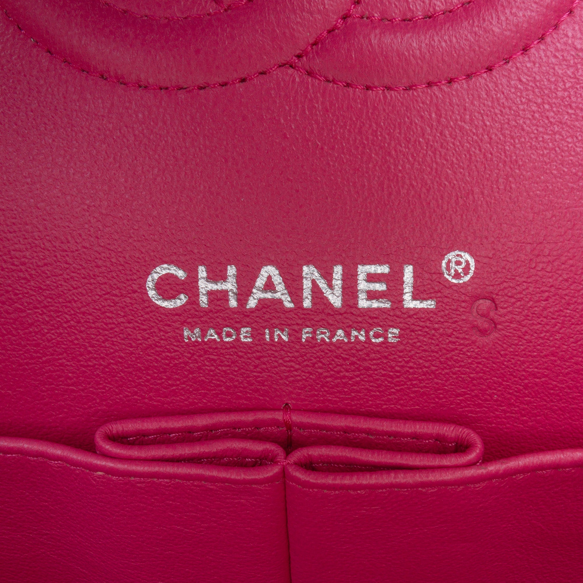 Product Details: Pink Chanel Medium Classic Lambskin Double Flap Shoulder Bag. This shoulder bag features a quilted lambskin body, leather woven chain link straps, double front flaps with interlocking Cs and a twist lock closure, an exterior back slip pocket, and interior zip and slip pockets. 6.3" L x 9.8" W x 2.8" D. Serial number 19369779.