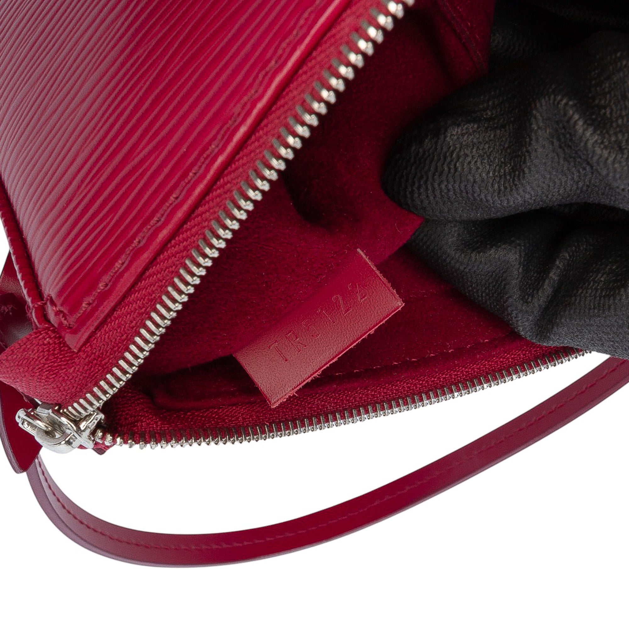 Product Details: Red Louis Vuitton Epi Pochette Accessoires Shoulder Bag. The Pochette Accessoires features an epi leather body, a flat leather shoulder strap, a top zip closure, and an interior slip pocket. 5.5" L x 8.7" W x 1.4" D, 9.1" drop. Serial number TR5122.