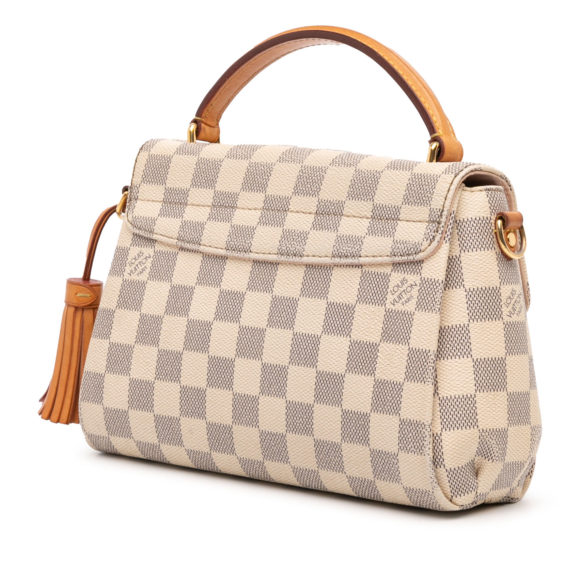 Product Details: White Louis Vuitton Damier Azur Croisette Satchel. The Croisette features a damier azur canvas body with vachetta leather trim, a leather tassel detail, a flat vachetta leather top handle, a detachable flat vachetta leather strap, a front flap with a gold-tone push-lock closure, and an interior slip pocket. 6.5" L x 8.7" W x 2.8" D, 2.6" drop. Serial number FL3137.