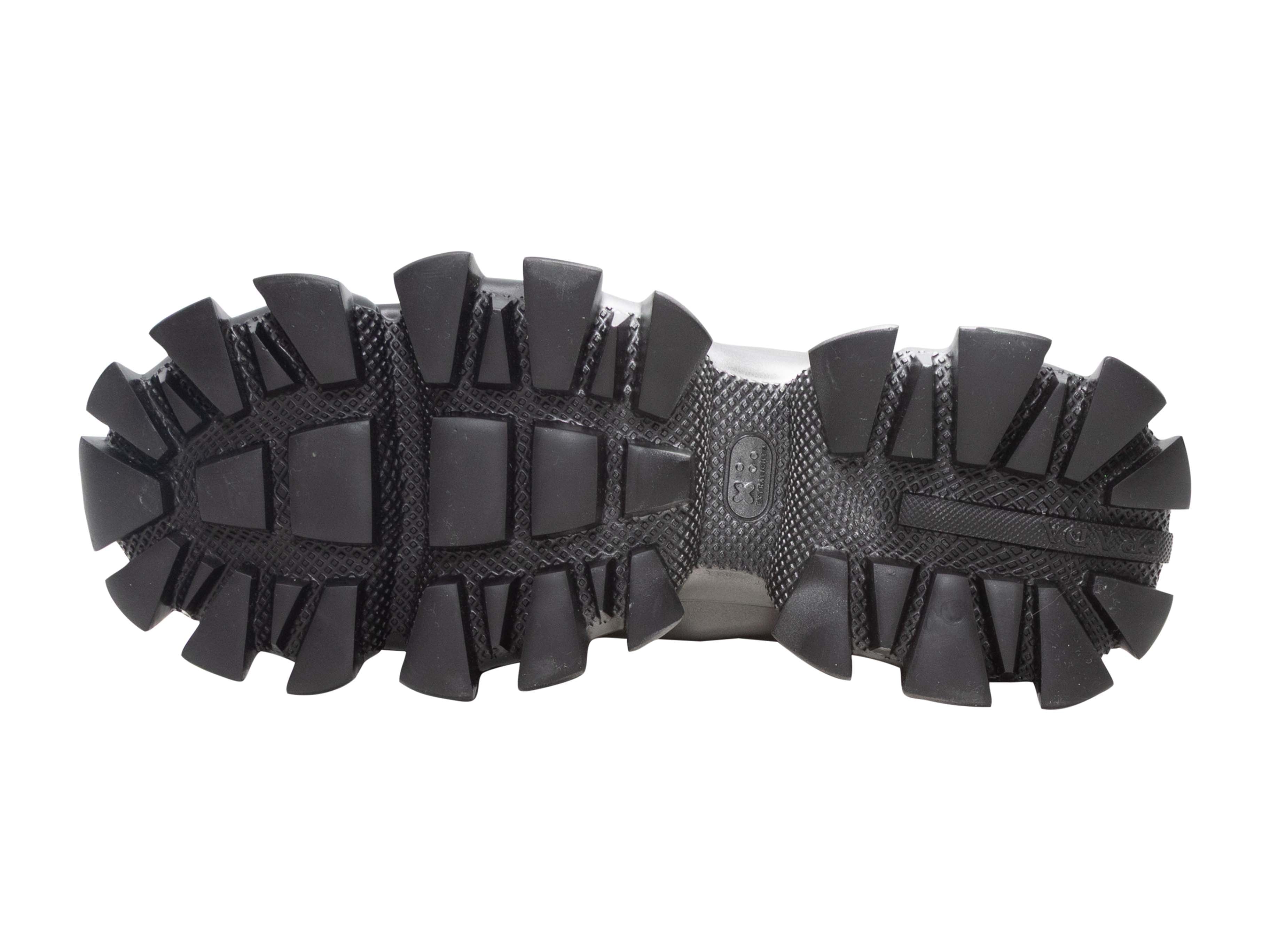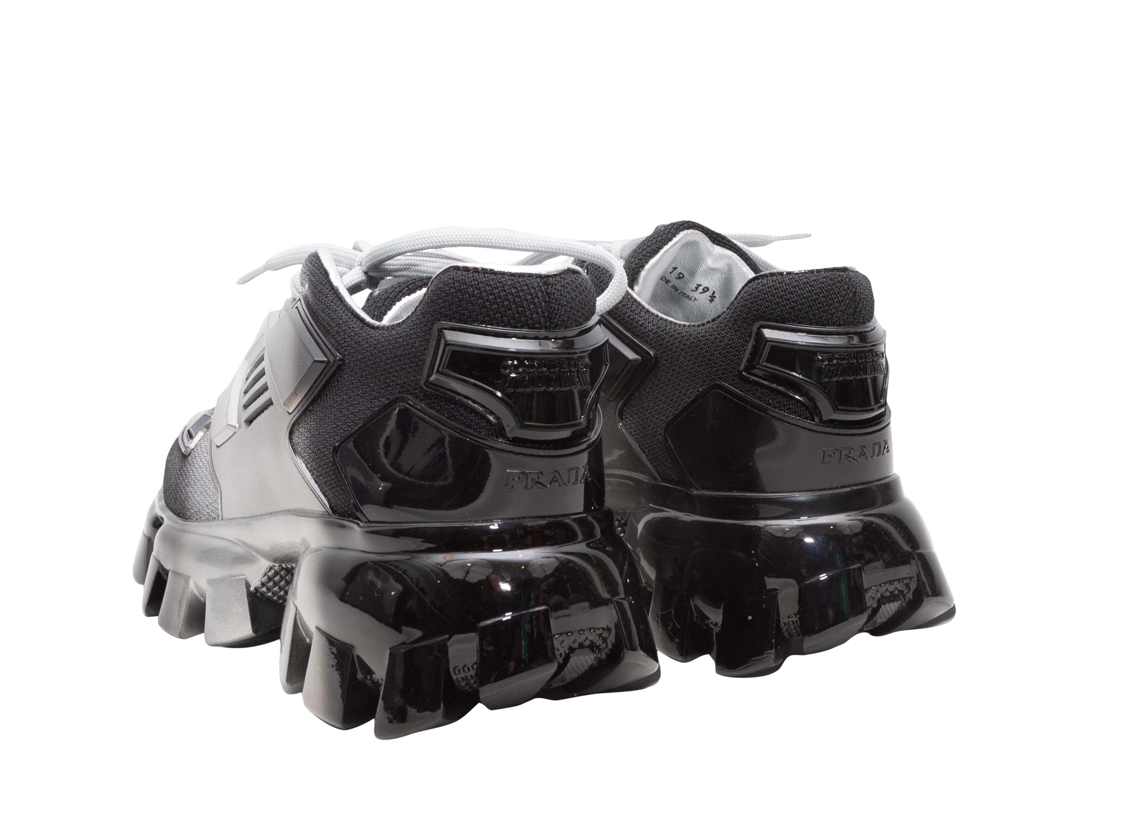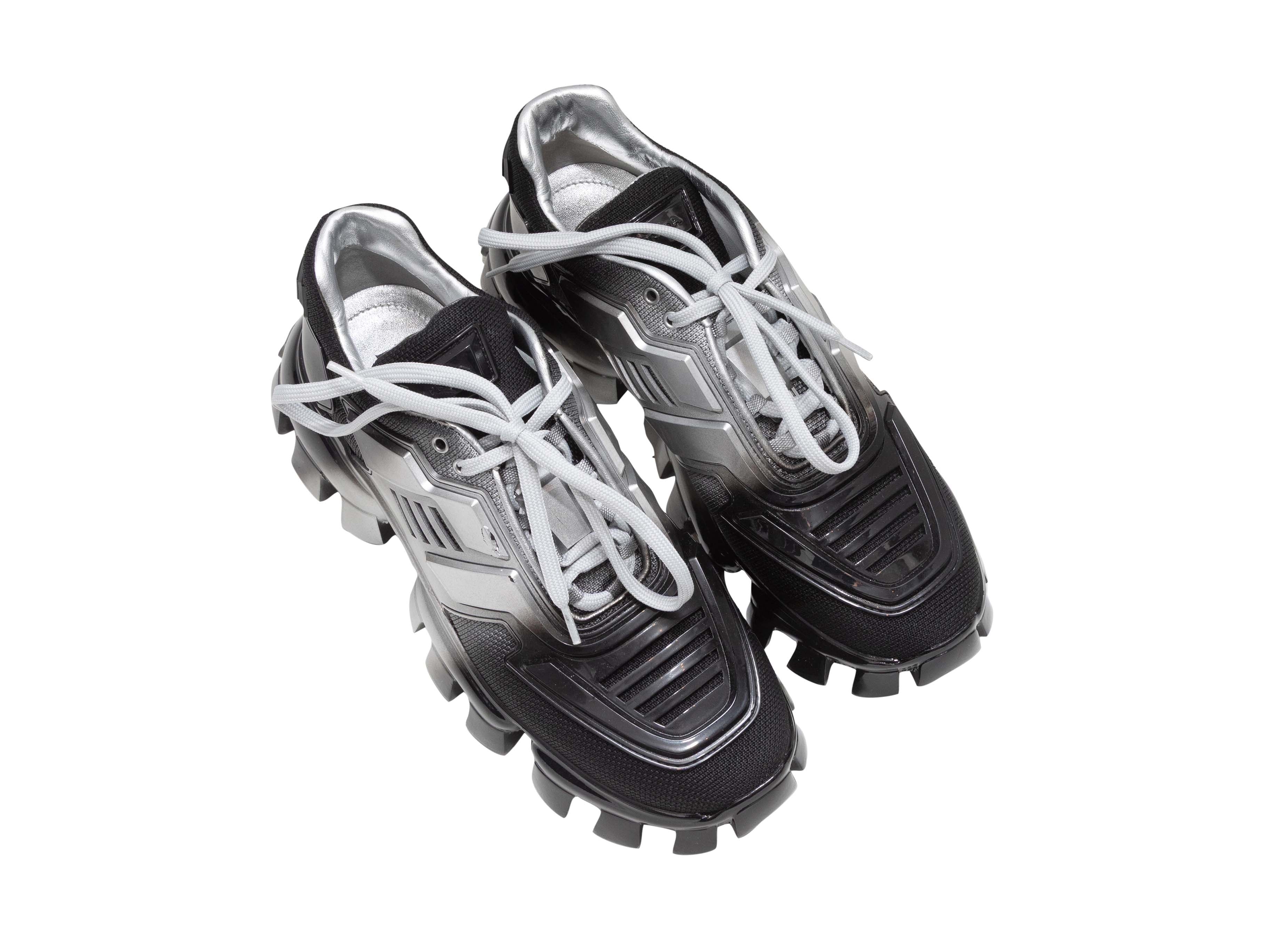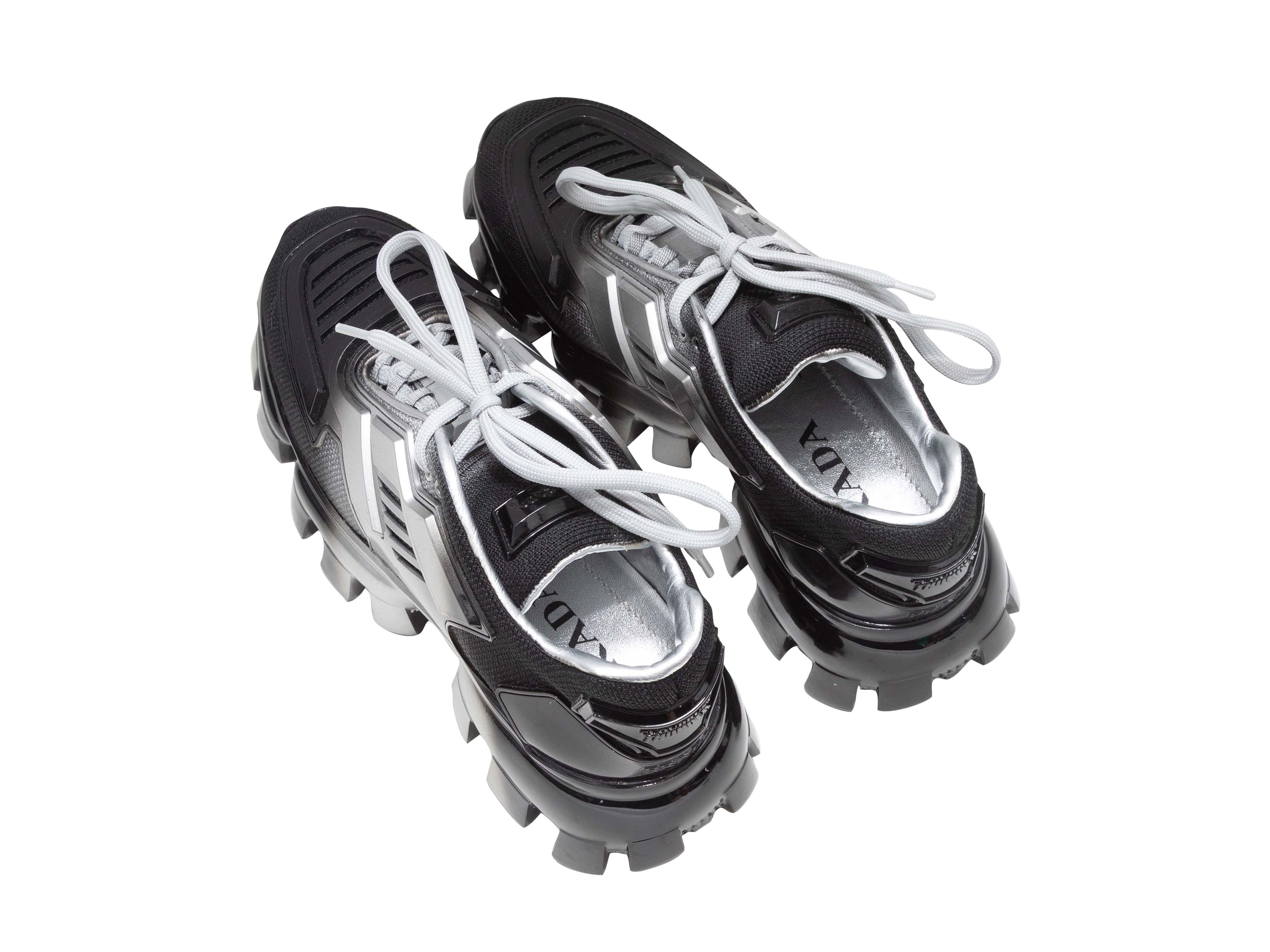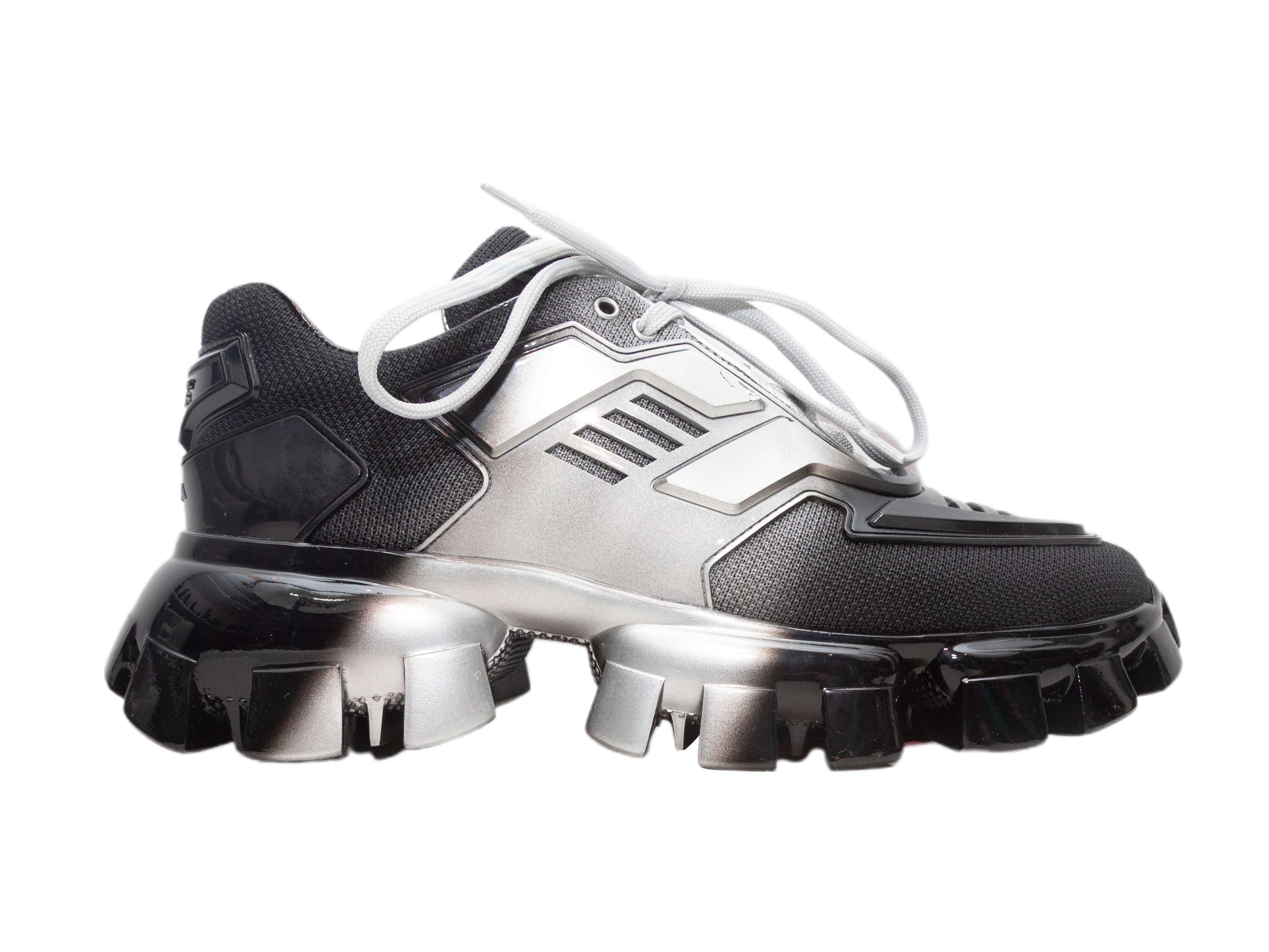 Product Details: Black and silver chunky low-top Cloudbust sneakers by Prada. Lug soles. Lace-up tie closures at tops. 2.5" platform height, 4" heel height.
