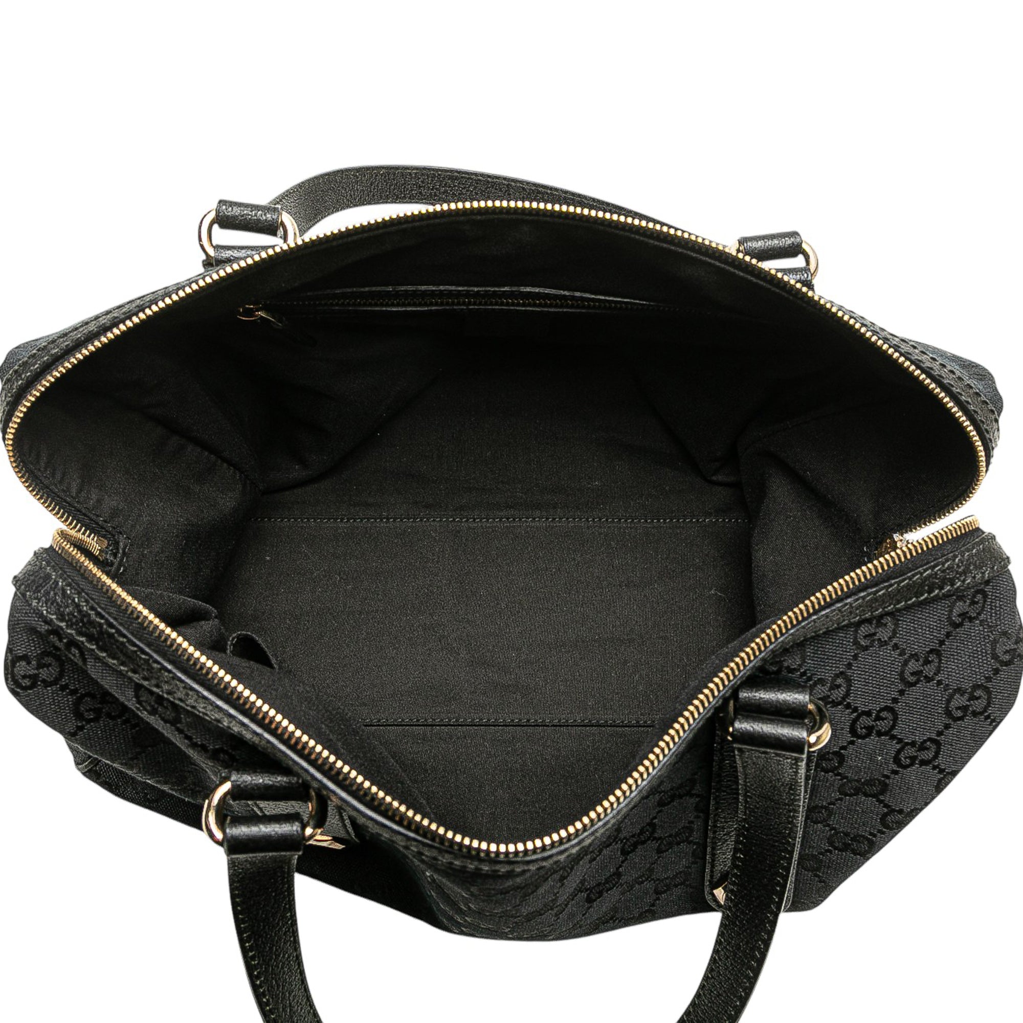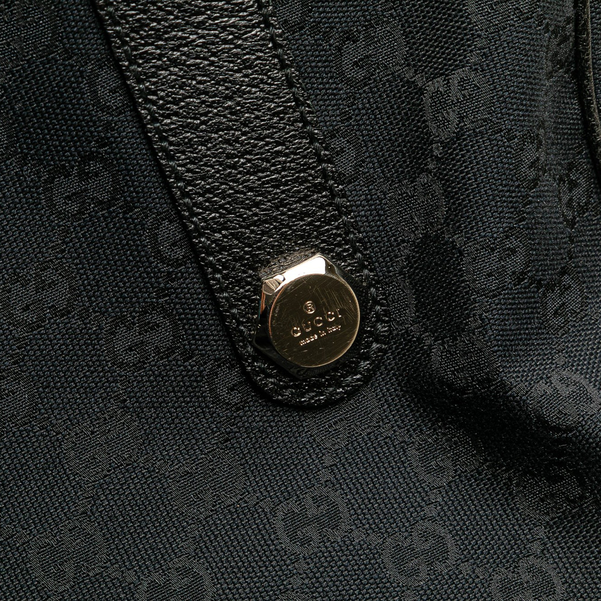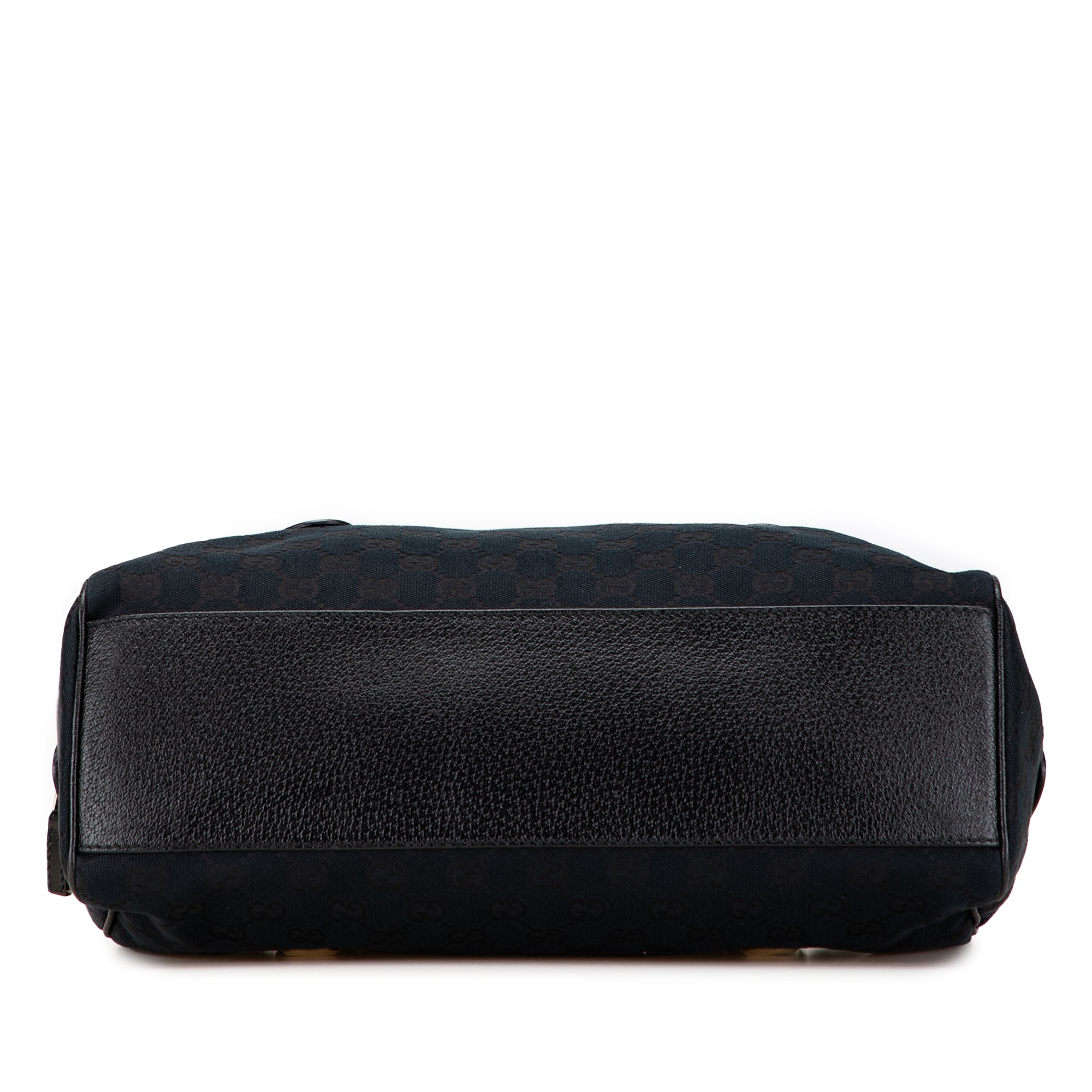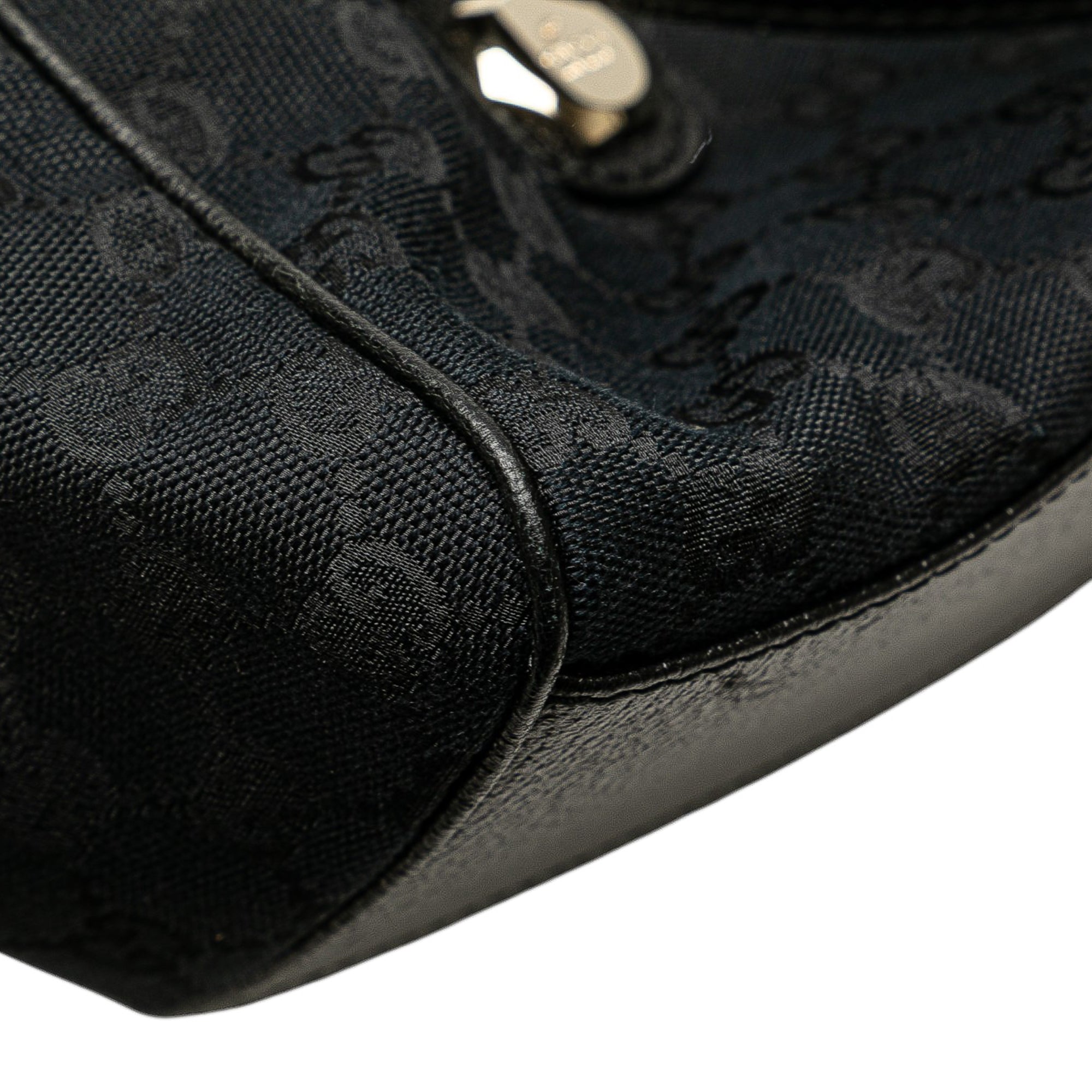 Product Details: Black Gucci GG Canvas Charmy Shoulder Bag. The Charmy shoulder bag features a canvas body with leather trim, flat leather straps, a top zip closure, and interior zip and slip pockets. 7.9" L x 13.4" W x 4.3" D, 7.5" drop. Serial number 154180 214397.