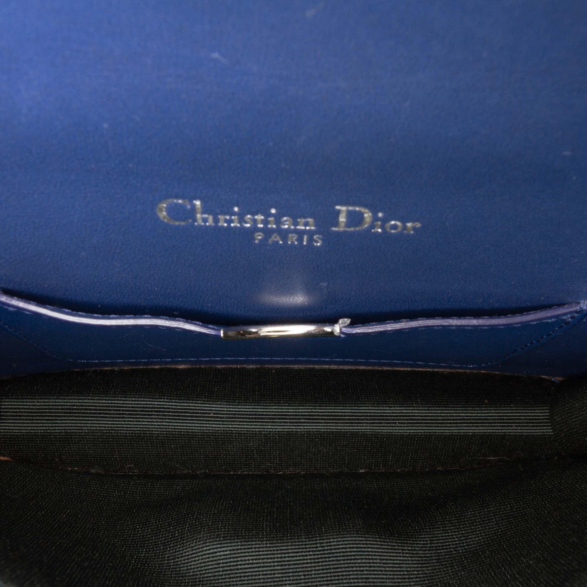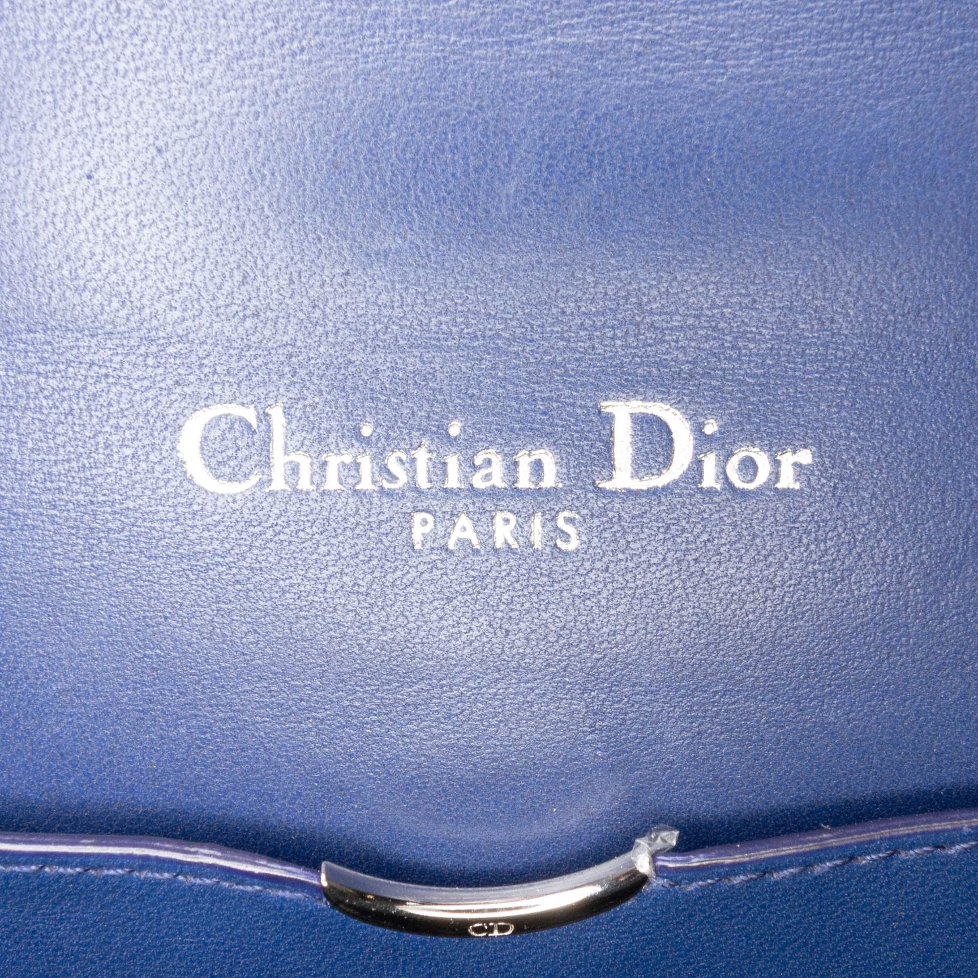 Product Details: Blue Dior Mini Lambskin Diorama Flap Crossbody Bag. This crossbody bag features a leather body, a silver-tone chain strap, a front flap with a push lock closure, and an interior slip pocket. 4.3" L x 7.1" W x 1.4" D. Serial number 13-BO-0145.