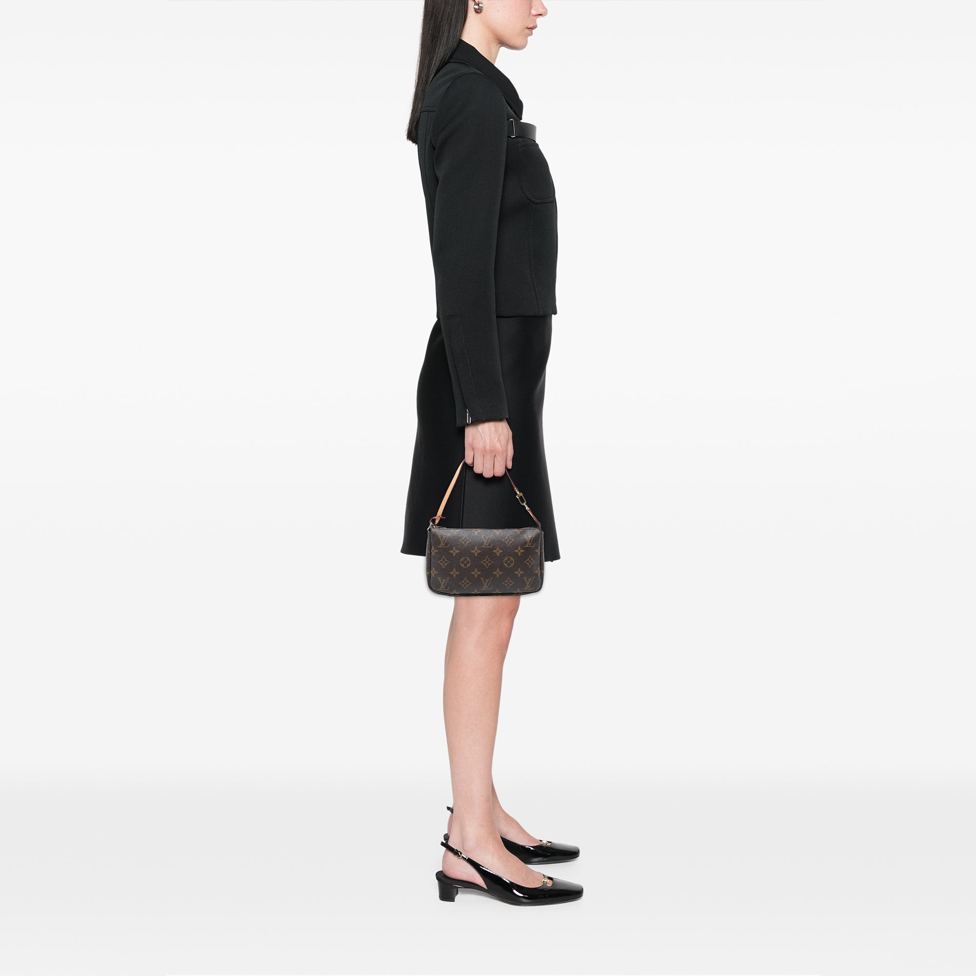 Product Details: Brown Louis Vuitton Monogram Pochette Accessoires Shoulder Bag. The Pochette Accessoires features a monogram canvas body, a flat vachetta leather strap, and a top zip closure. The sides were repainted. 5.1" L x 8.3" W x 1.6" D, 6.9" drop. Serial number BJ0072.