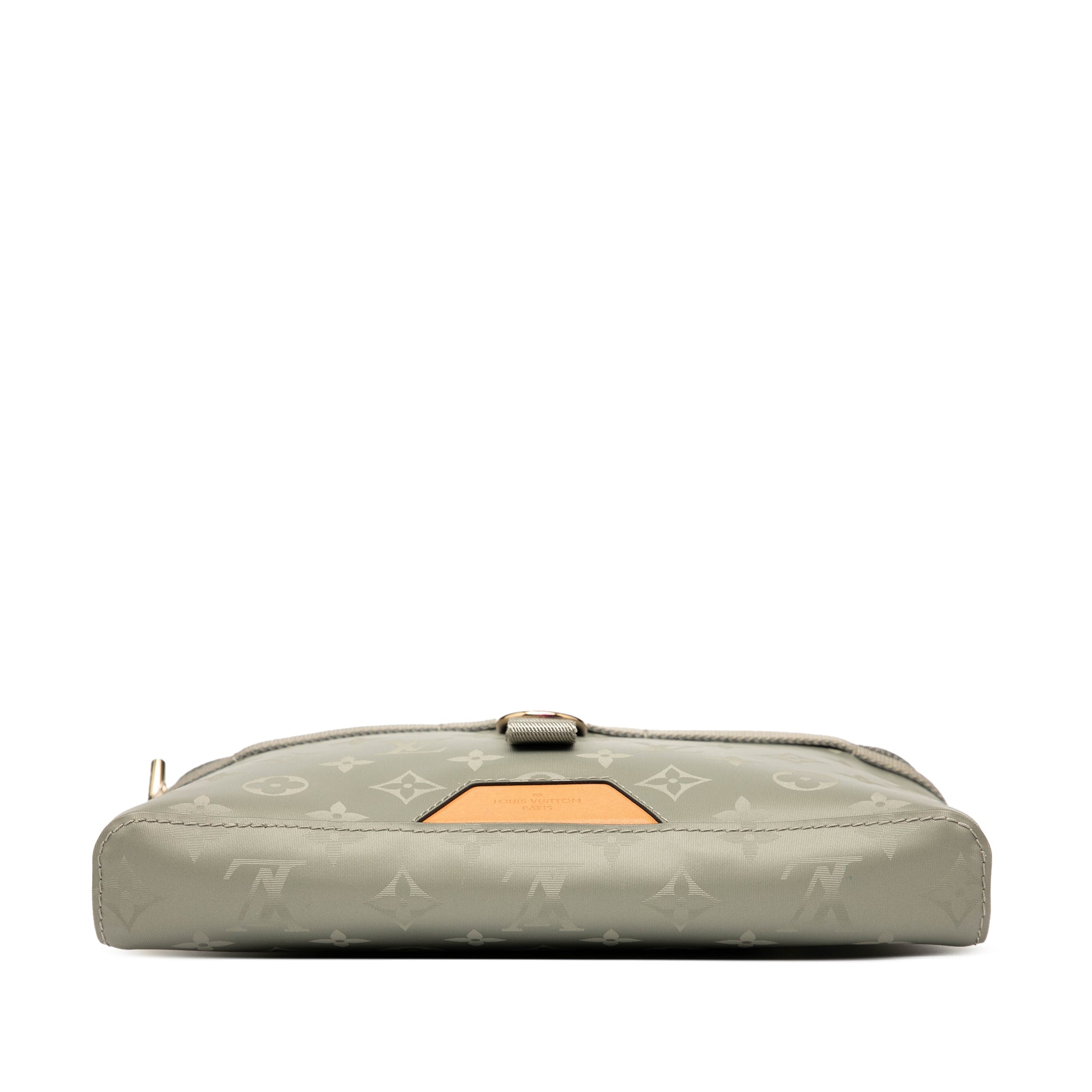 Product Details: Gray Louis Vuitton Monogram Titanium Messenger PM Crossbody Bag. This crossbody features a nylon body, a flat vachetta leather and nylon shoulder strap, a zip around closure, and interior slip pockets. 6.9" L x 10" W x 1.6" D. Serial number PL3158.