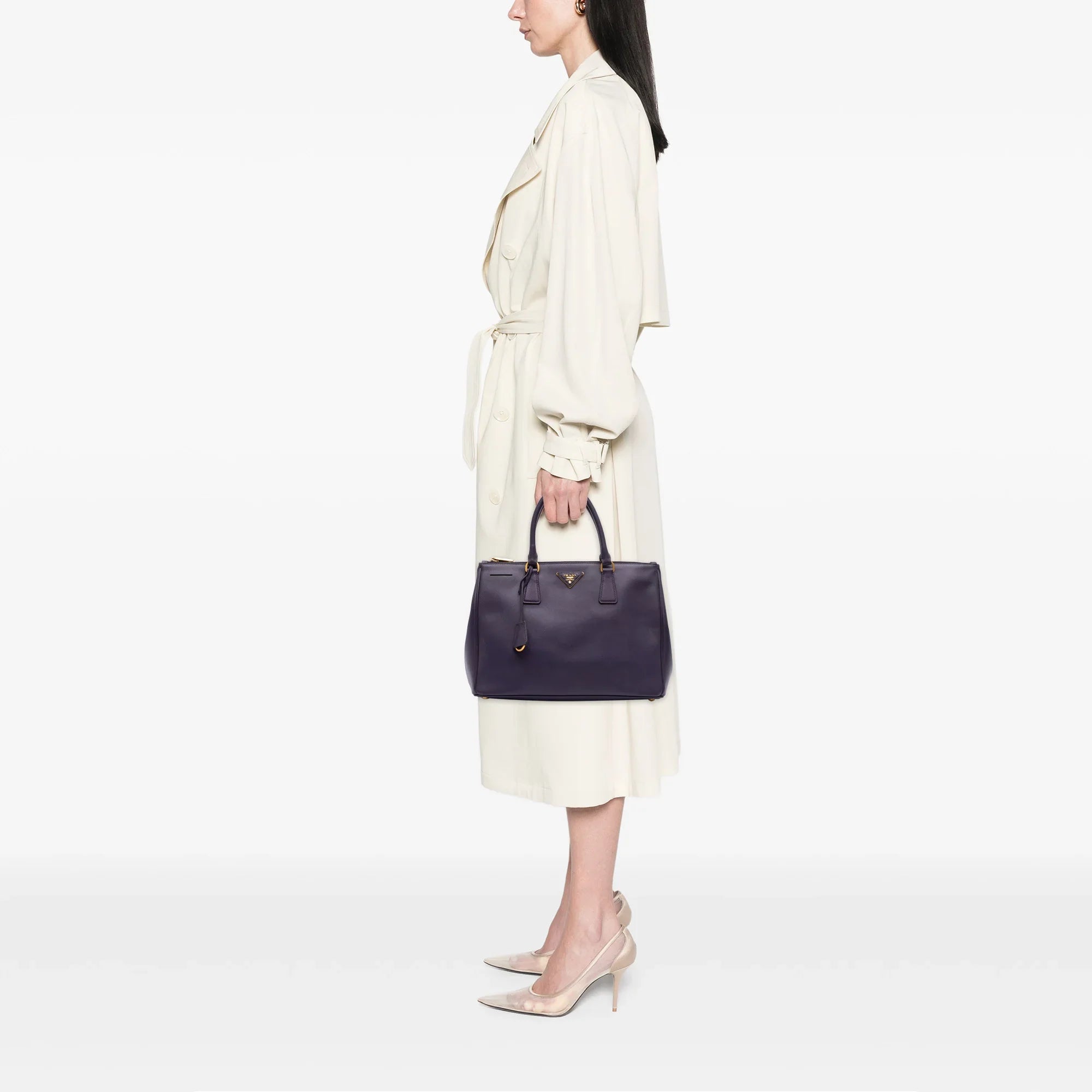 Product Details: Purple Prada Medium Saffiano Lux Galleria Double Zip Satchel. The Galleria features a saffiano leather body, rolled leather handles, an open top, double zip compartments, and interior zip and slip pockets. 9.6" L x 13.4" W x 6.1" D, 5.3" drop.