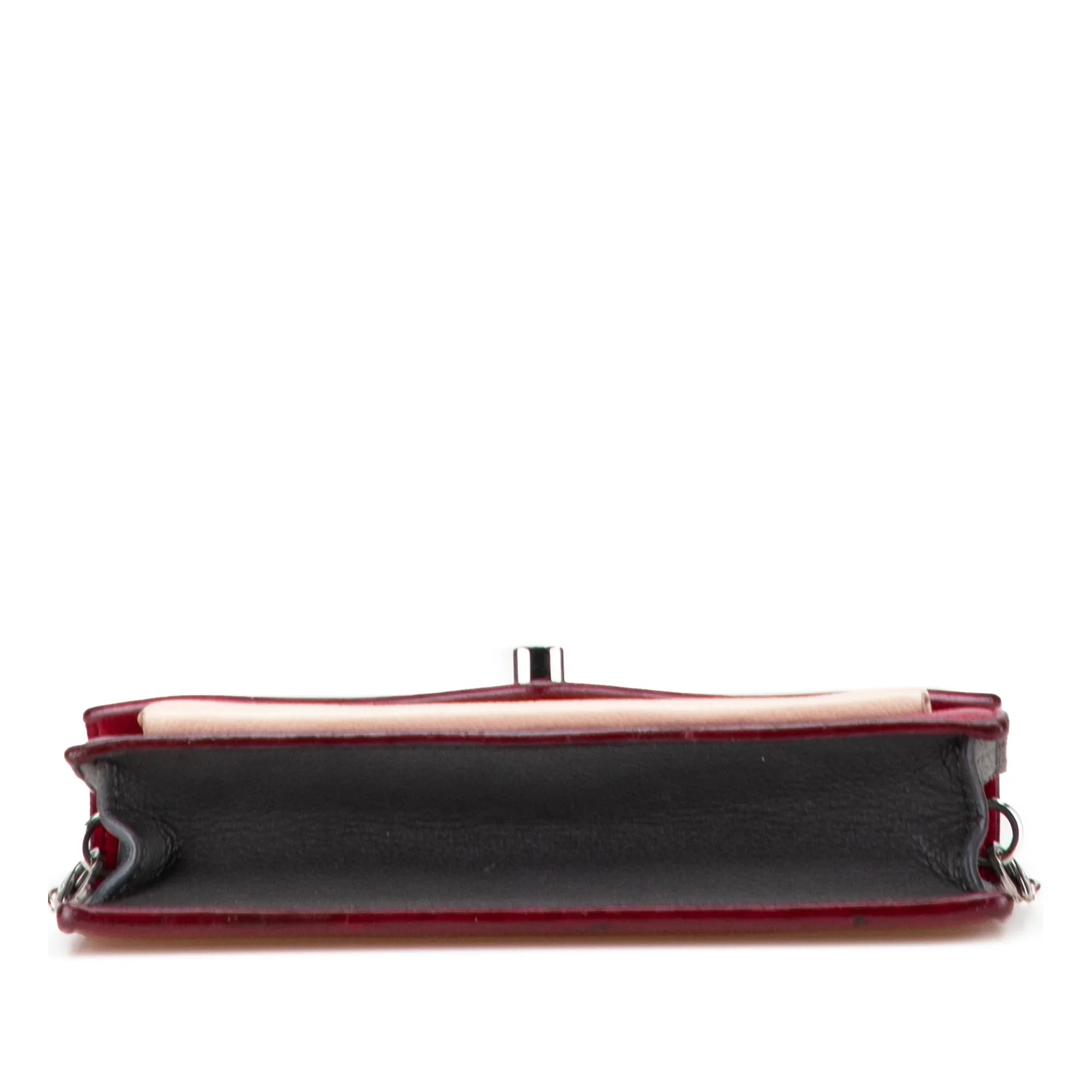 Product Details: Red Louis Vuitton Bicolor Leather MyLockMe Chain Pochette Crossbody Bag. The MyLockMe Pochette features a leather body, a detachable silver-tone chain shoulder strap, a front flap with twist lock closure, an exterior front slip pocket, an exterior back slip pocket, and interior zip and slip pockets. 4.7" L x 7.5" W x 1.4" D. Serial number UB3158.