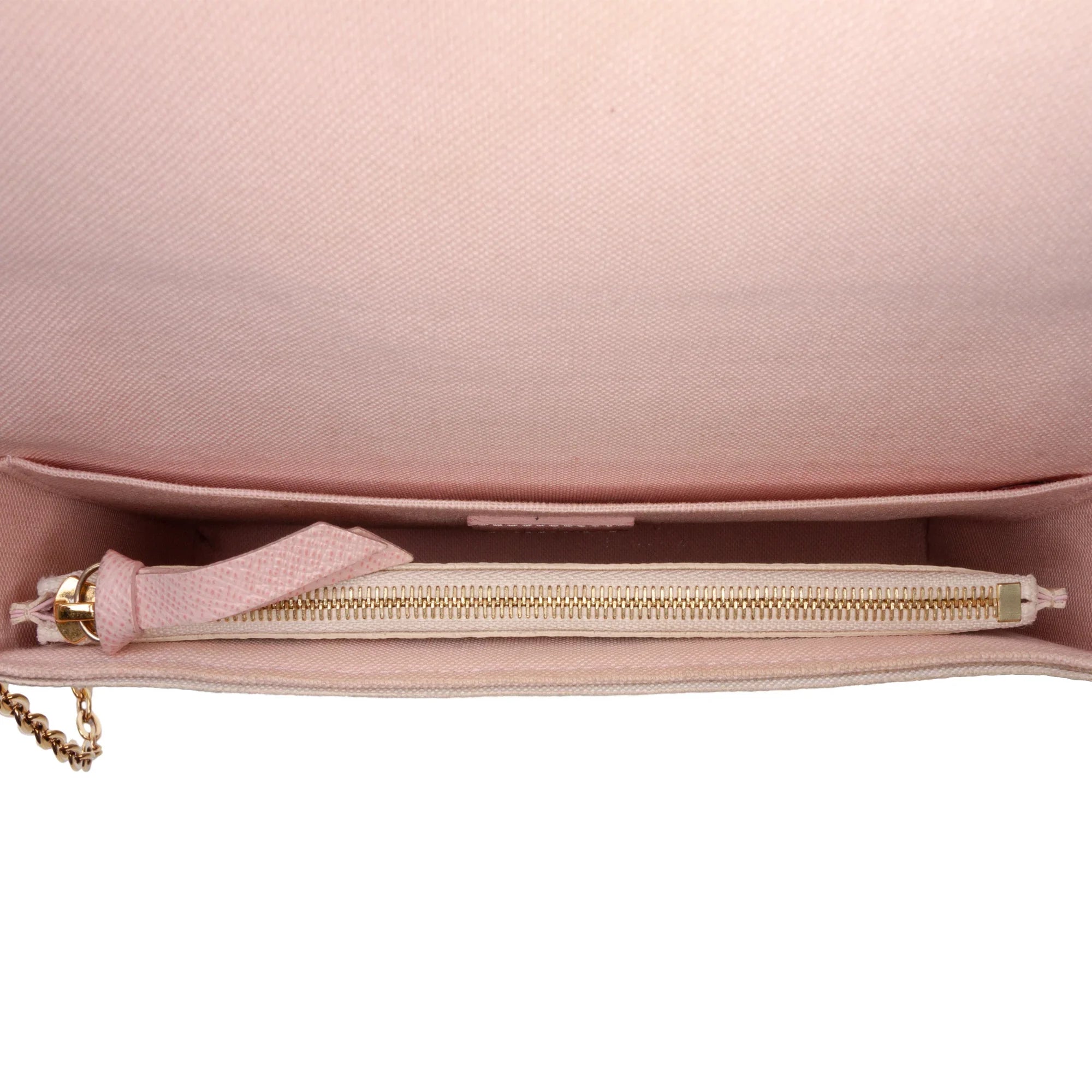 Product Details: White Louis Vuitton Damier Azur Pochette Felicie Crossbody Bag. The Pochette Felicie crossbody bag features a damier azur canvas body, a detachable gold-tone chain shoulder strap, a top flap with snap button closure, and an interior slip pocket. 4.5" L x 8.5" W x 1.2" D. Serial number MI2107.
