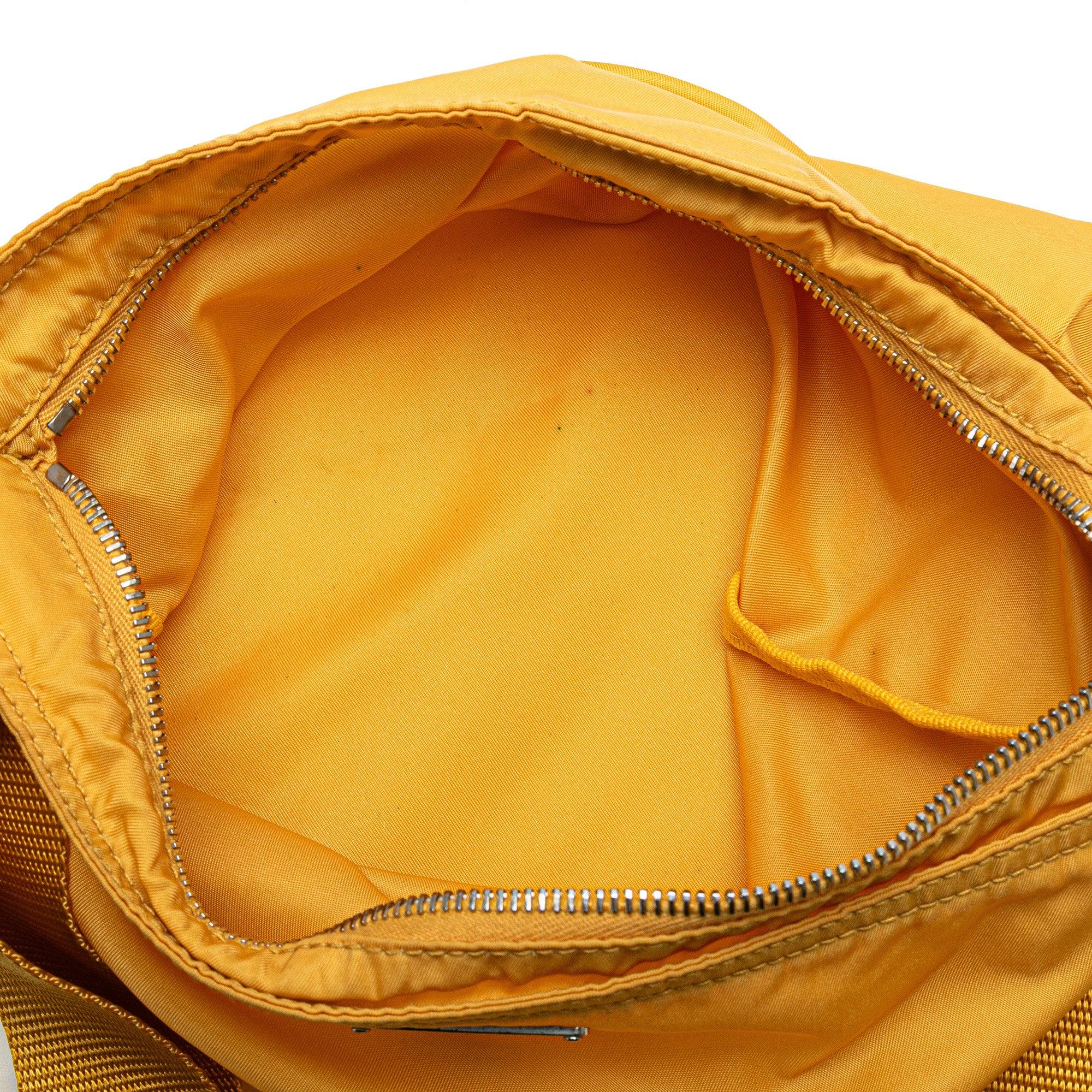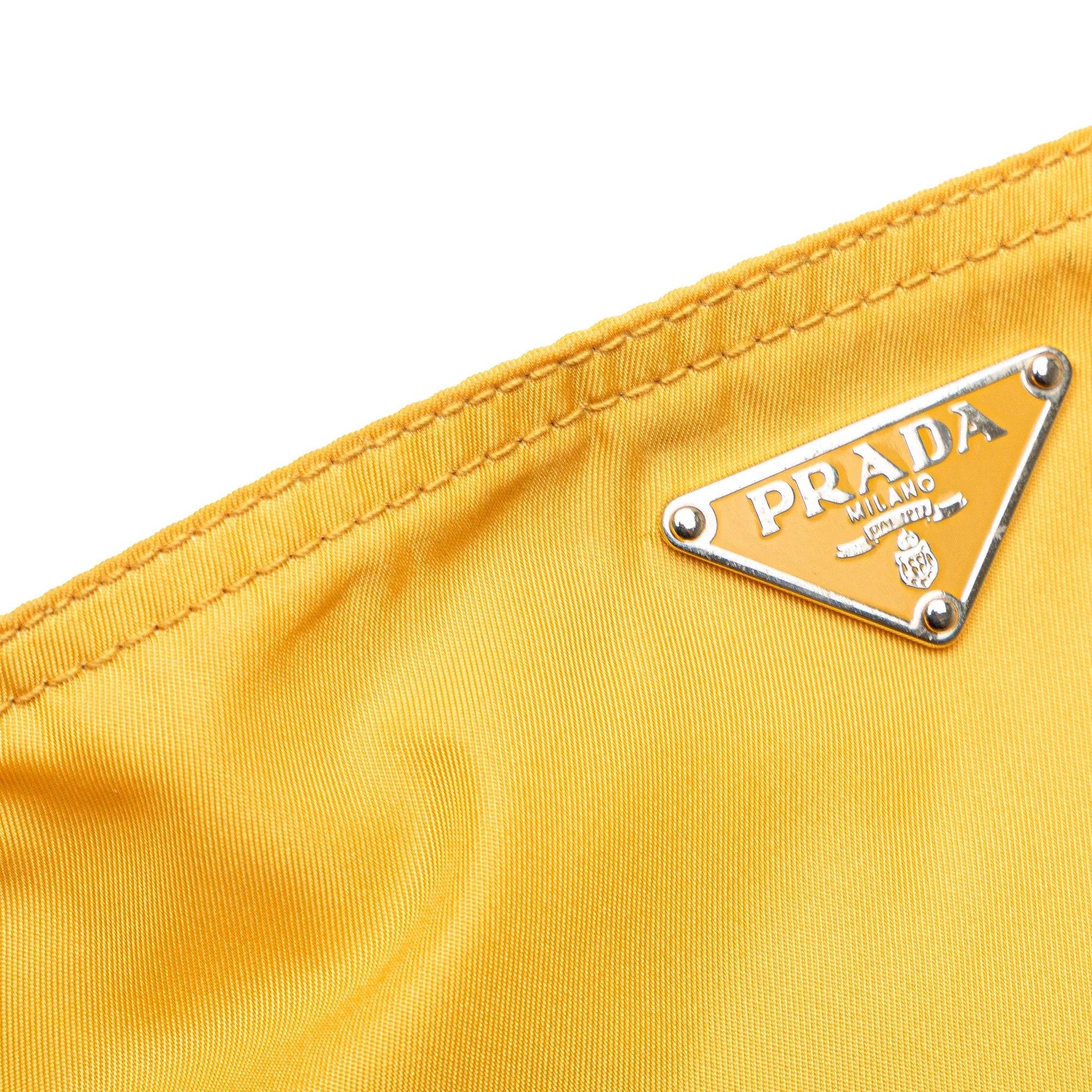 Product Details: Yellow Prada Tessuto Zip Top Crossbody. This crossbody bag features a nylon body, an adjustable flat shoulder strap, and a top zip closure. 10.2" L x 11.4" W x 0.2" D.