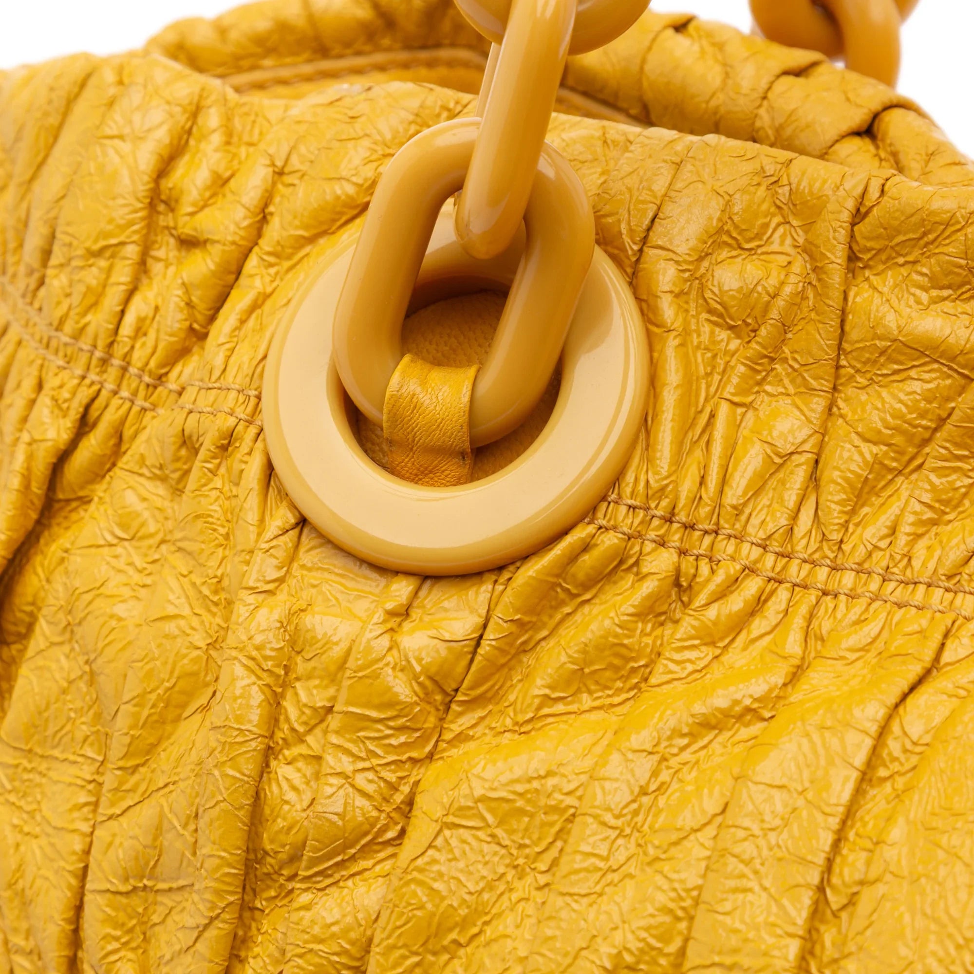 Product Details: Yellow Prada Vernice Gaufre Chain Tote. This tote bag features a gathered patent leather body, chain link handles, an open top with magnetic snap closure, and interior zip pockets. 13" L x 13.4" W x 5.5" D, 9.1" drop.