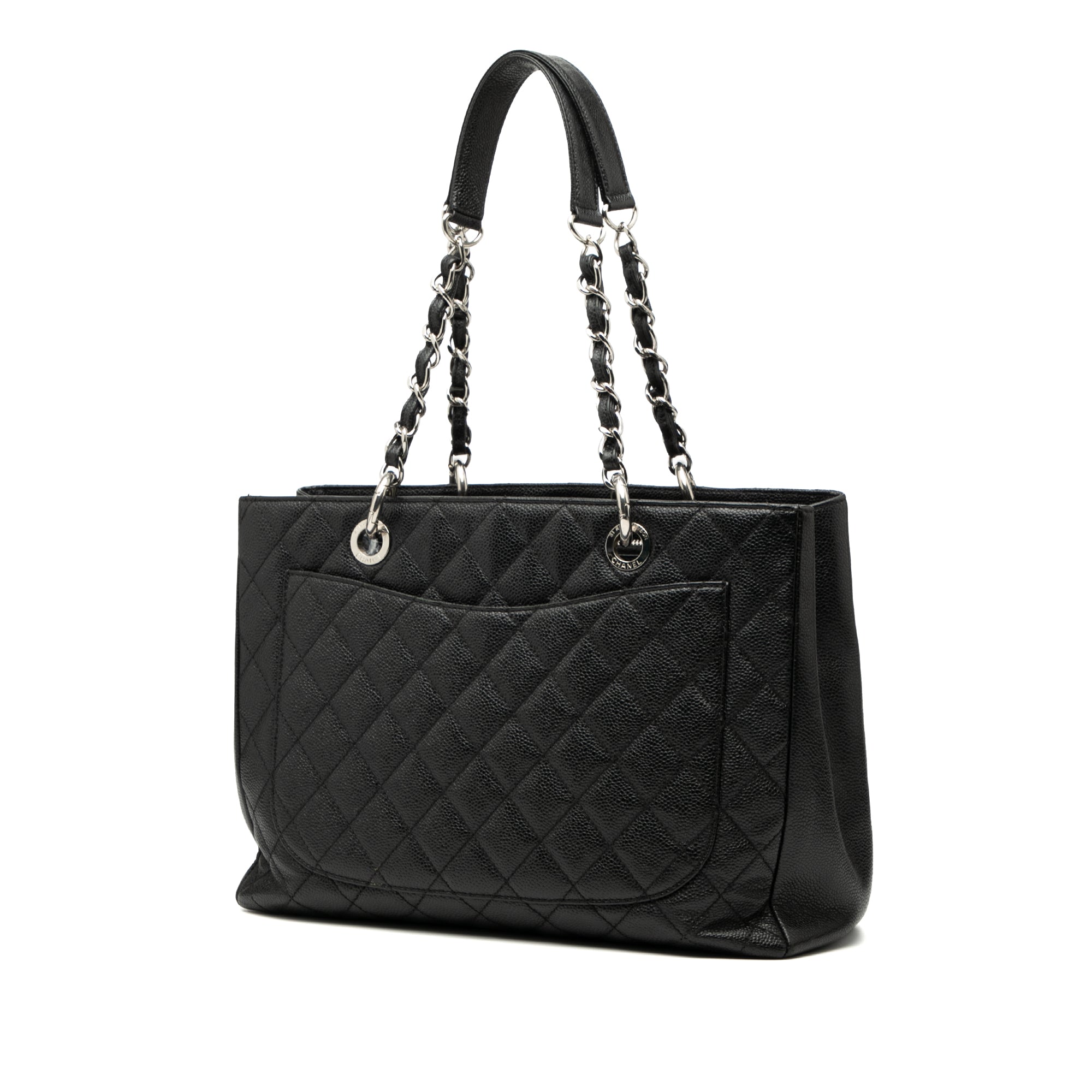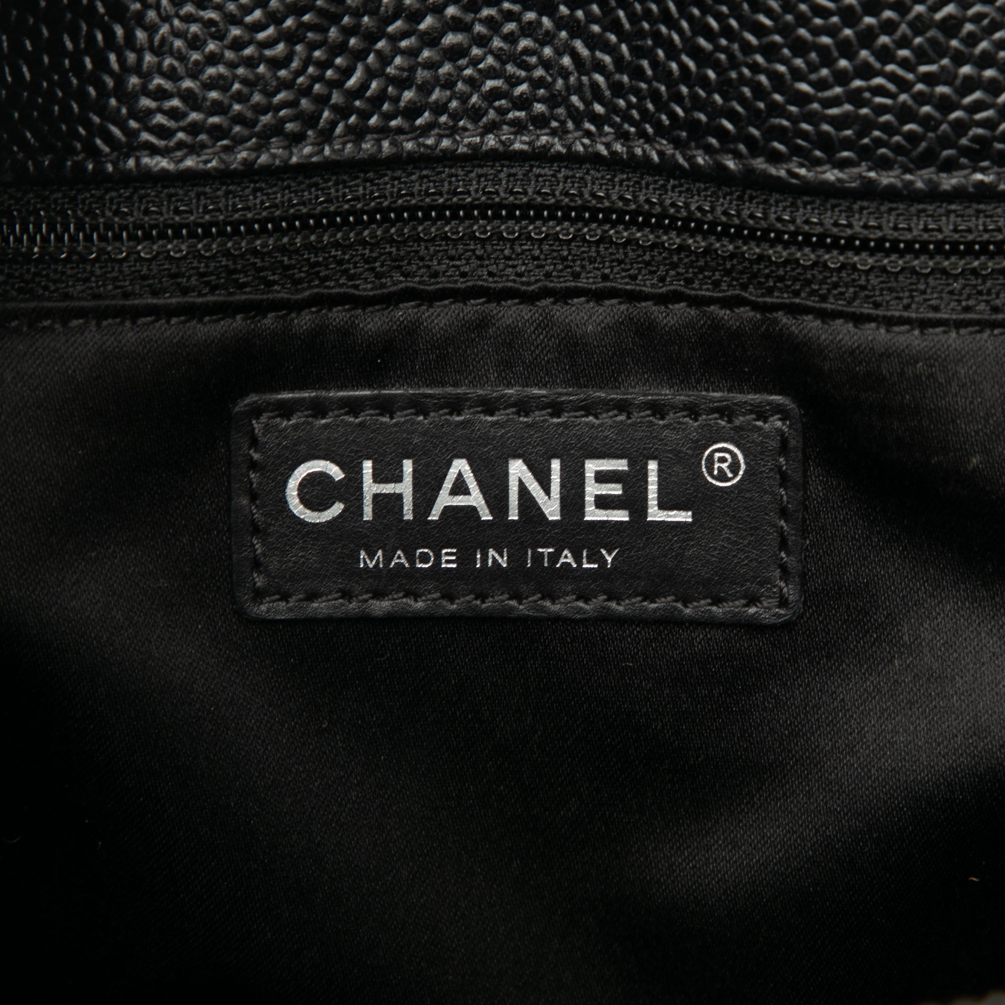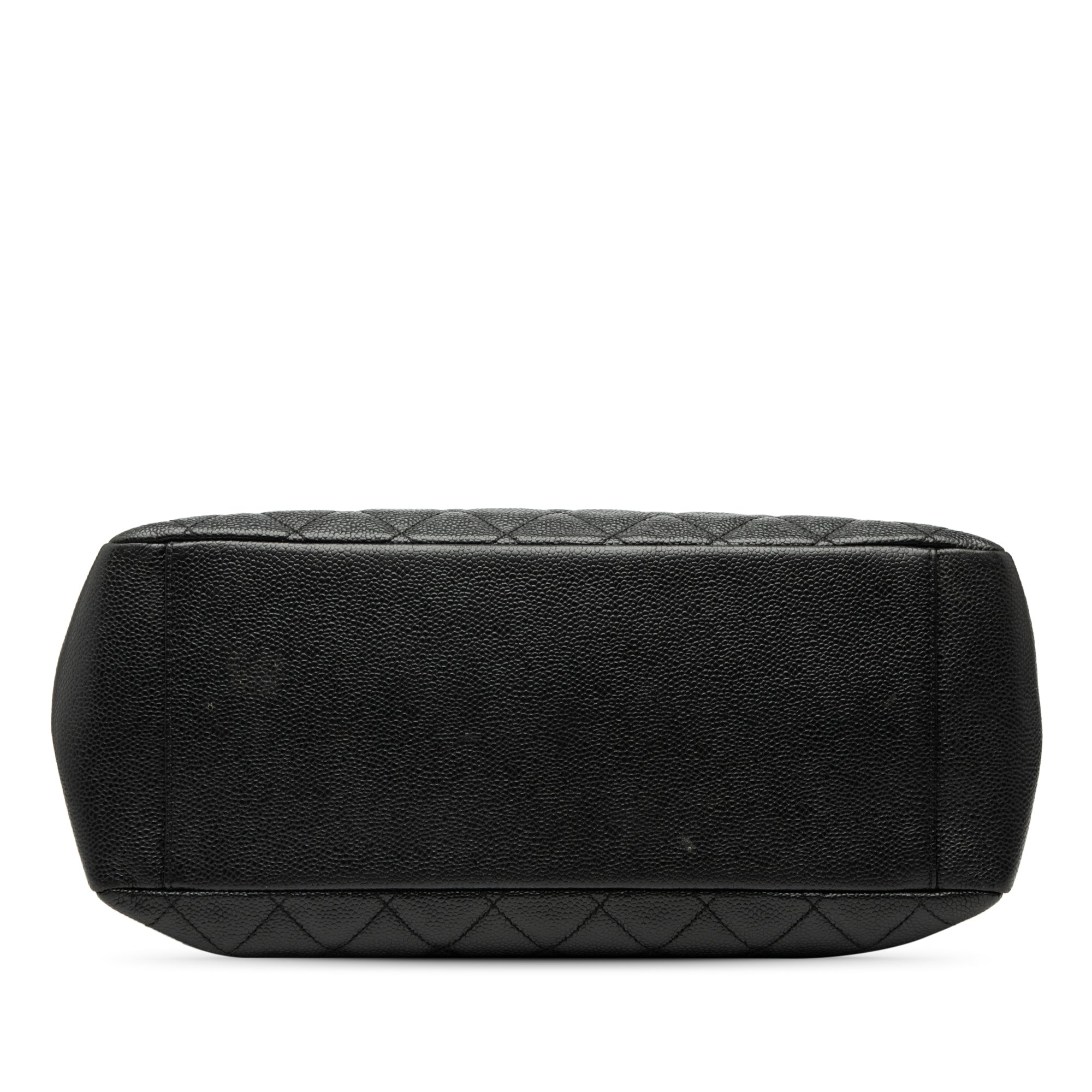 Product Details: Black Chanel Caviar Grand Shopping Tote. The Grand Shopping Tote features a quilted Caviar leather body, leather woven chain shoulder straps with leather guard, an open top, an exterior back slip pocket, and interior zip and slip pockets, and interior zip compartment. 9.4" L x 13" W x 4.7" D. Serial number 18320356.