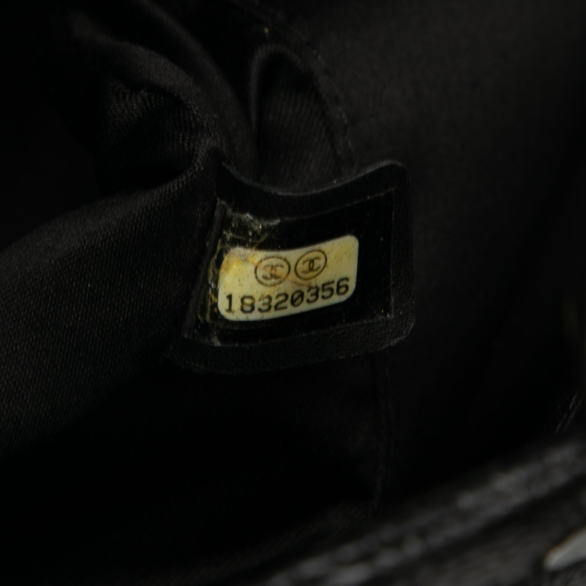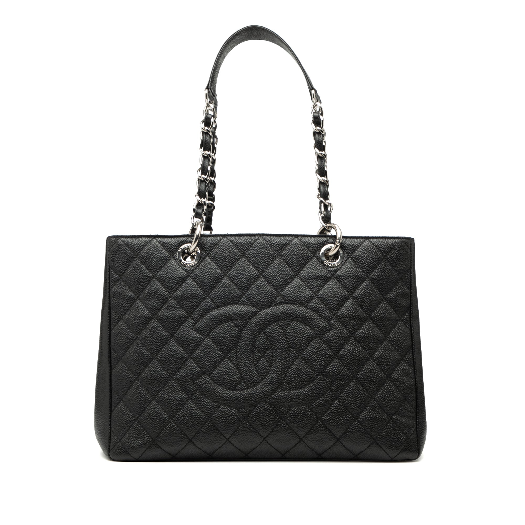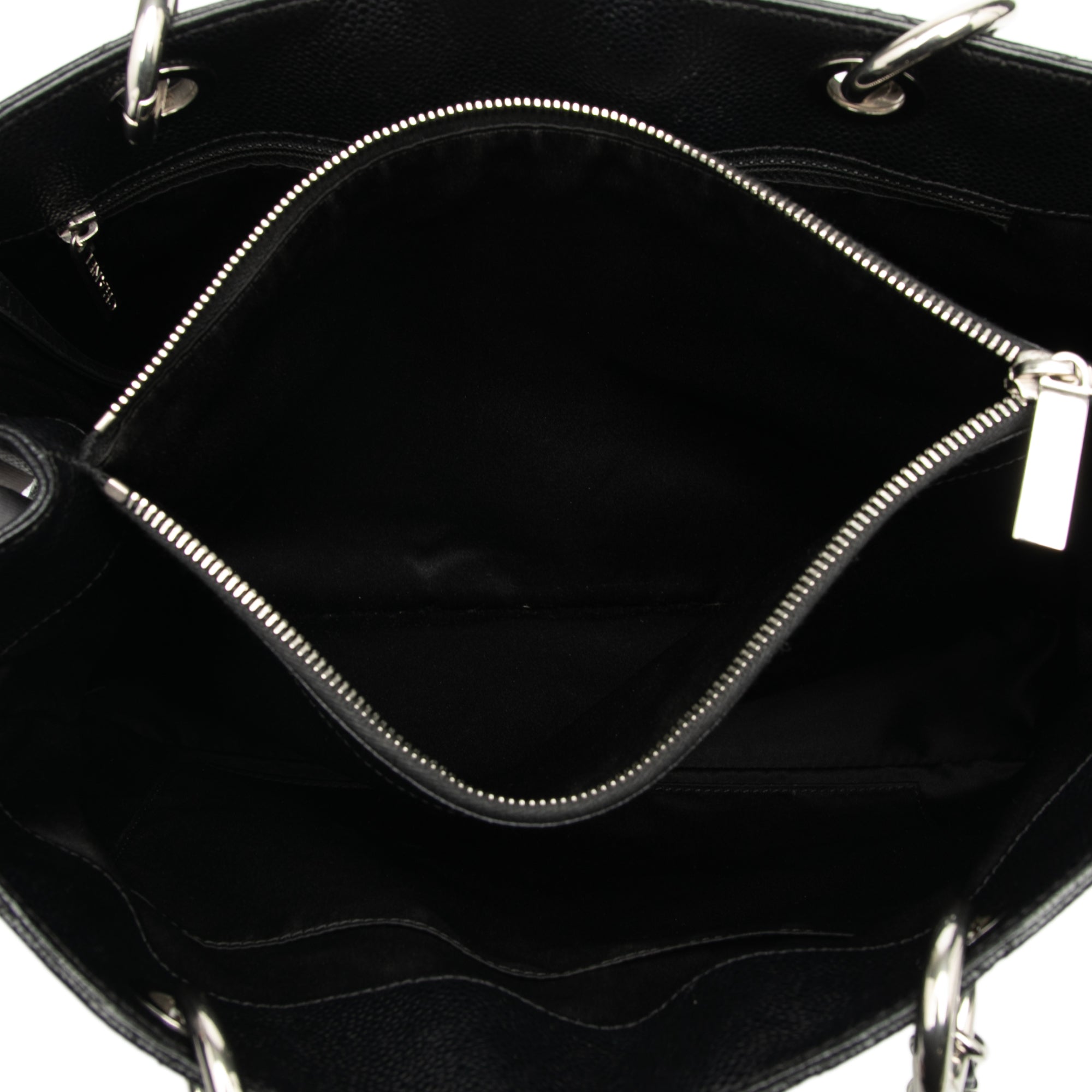 Product Details: Black Chanel Caviar Grand Shopping Tote. The Grand Shopping Tote features a quilted Caviar leather body, leather woven chain shoulder straps with leather guard, an open top, an exterior back slip pocket, and interior zip and slip pockets, and interior zip compartment. 9.4" L x 13" W x 4.7" D. Serial number 18320356.