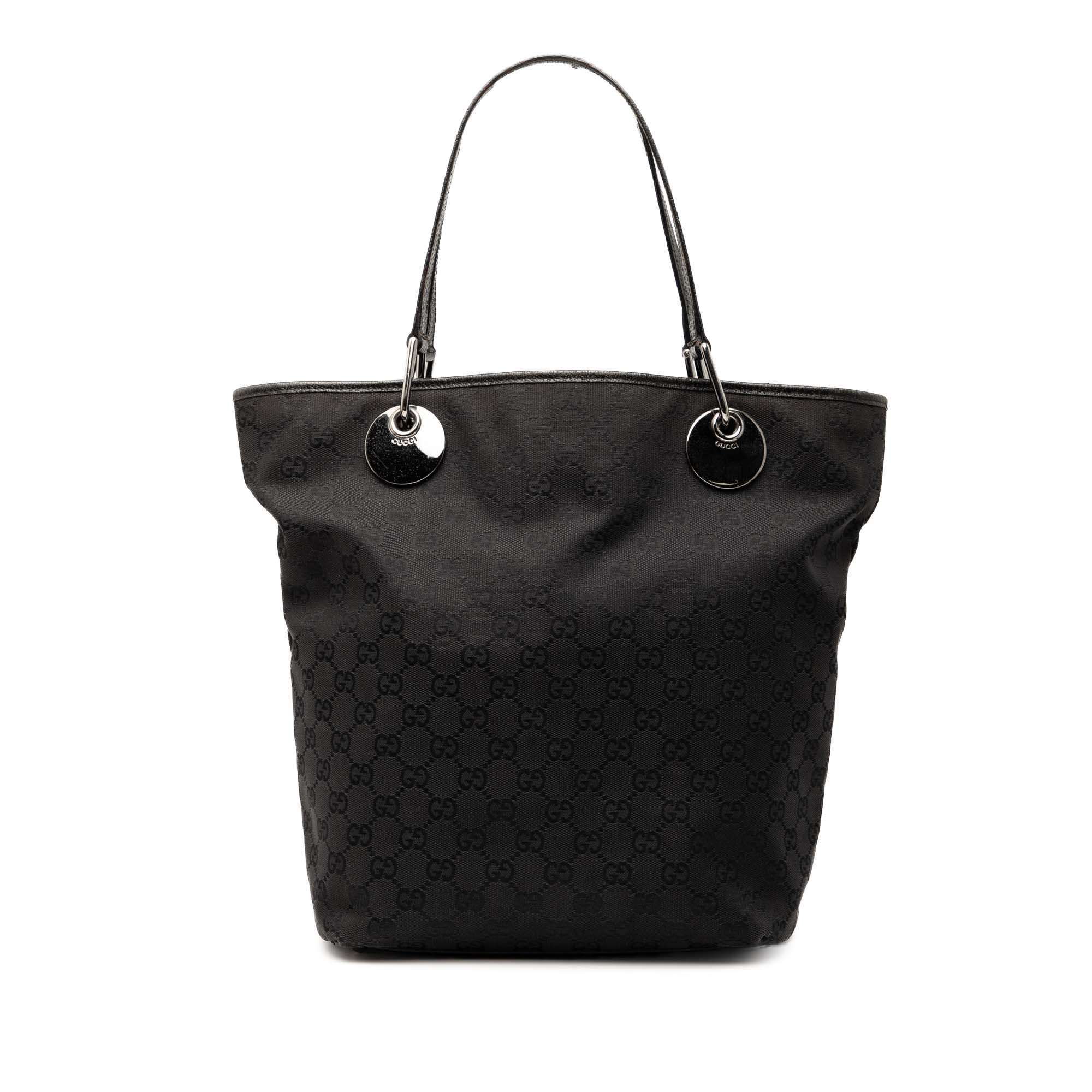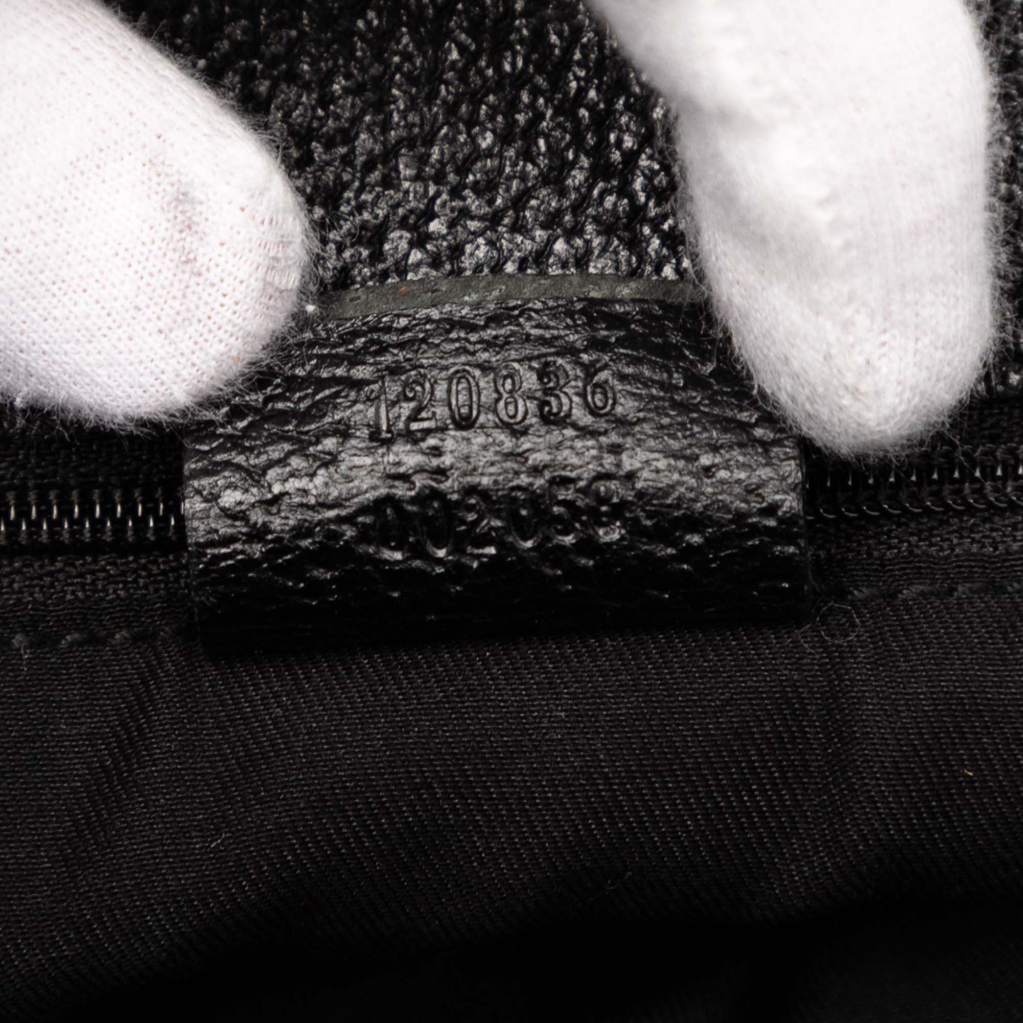 Product Details: Black Gucci GG Canvas Eclipse Tote. The Eclipse tote bag features a canvas body with leather trim, flat leather straps, an open top, and interior zip and slip pockets. 11.8" L x 9.4" W x 4.3" D. Serial number 120836 002058.