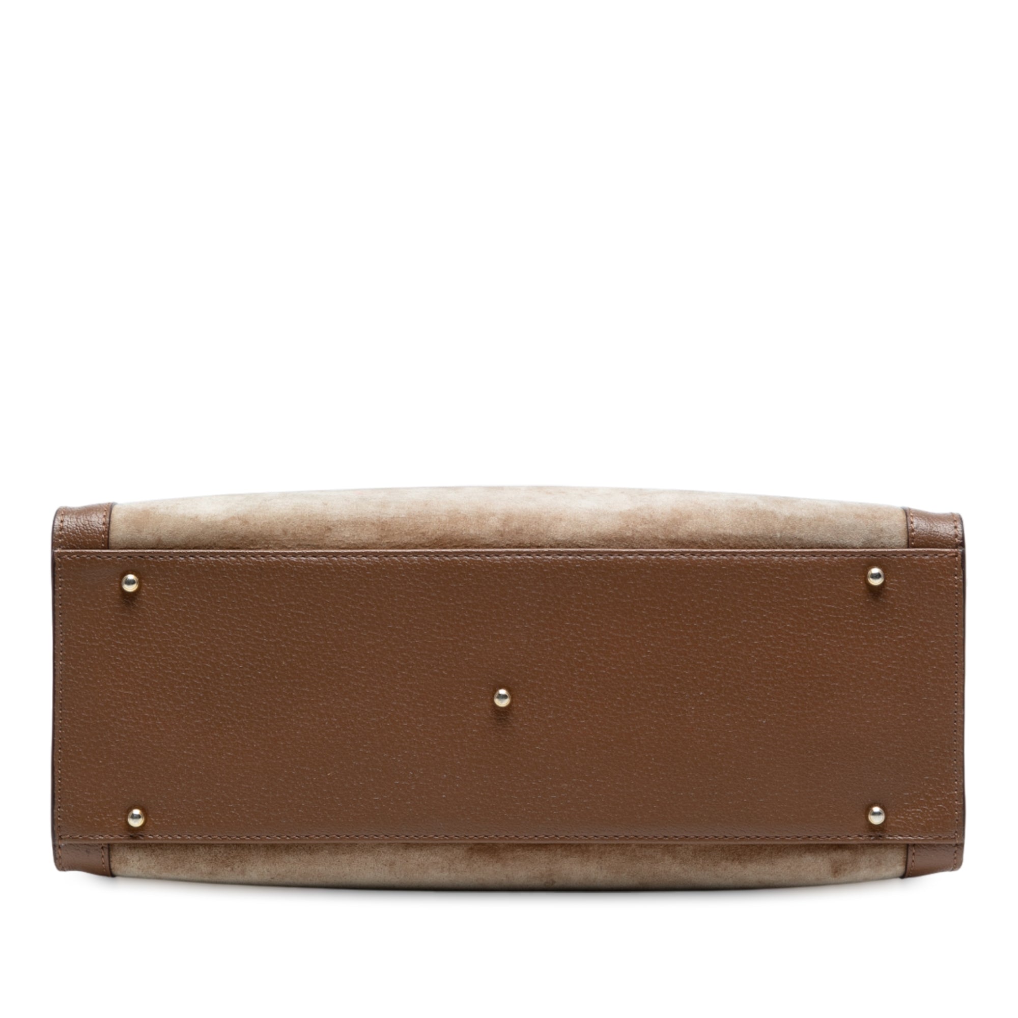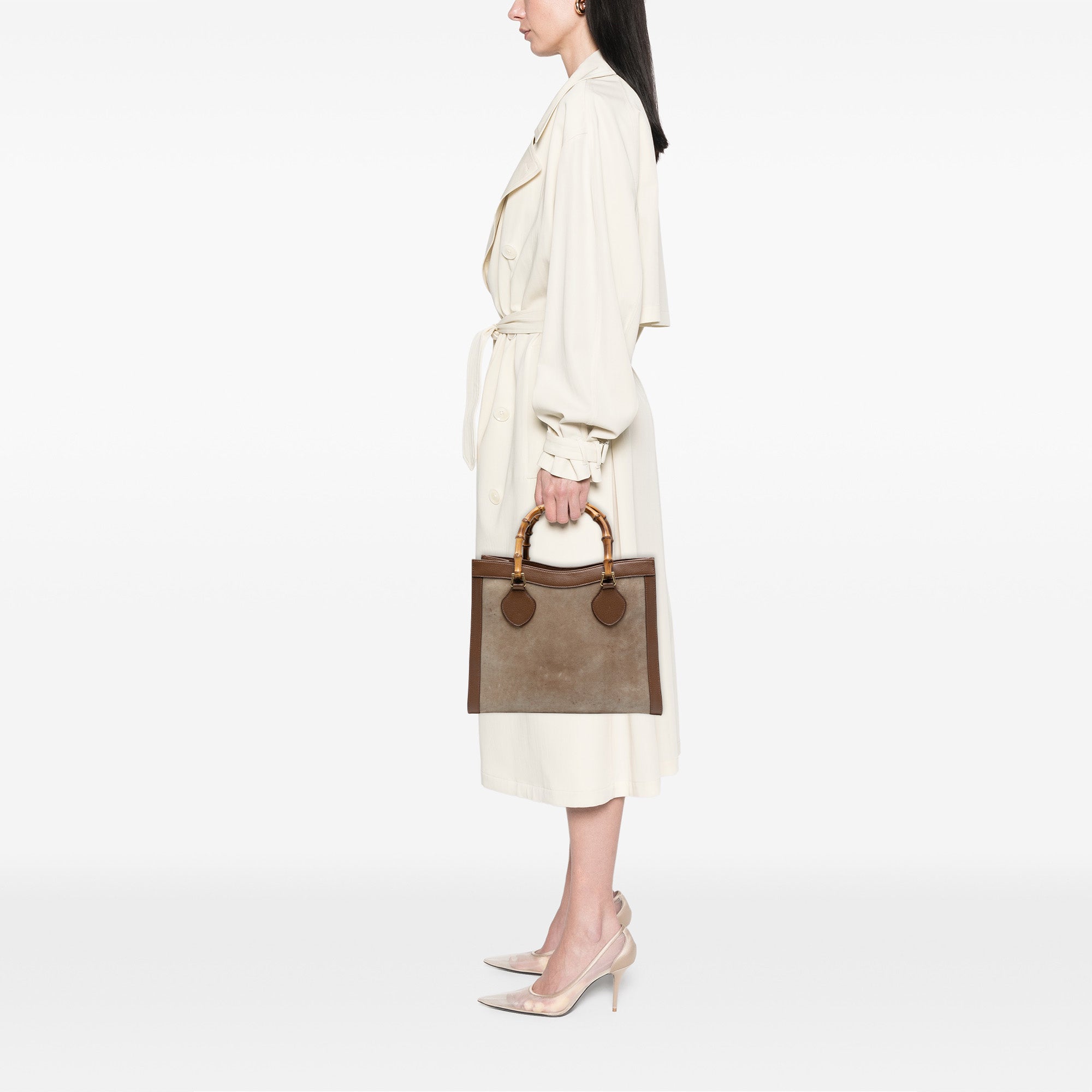 Product Details: Brown Gucci Medium Suede Bamboo Diana Tote. The Diana tote bag features a suede body with calf leather trim, bamboo top handles, an open top with magnetic snap closure, an interior zip compartment, and an interior zip pocket. The handles were repainted. 10.4" L x 13.8" W x 4.3" D, 5.1" drop. Serial number 002 1095 0260.