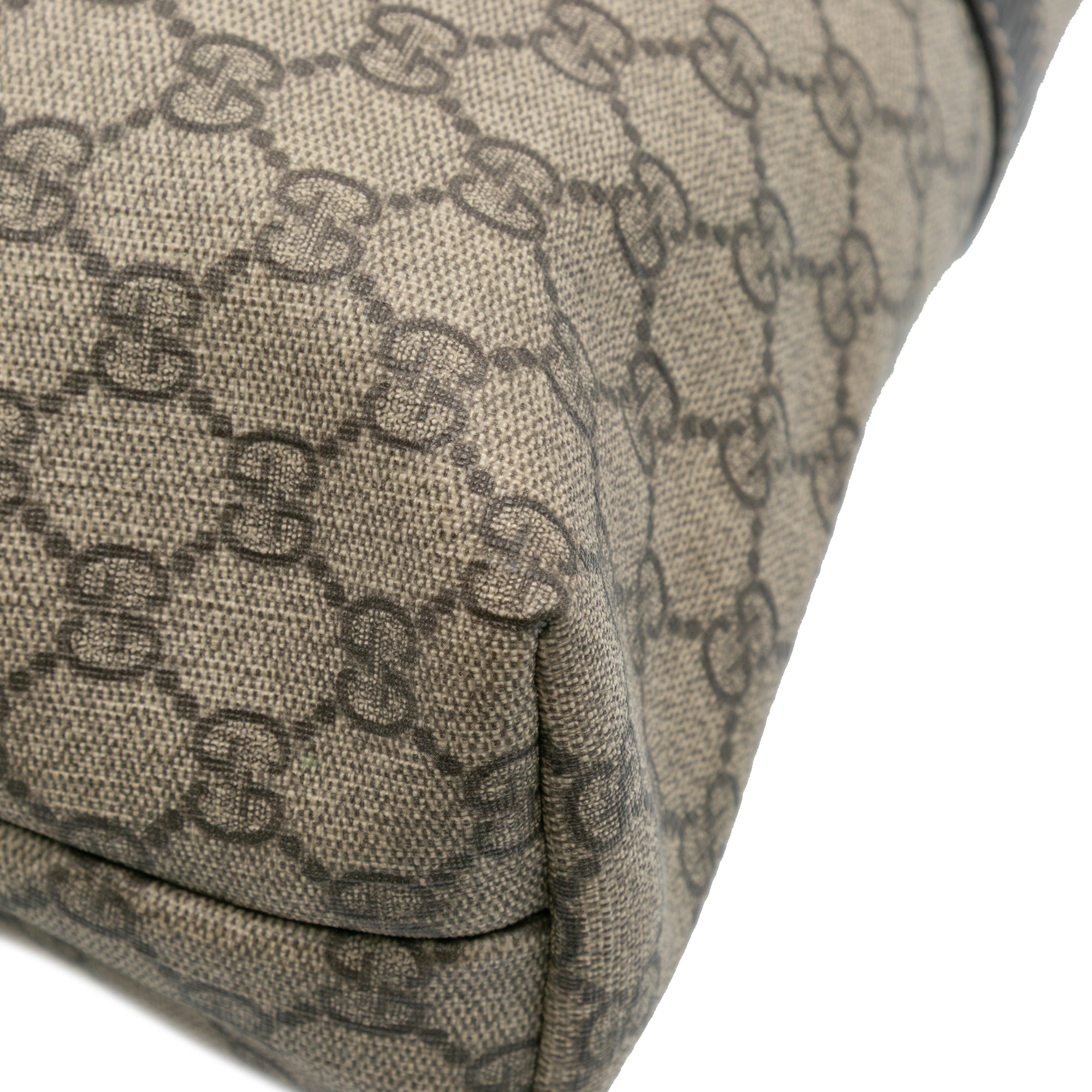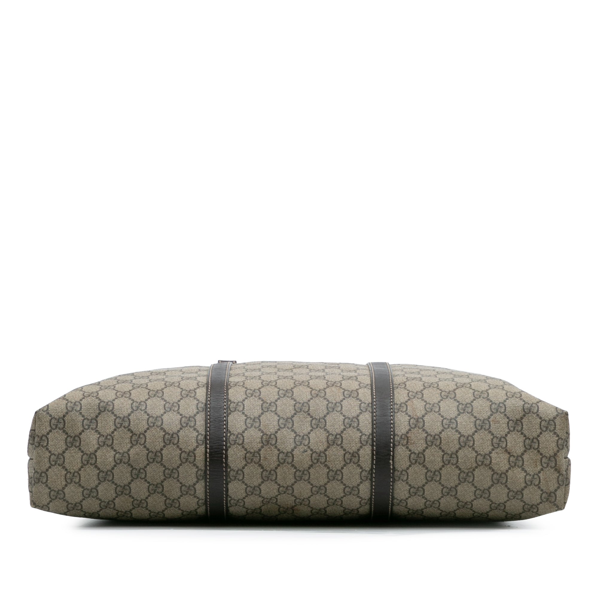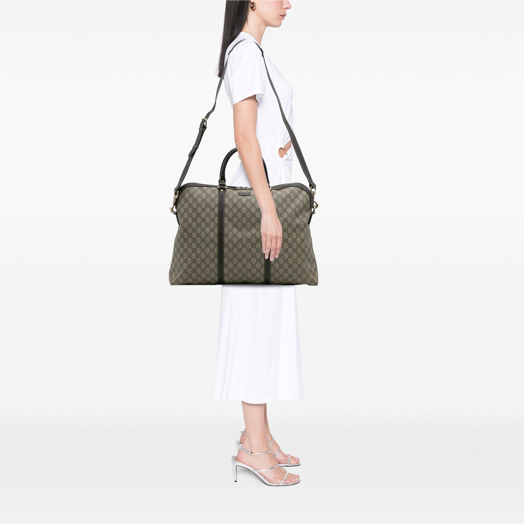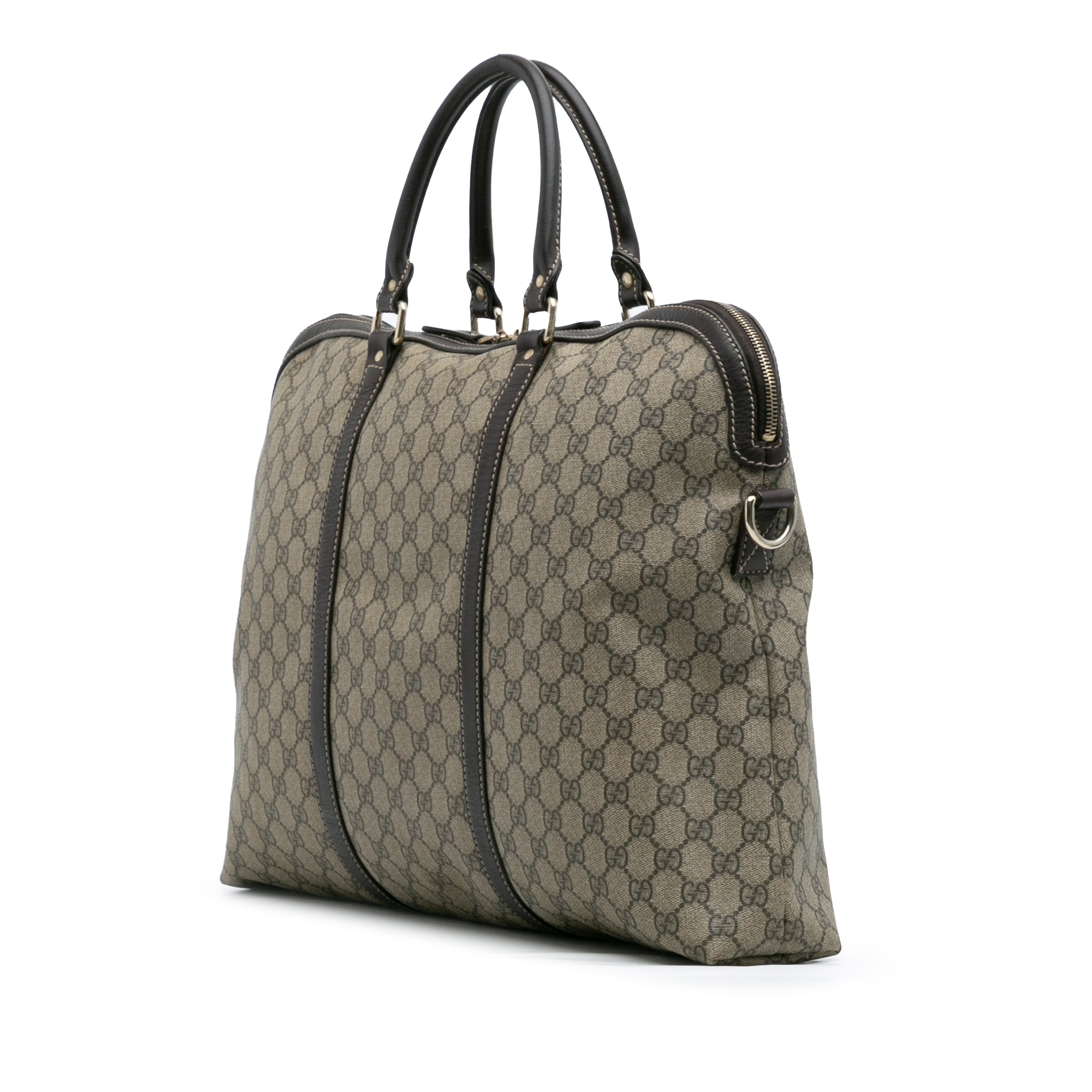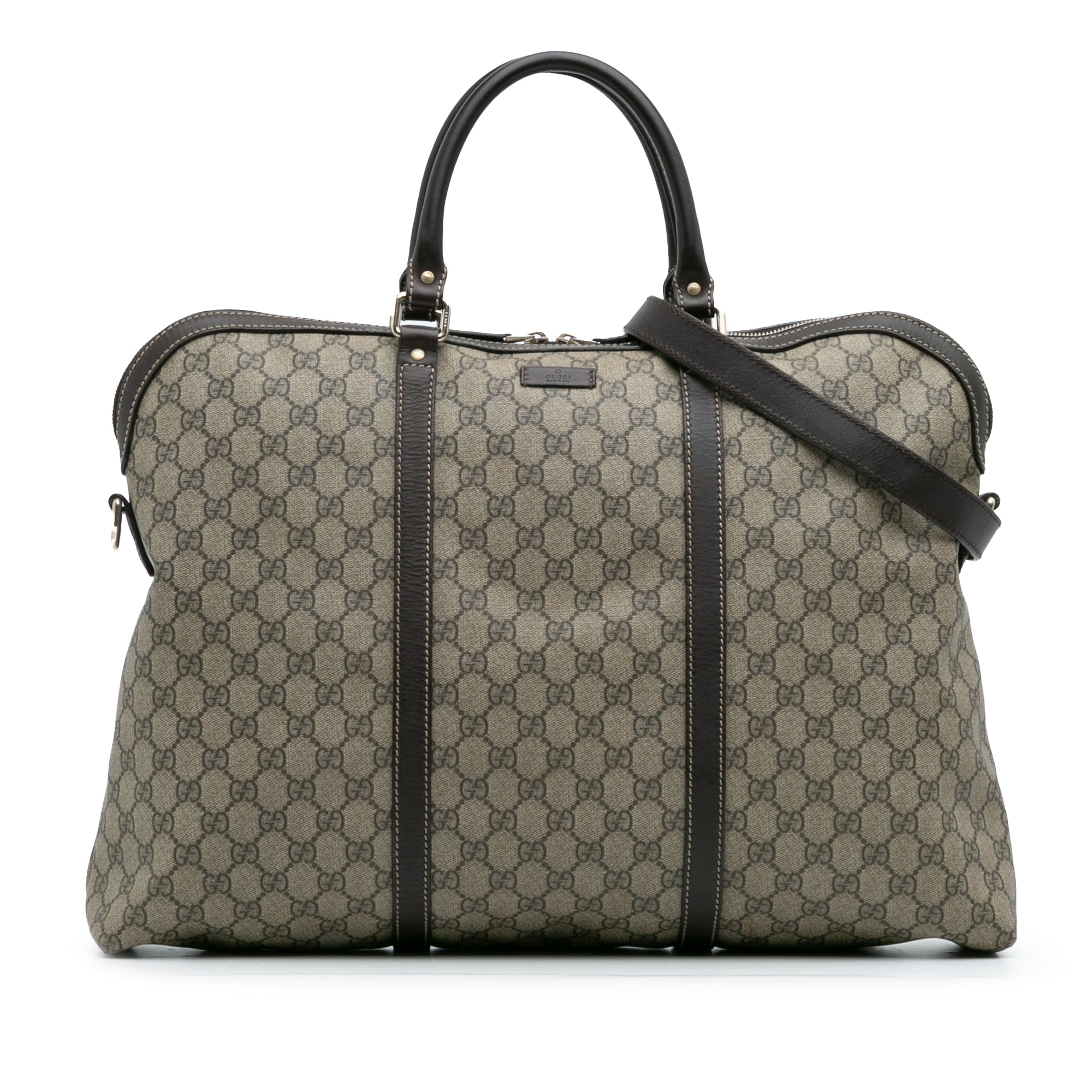 Product Details: Brown Gucci GG Supreme Travel Bag. This travel bag features a coated canvas body with leather trim, rolled leather handles, an adjustable and detachable flat leather strap, a top zip closure, and an interior zip pocket. 15.4" L x 20.1" W x 0.4" D, 4.7" drop. Serial number 223674 491404.
