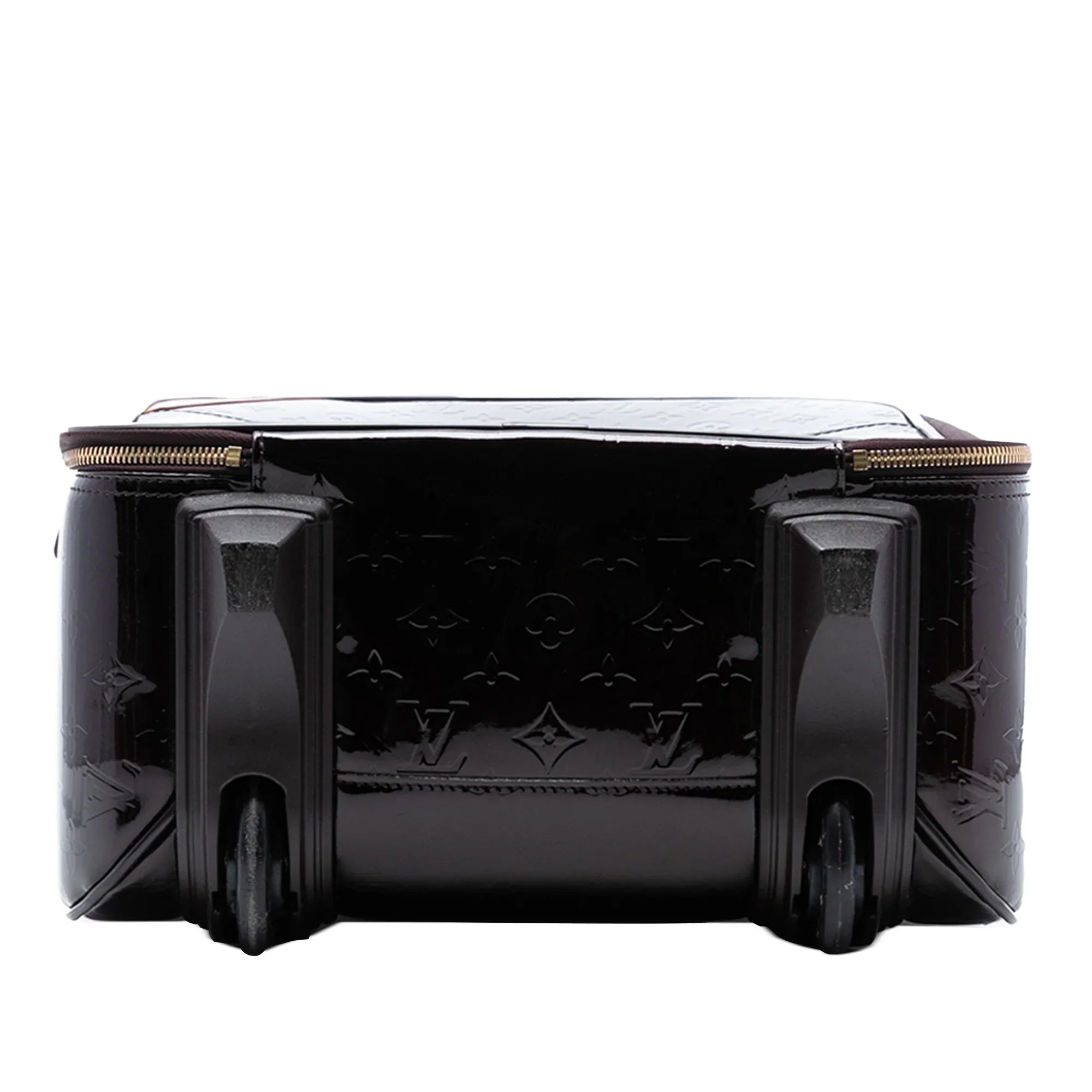 Product Details: Purple Louis Vuitton Monogram Vernis Pegase 45 Travel Bag. The Pegase 45 features a vernis leather body, a flat vachetta leather top handle, a retractable top handle, trolley wheels, a zip-around closure, an exterior front slip pocket, and interior zip pockets. 18.1" L x 13.6" W x 6.9" D, 1.6" drop. Serial number MB2017.