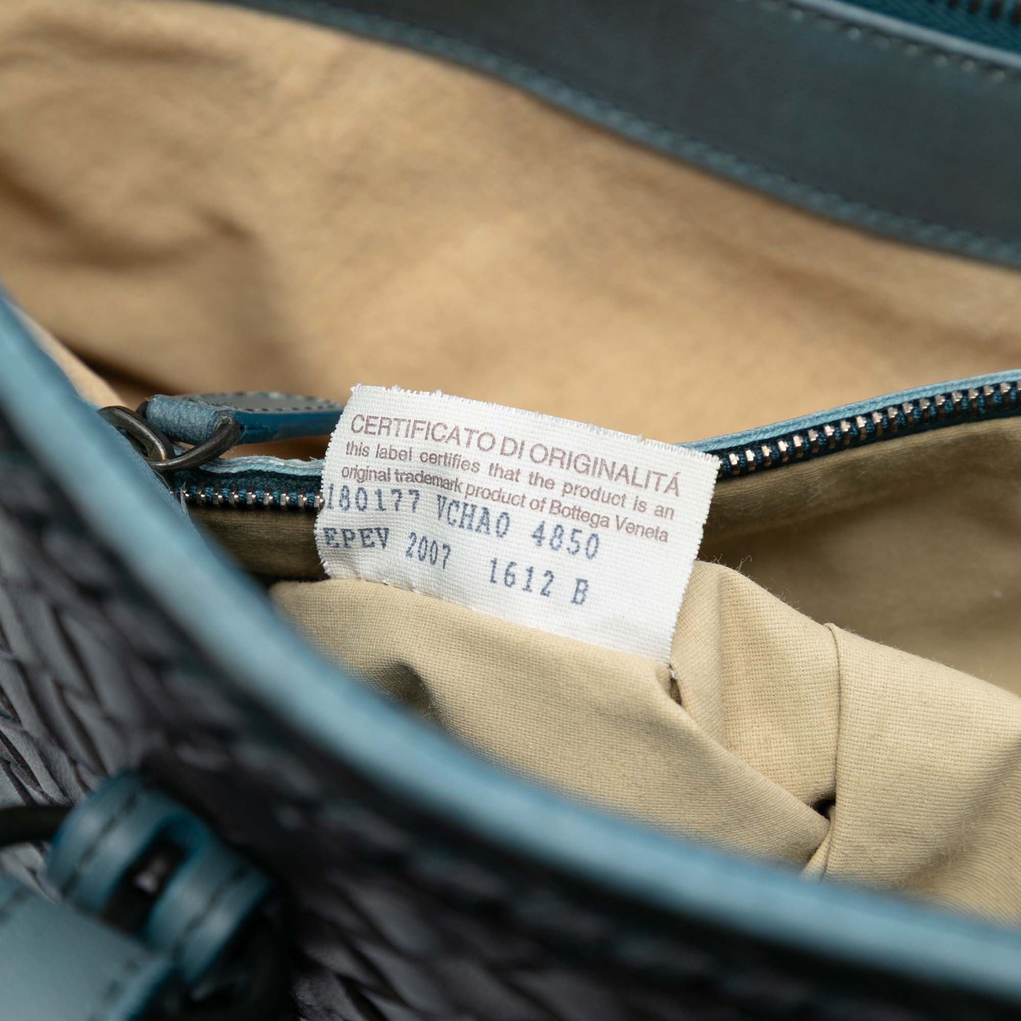 Product Details: Blue Bottega Veneta Ombre Nappa Intrecciato Tote. This tote bag features a woven nappa leather body, rolled leather straps, an open top, interior center zip compartment, and interior zip and slip pockets. 8.7" L x 15.7" W x 5.9" D. Serial number 180177 VCHA0 4850 EPEV 2007 1612 B.