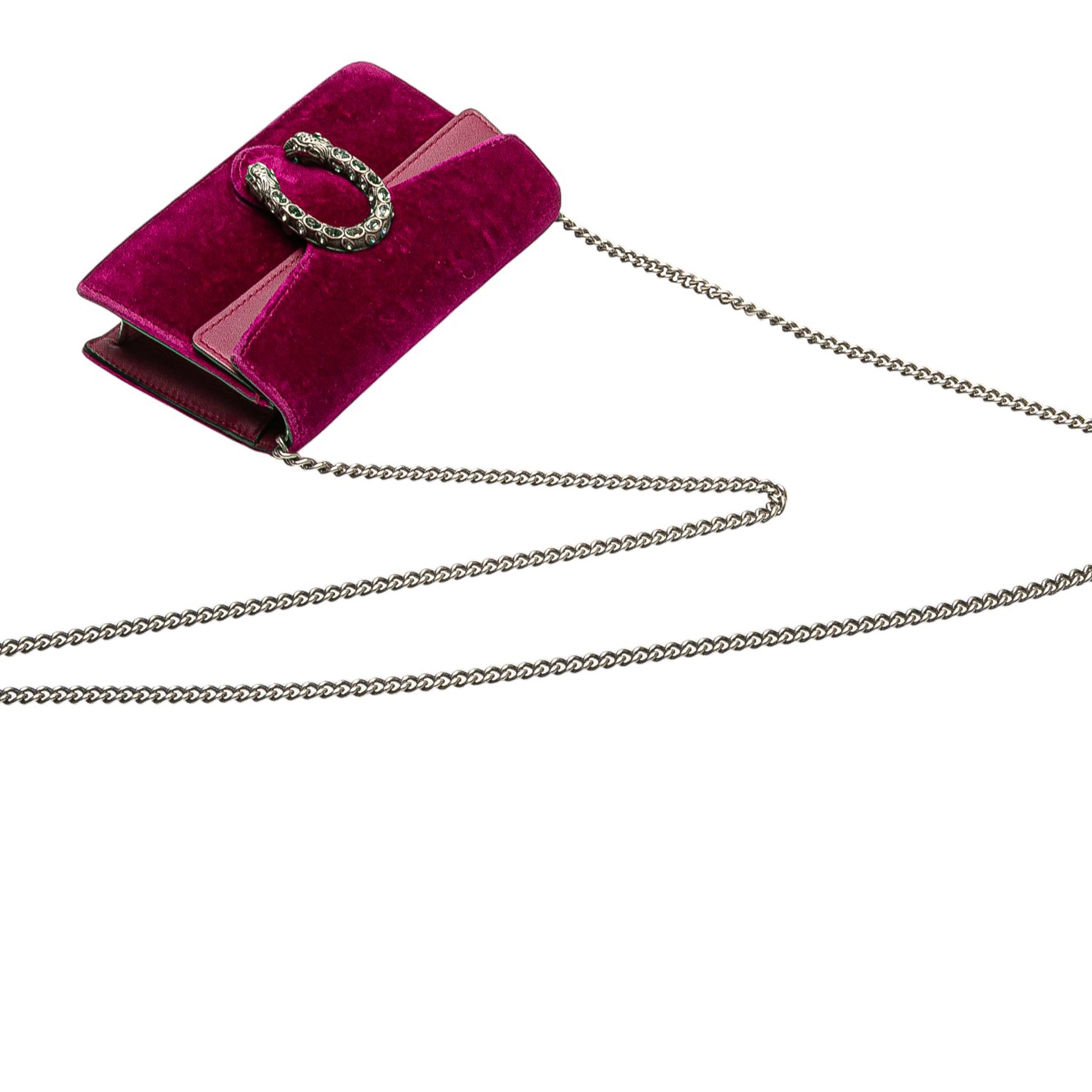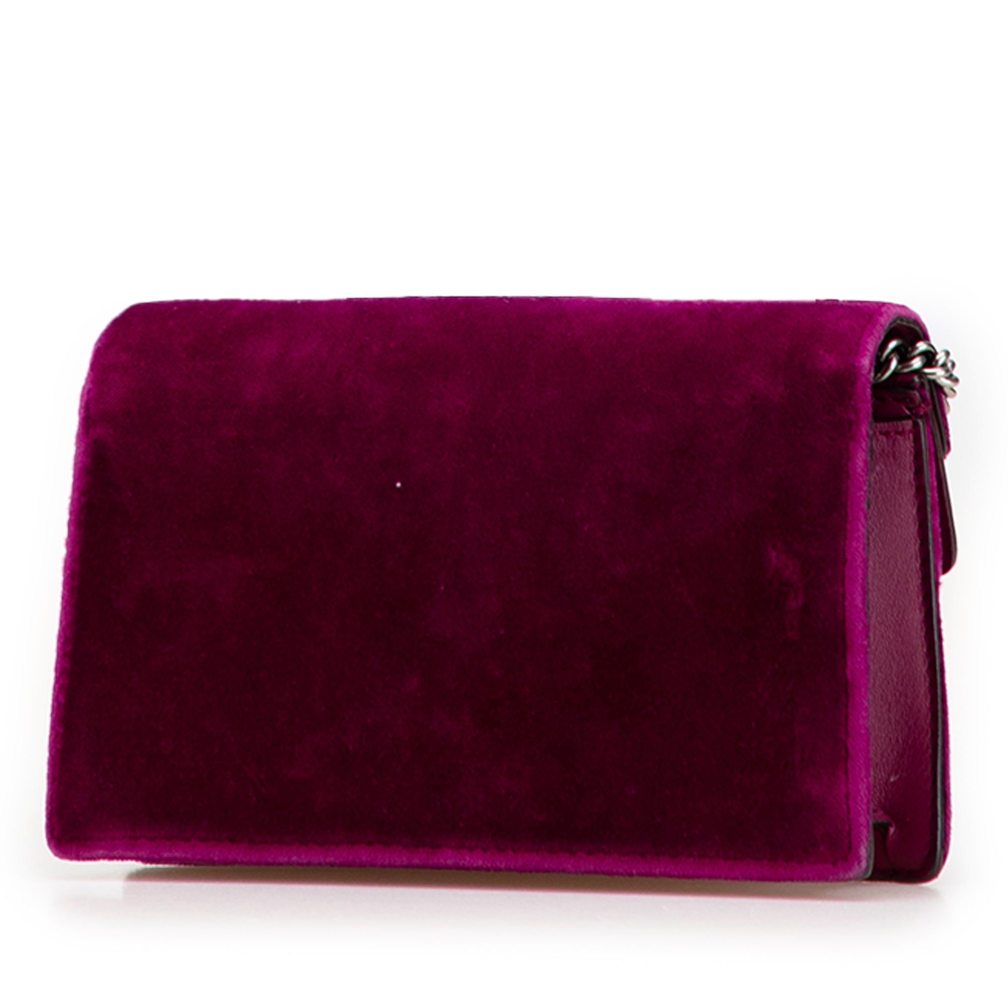 Product Details: Purple Gucci Mini Velvet Dionysus Crossbody. The Dionysus features a velvet body with leather trim, a chain link strap, and a top flap with snap closure. 3.5" L x 6.3" W x 1.4" D. Serial number 476432 496334.