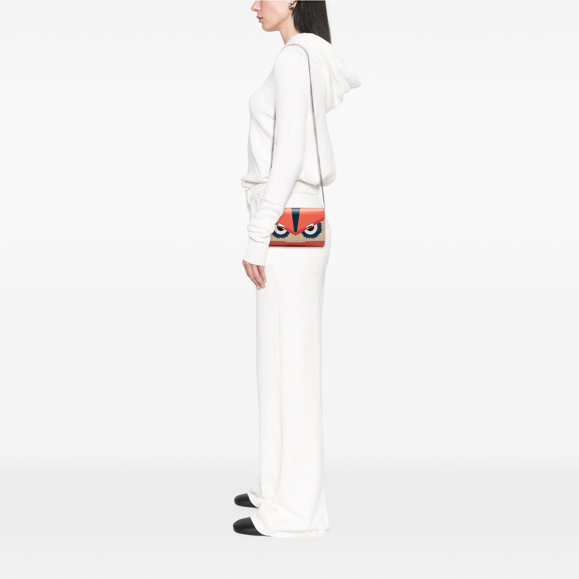 Product Details: Orange Fendi Vitello Elite Crystal Eye Monster Continental Wallet on Chain Crossbody Bag. The Monster crossbody bag features a leather body, a silver-tone curb chain link strap, a front flap with magnetic snap closure, an interior zip compartment, and an interior slip pockets. 4.7" L x 7.5" W x 1.4" D. Serial number 8M0346.