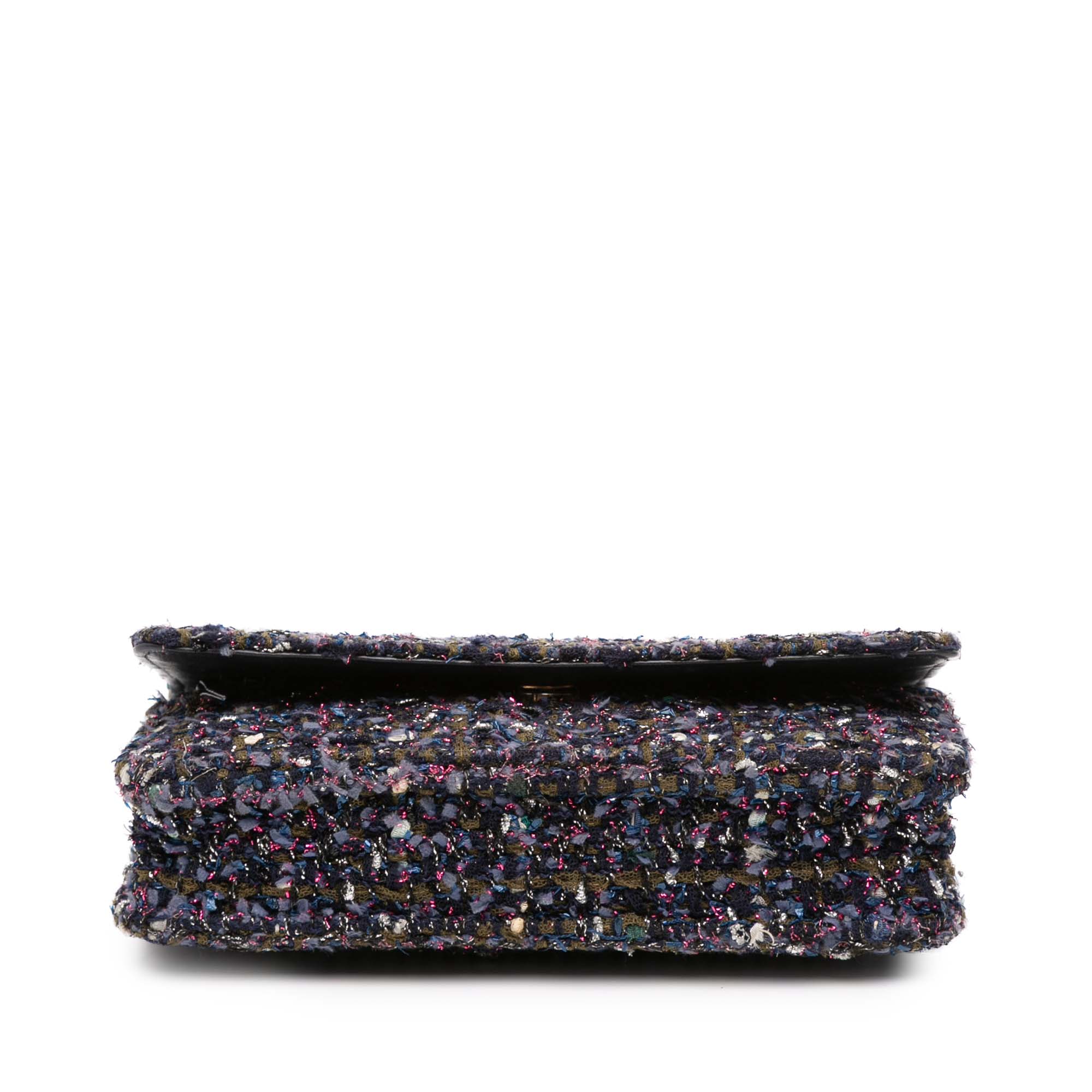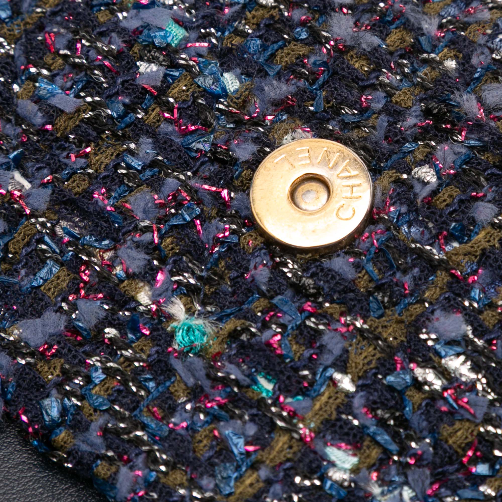 Product Details: Blue Chanel CC Tweed Charms Wallet On Chain Crossbody Bag. This wallet on chain features a tweed body, a leather-woven chain link strap, a flap with snap closure, an interior zip compartment, and interior zip and slip pockets. 5.1" L x 7.5" W x 1.6" D. Serial number 26712354.
