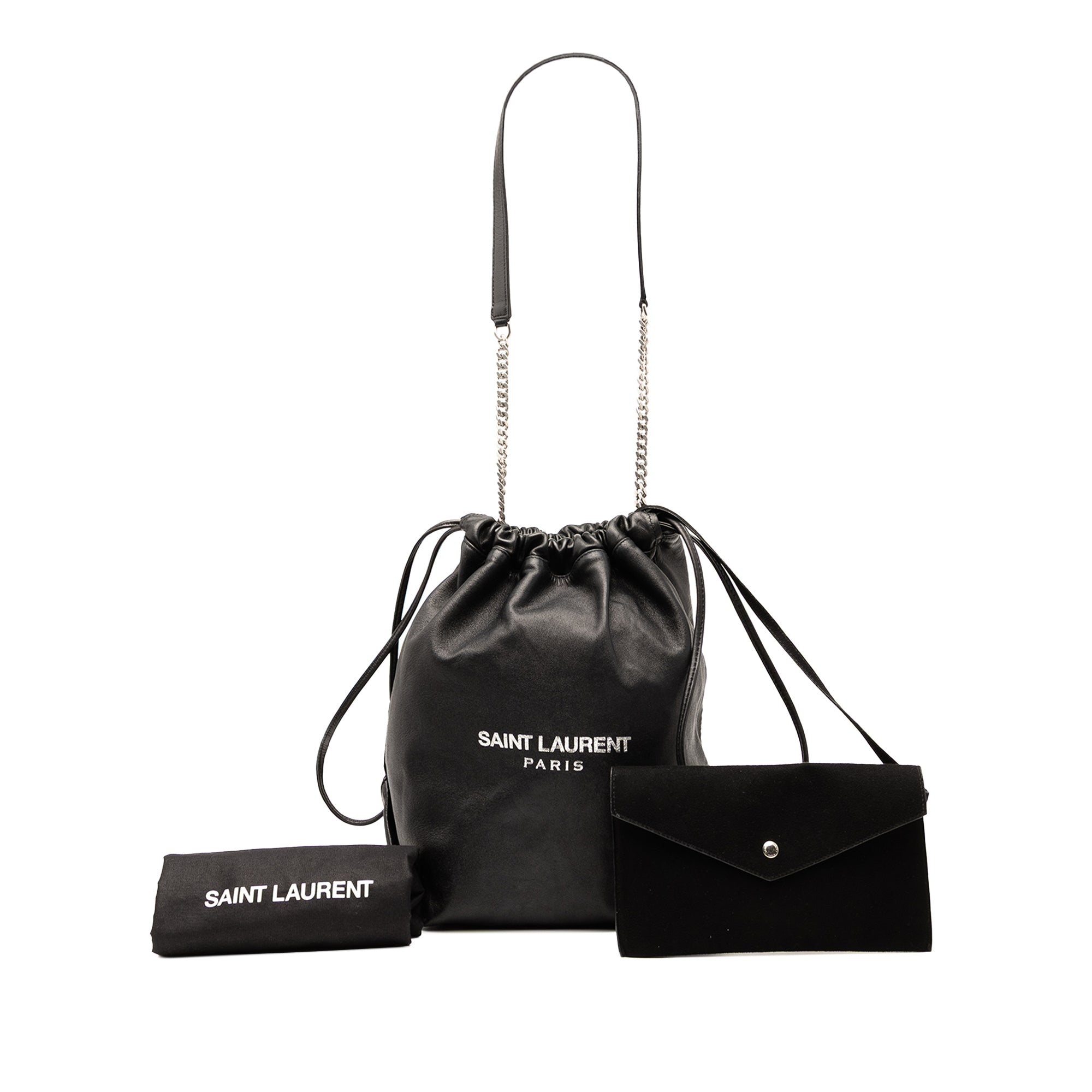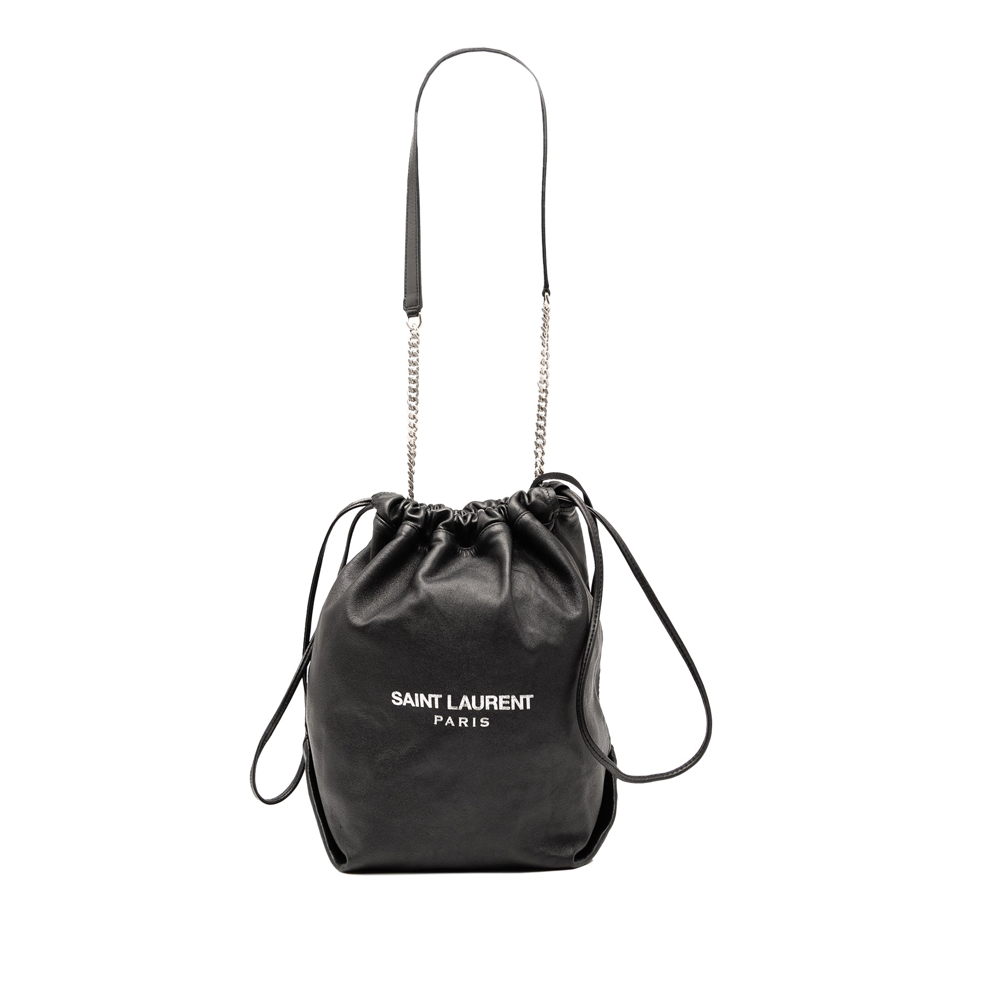 Product Details: Black Saint Laurent Small Lambskin Teddy Bucket Bag. The Teddy features a leather body, a flat leather and chain shoulder strap, and an open top with drawstring closure. 12.2" L x 7.9" W x 7.1" D. Serial number PMR538447.0718.